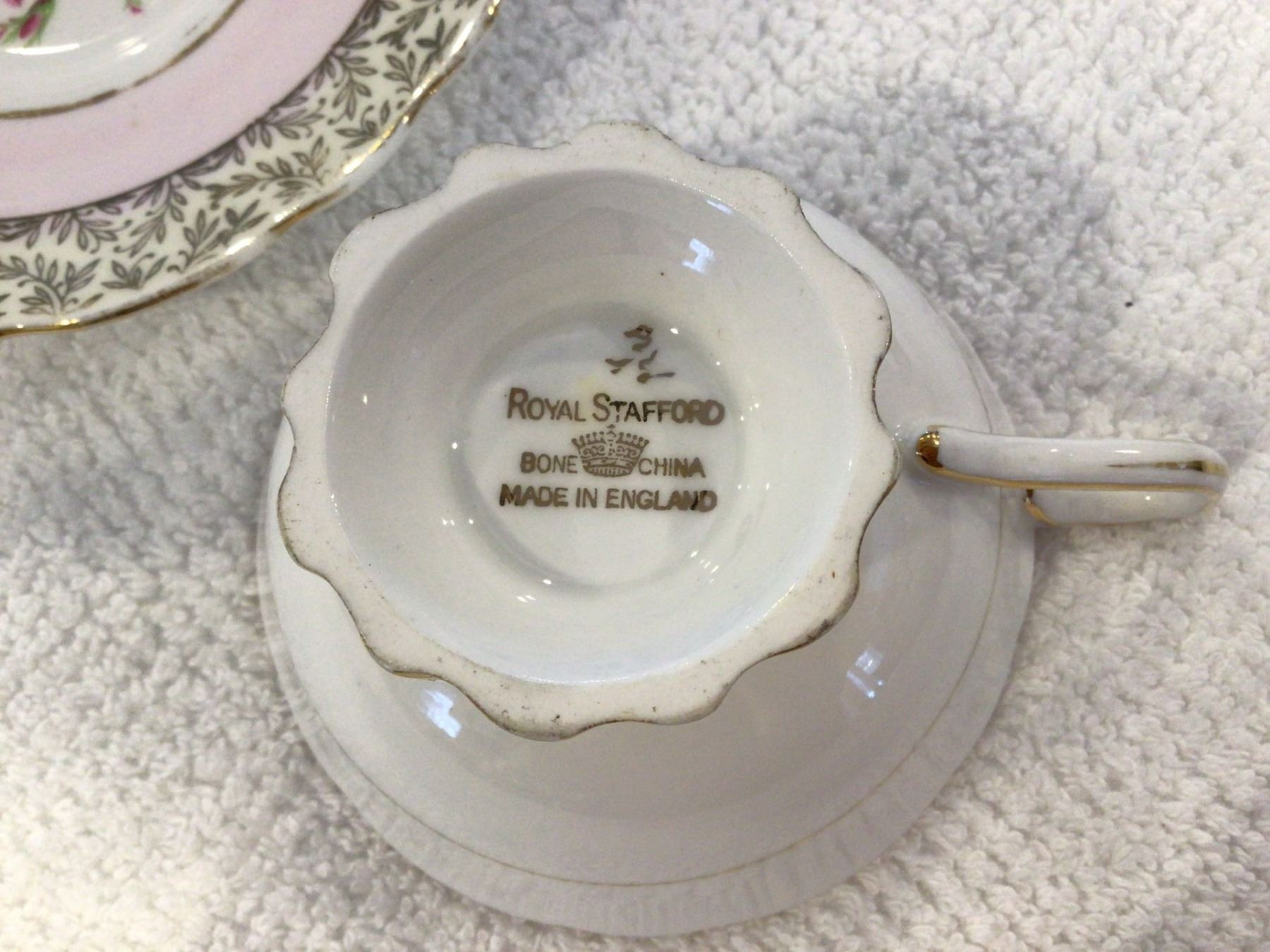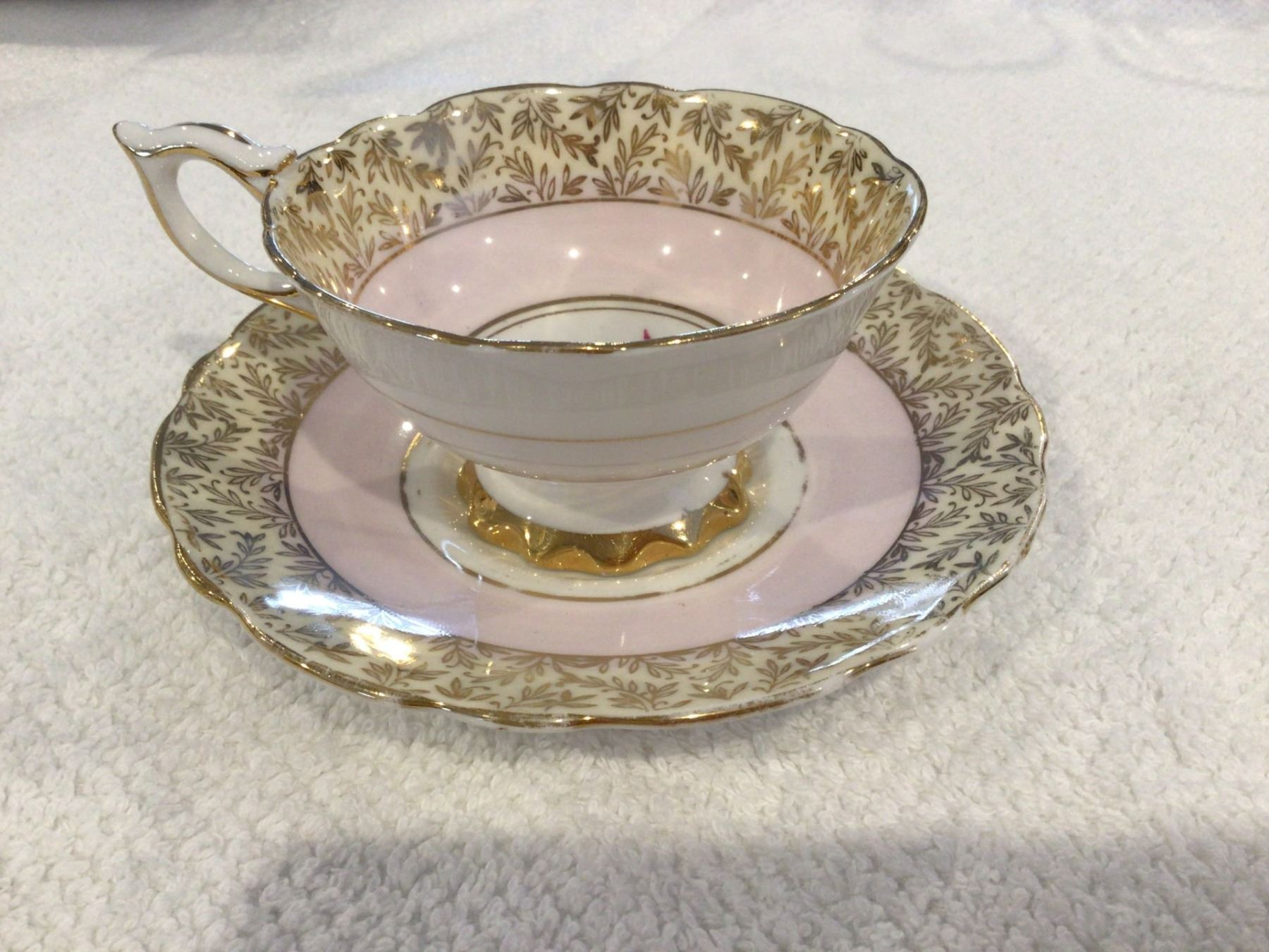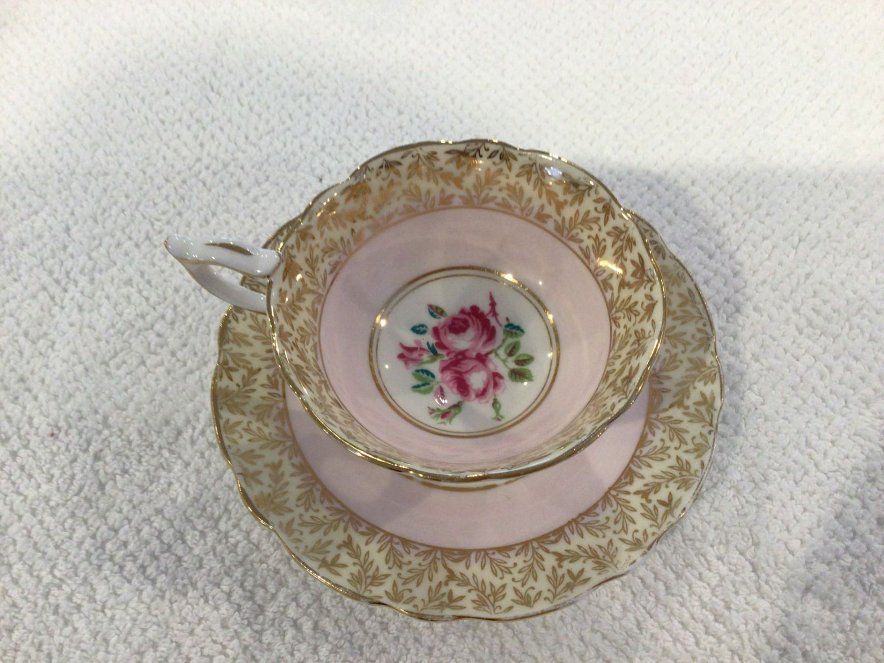 Pale pink border with pink rose center Royal Stafford tea cup and saucer.