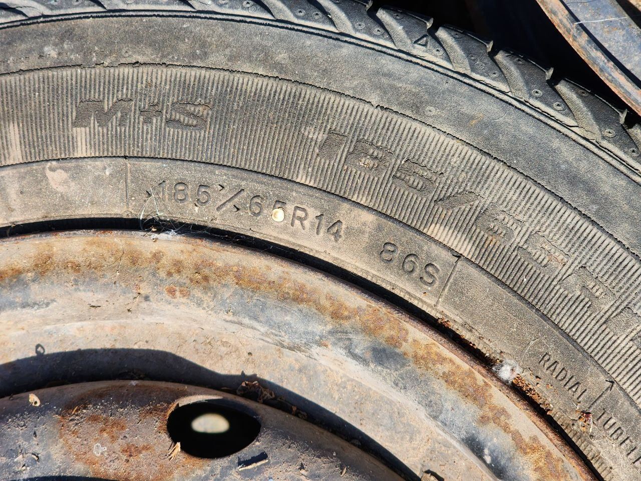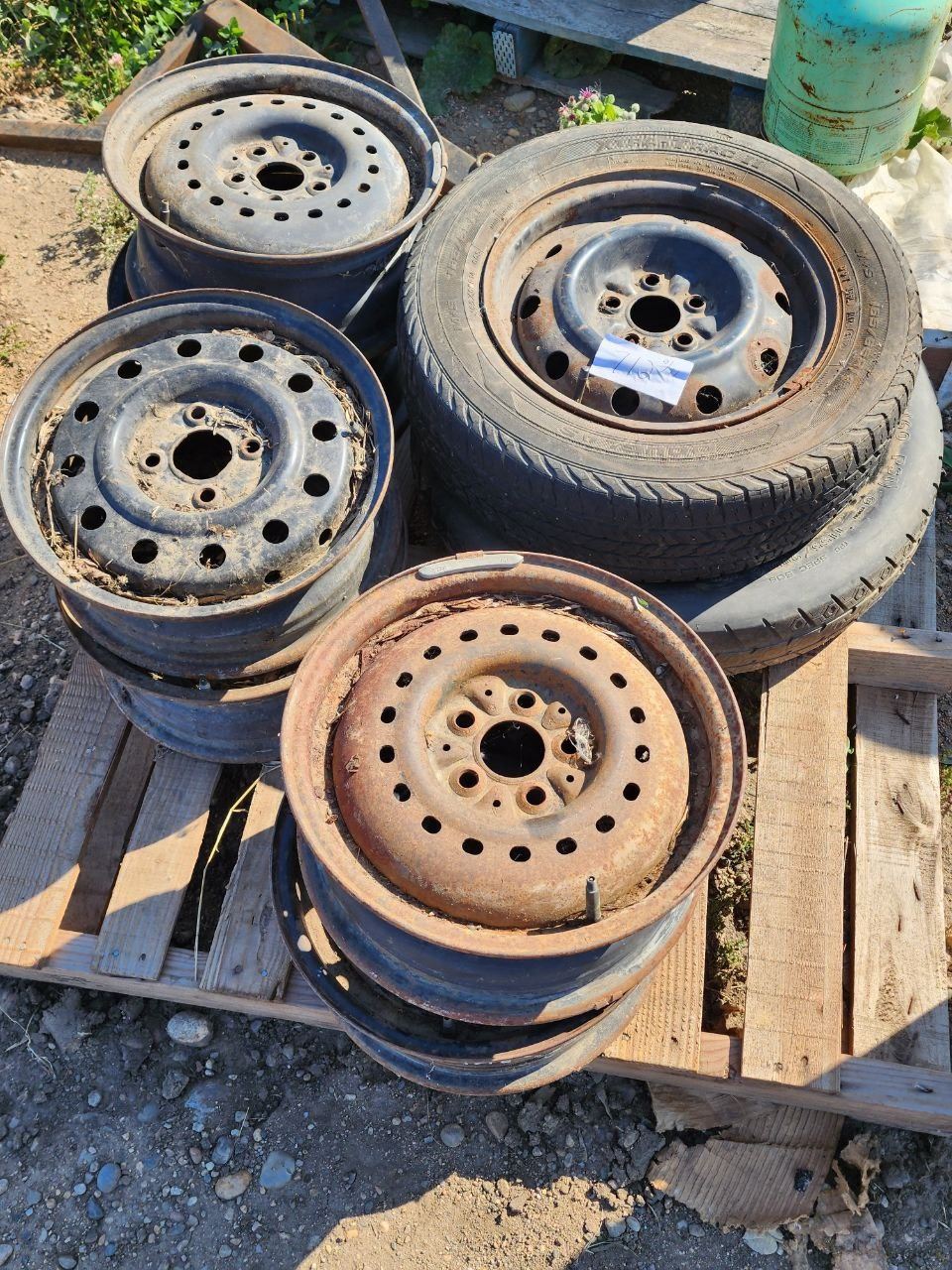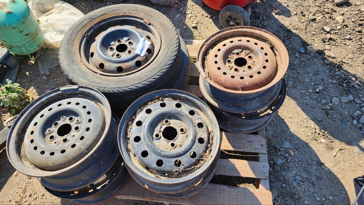 Pallet of Assorted 14" Rims, a 185/65R14 Tire and a Dummy Tire