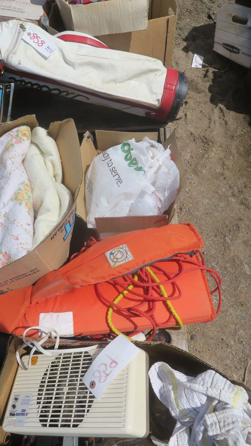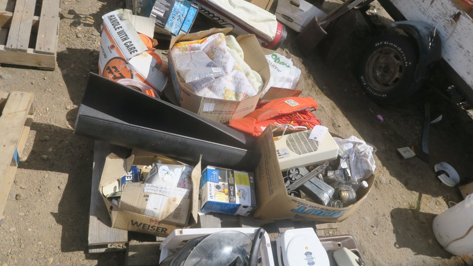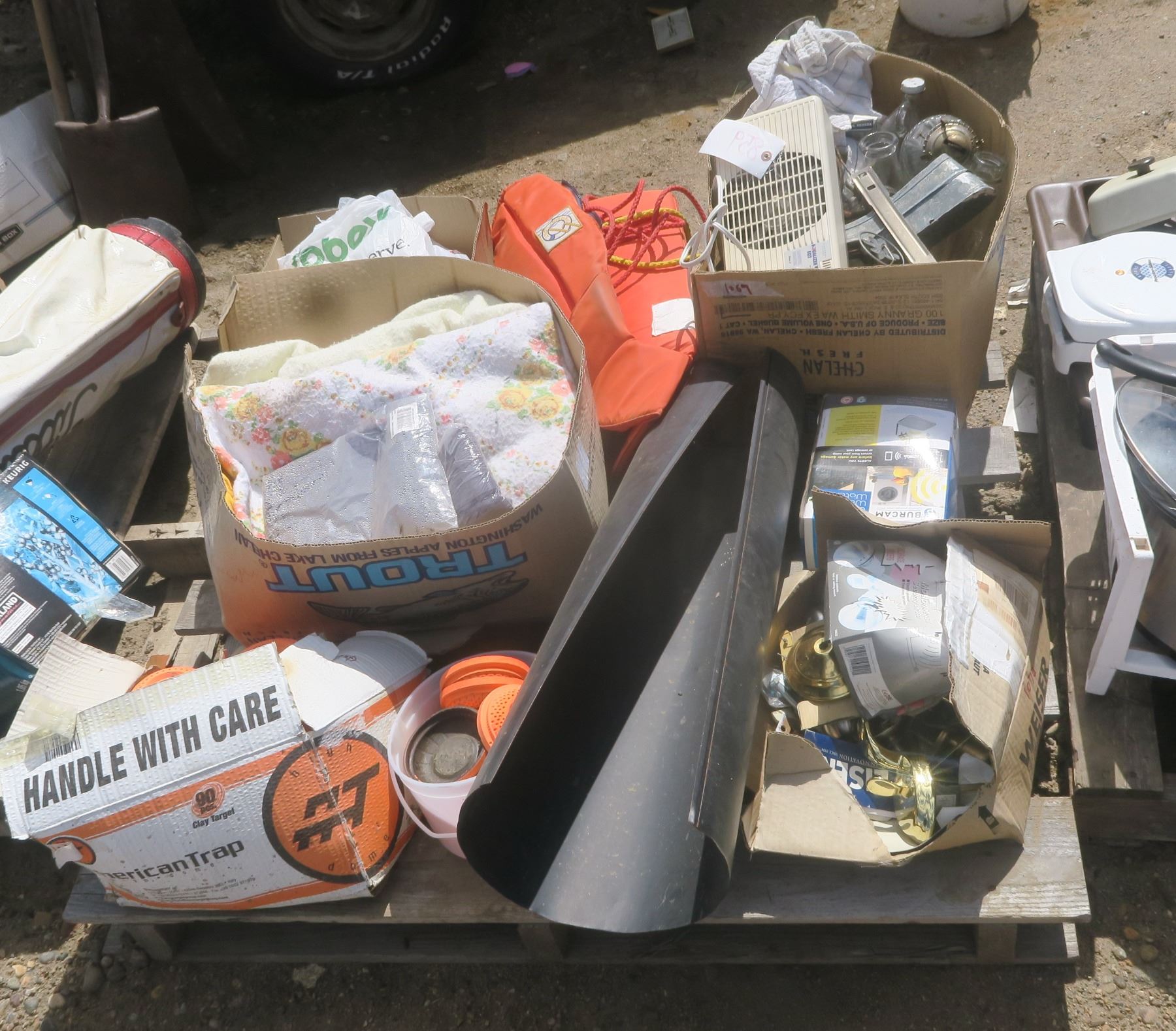 Pallet of Misc. - Life Jacket, Door Handles, Clays Discs, Blankets