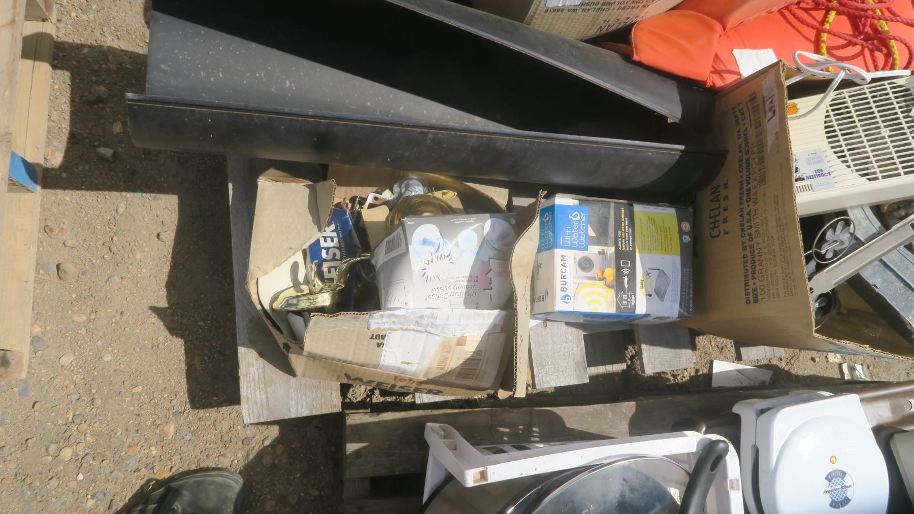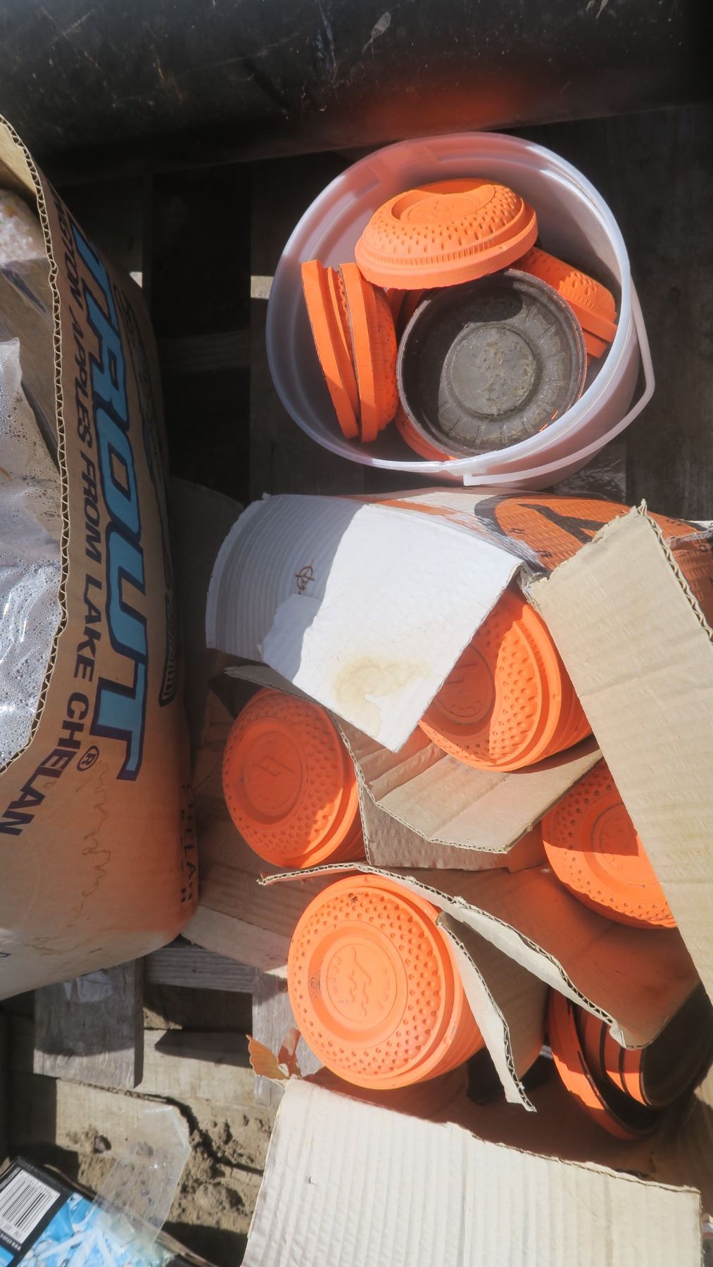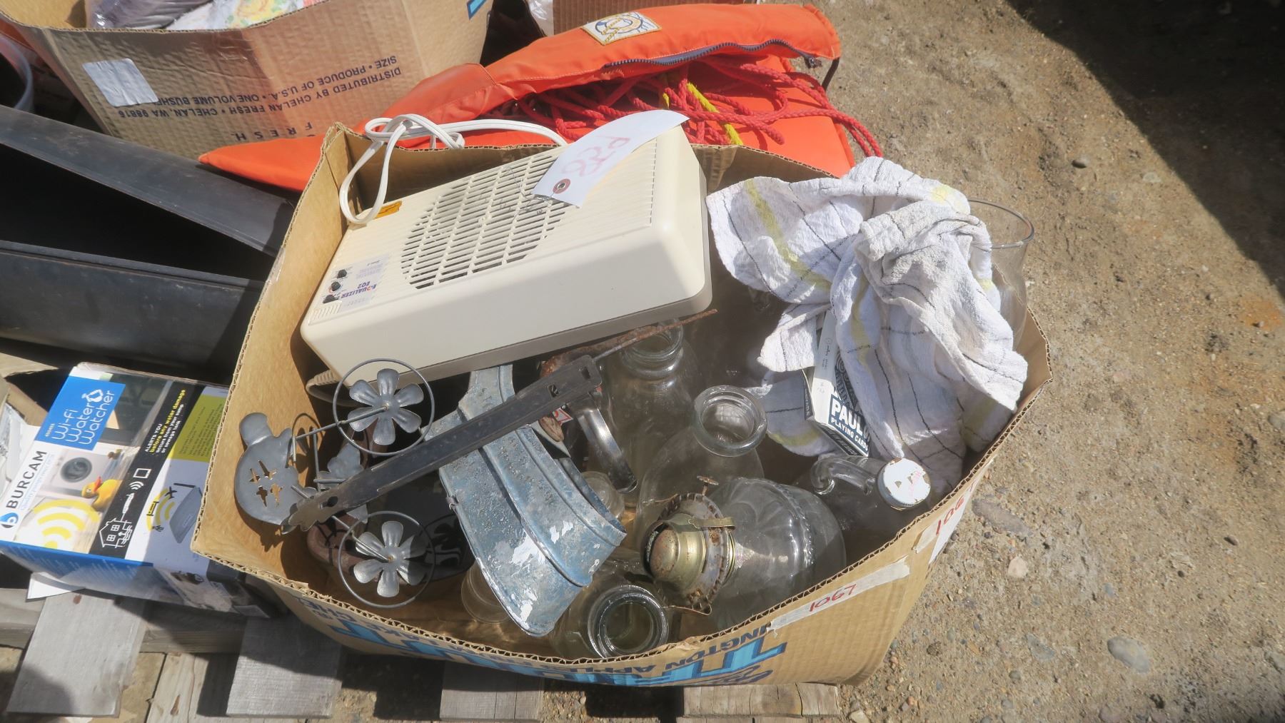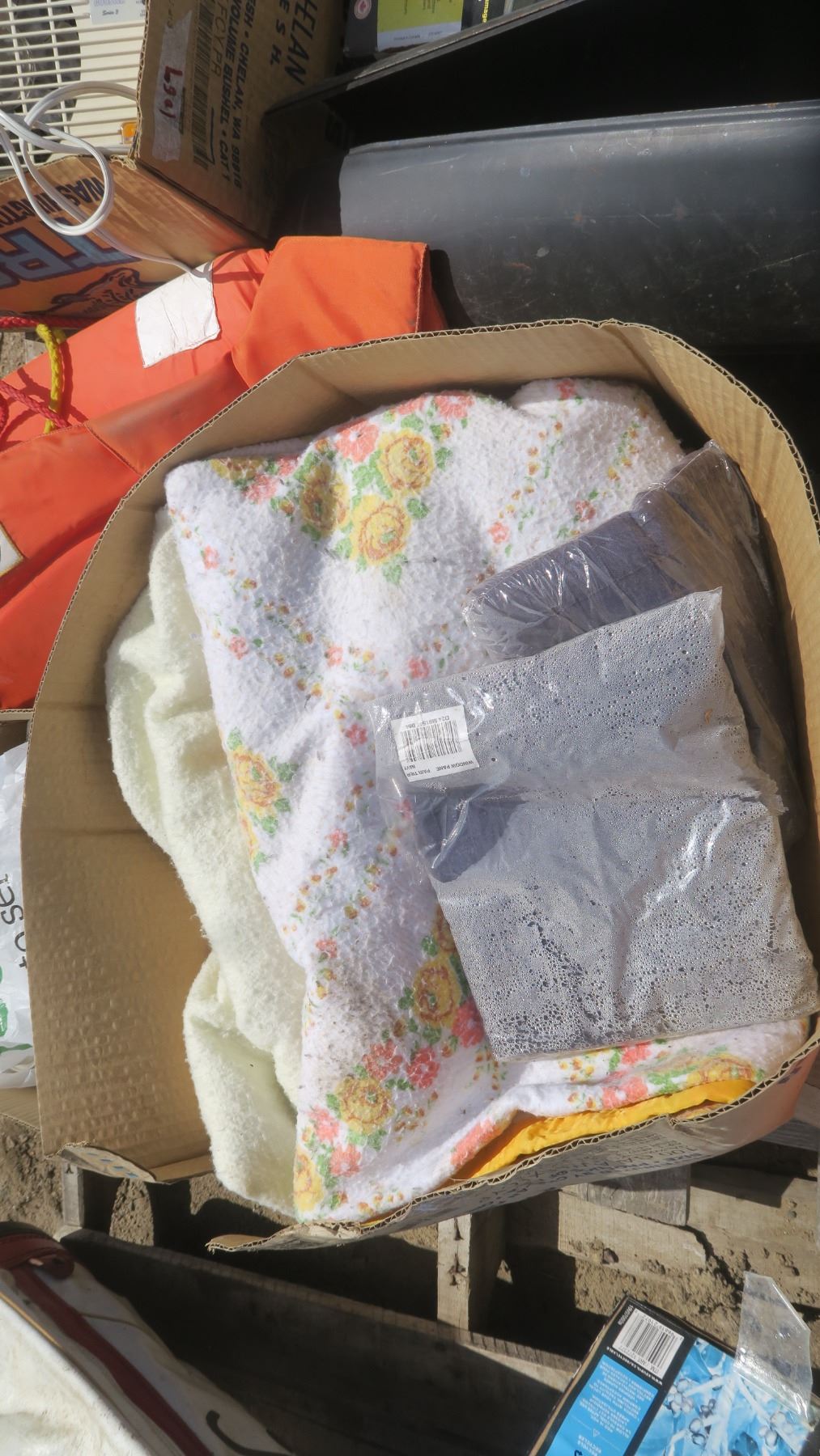 Pallet of Misc. - Life Jacket, Door Handles, Clays Discs, Blankets