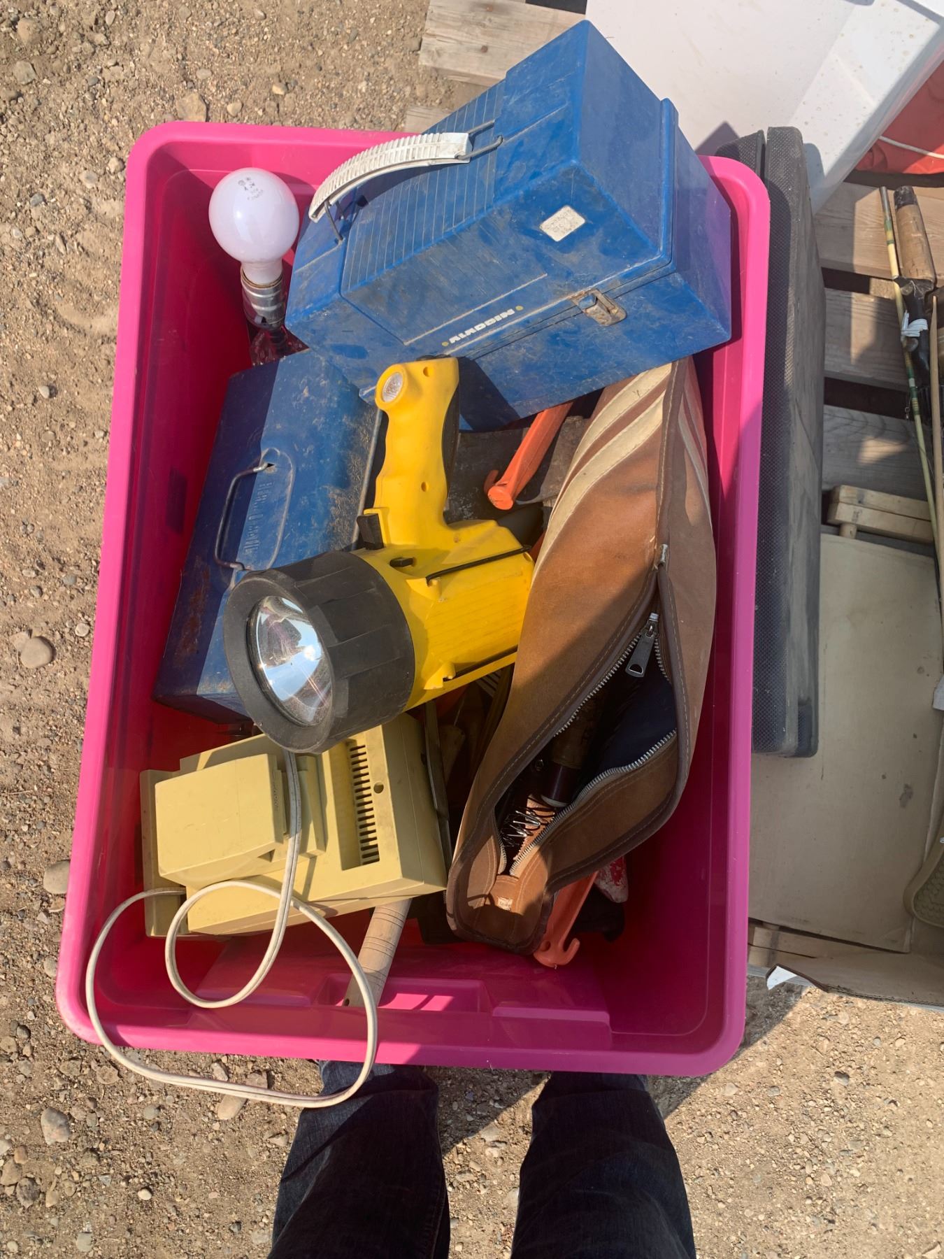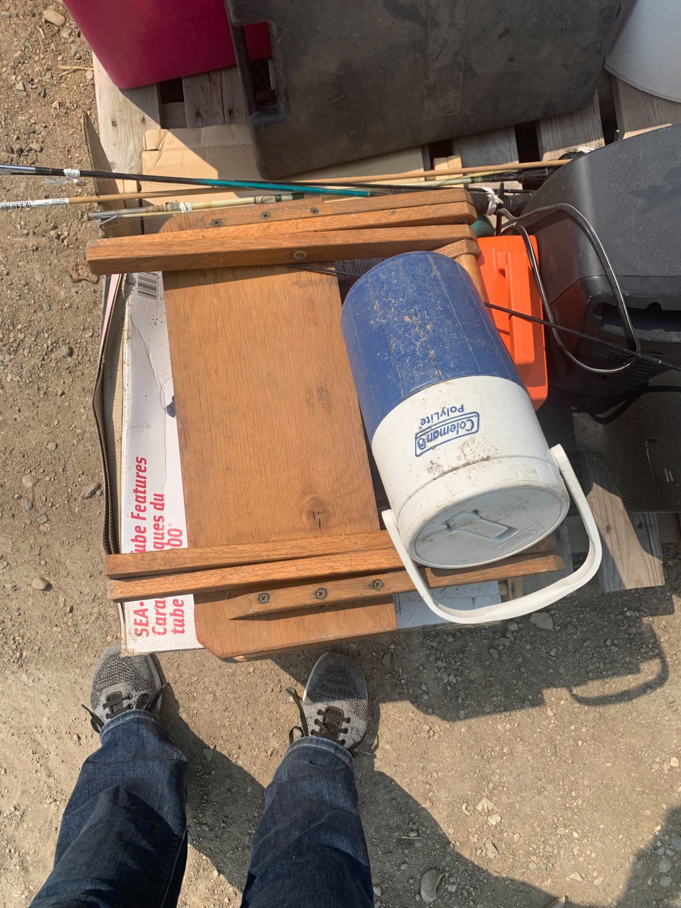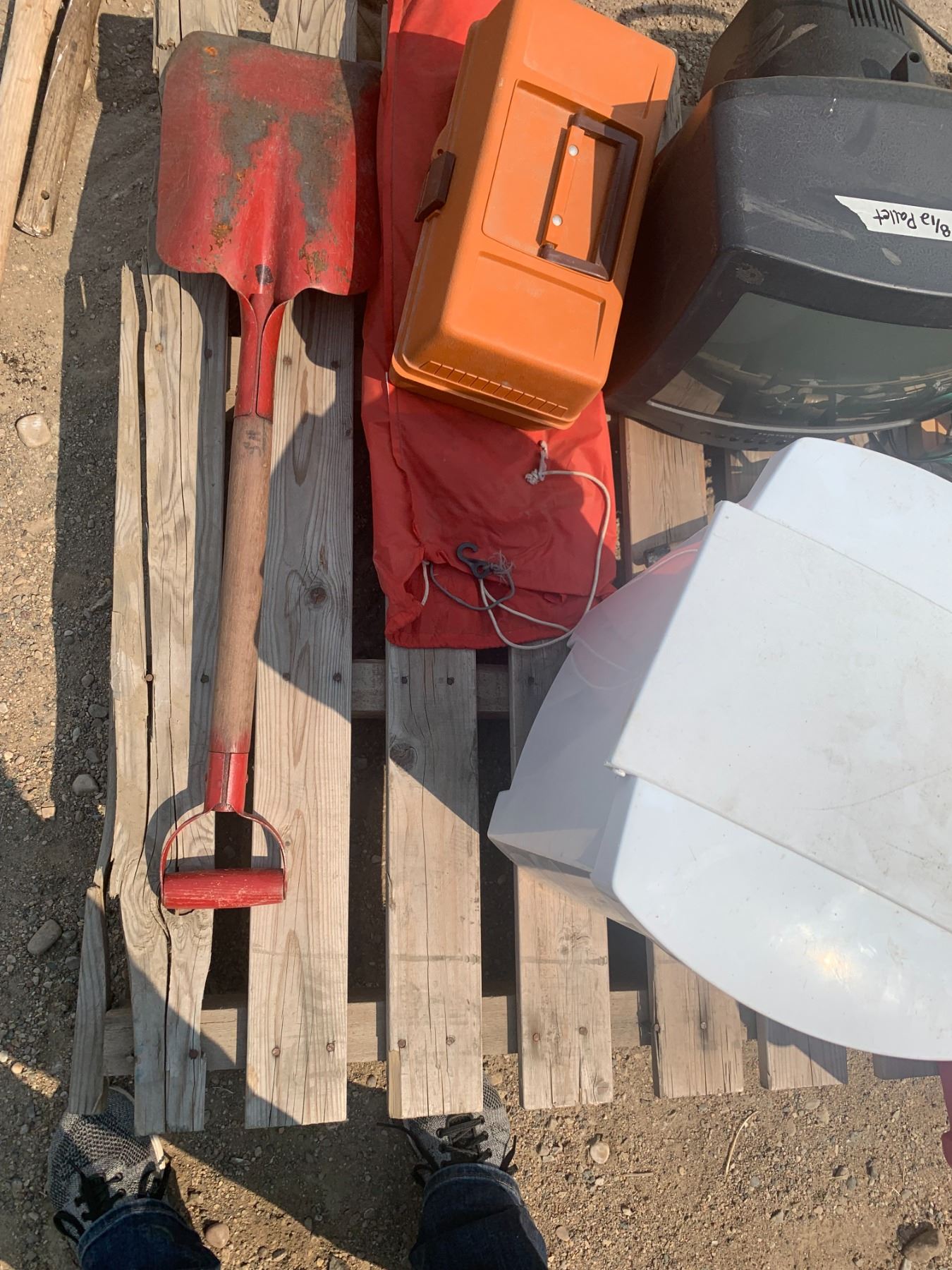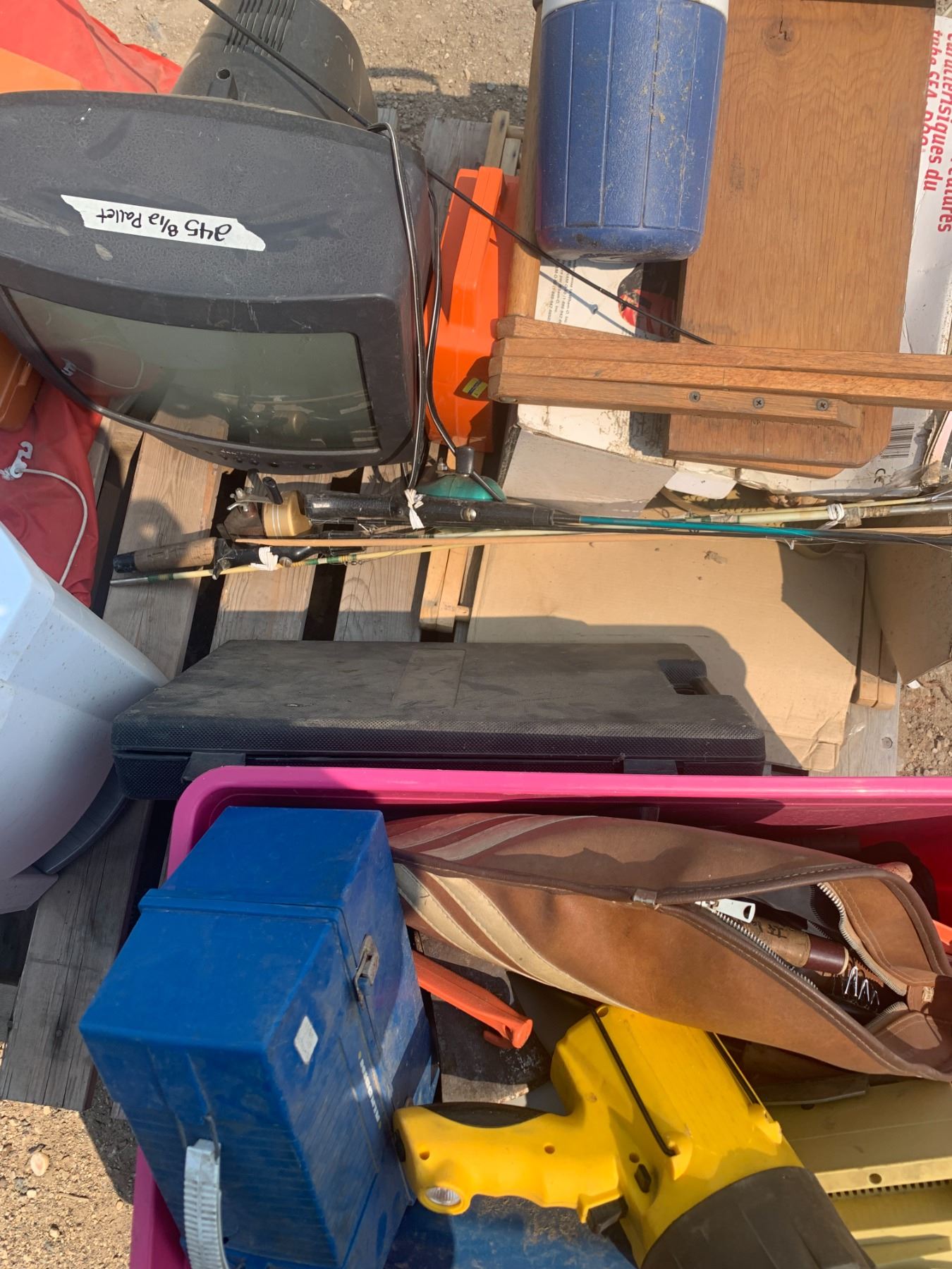 Pallet of fishing gear, t.v, garbage can, shovel, hatchet etc