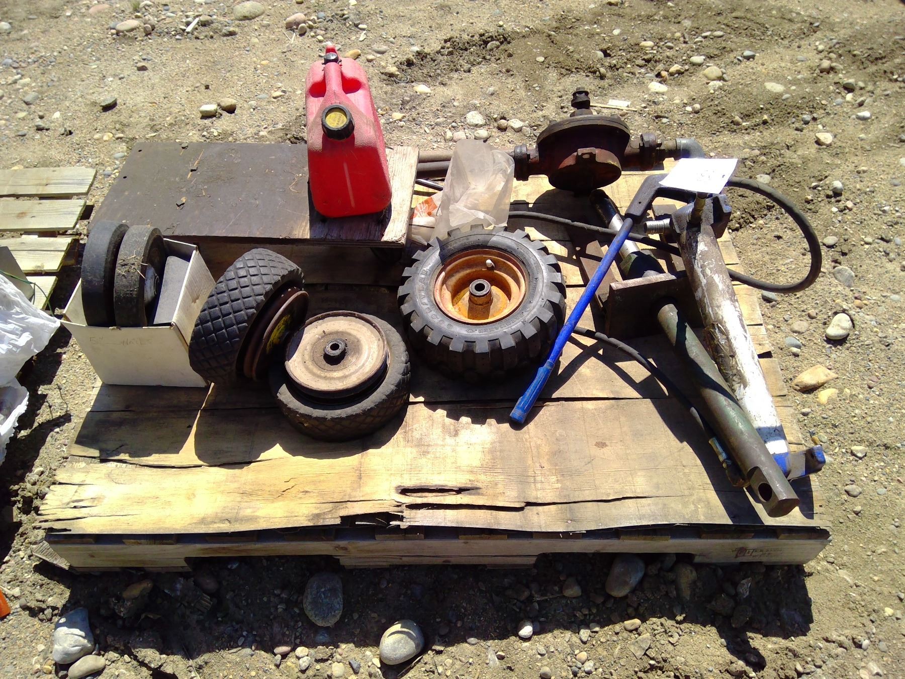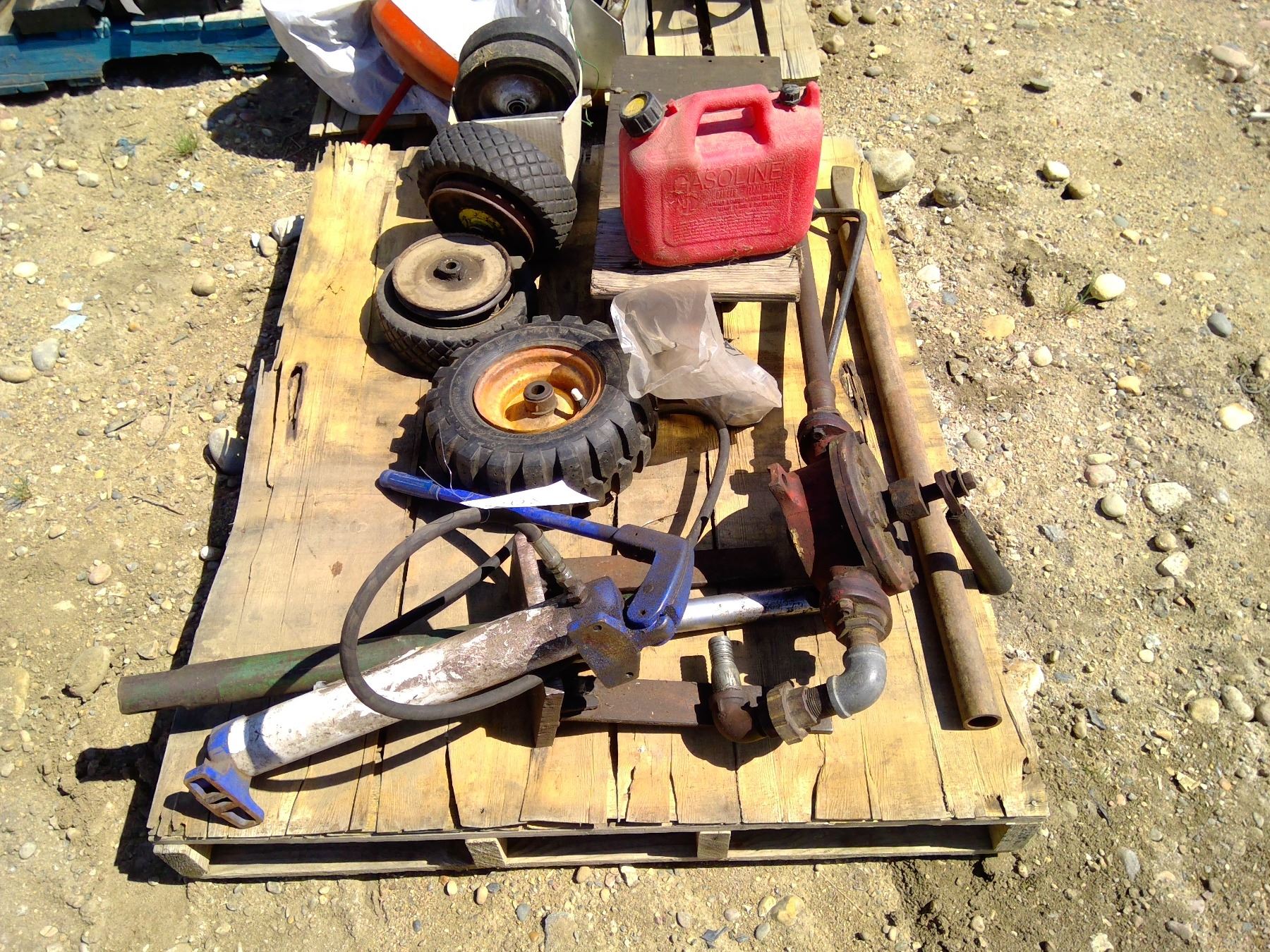 Pallet of misc items inlcuding jerry can , wheels and pump