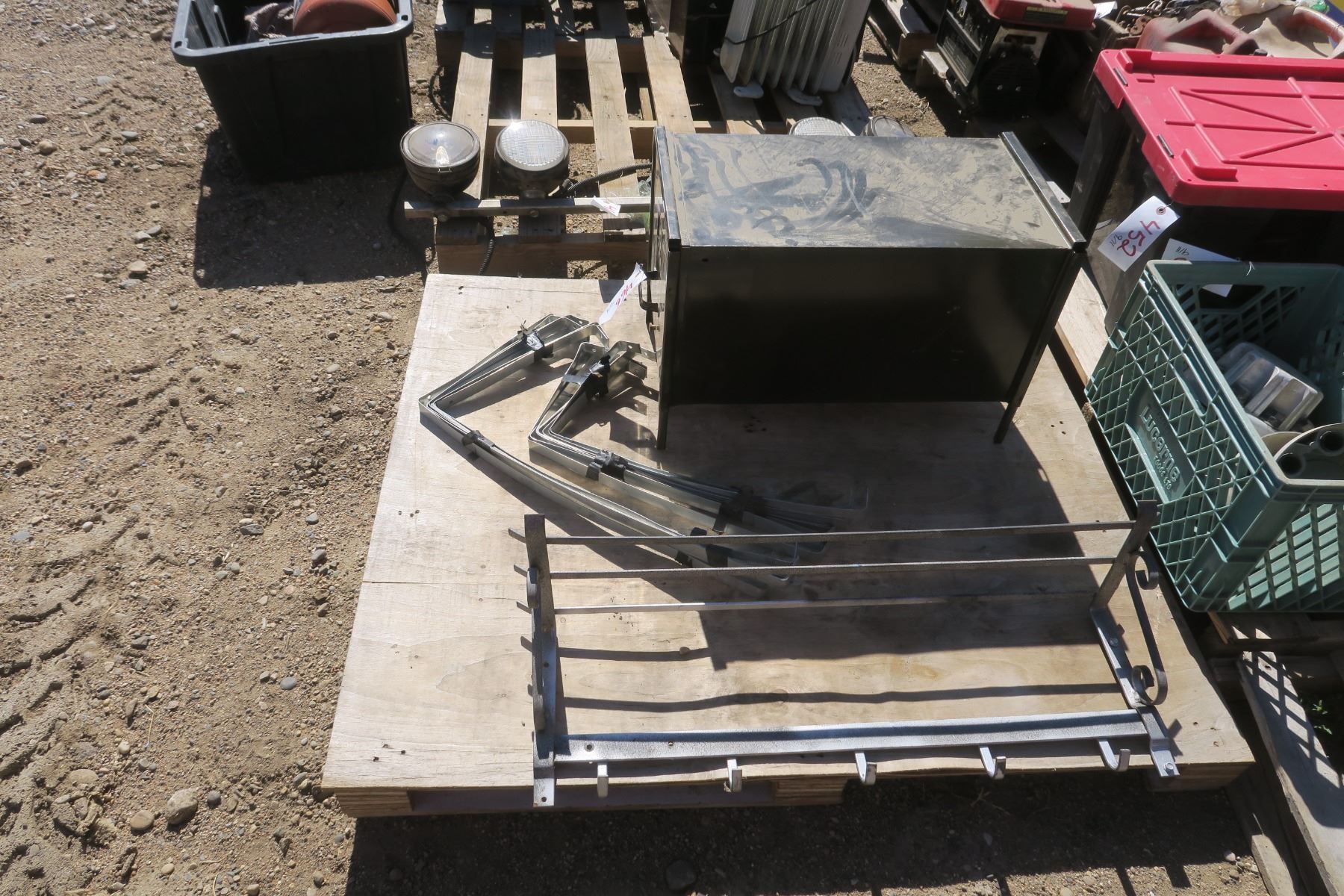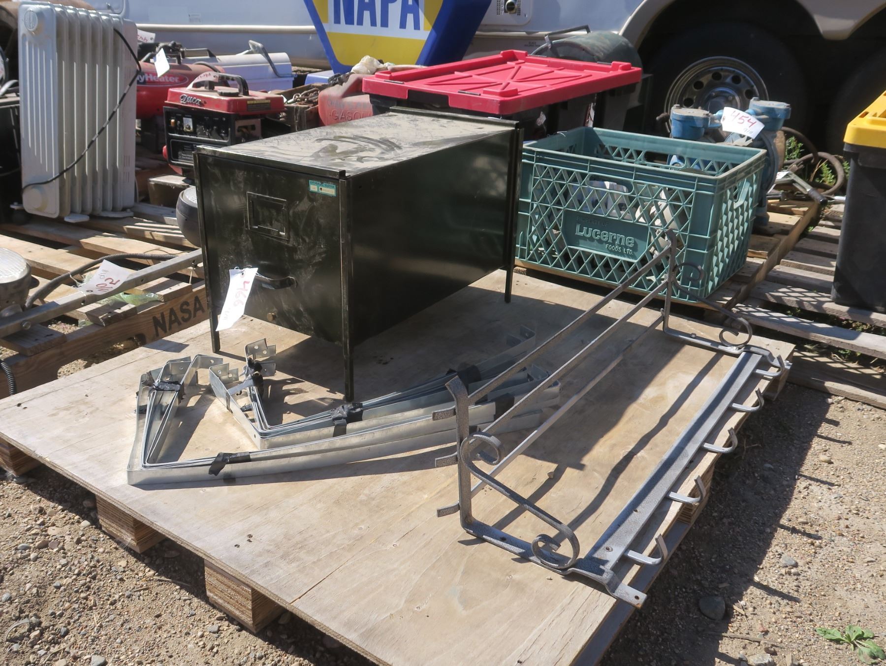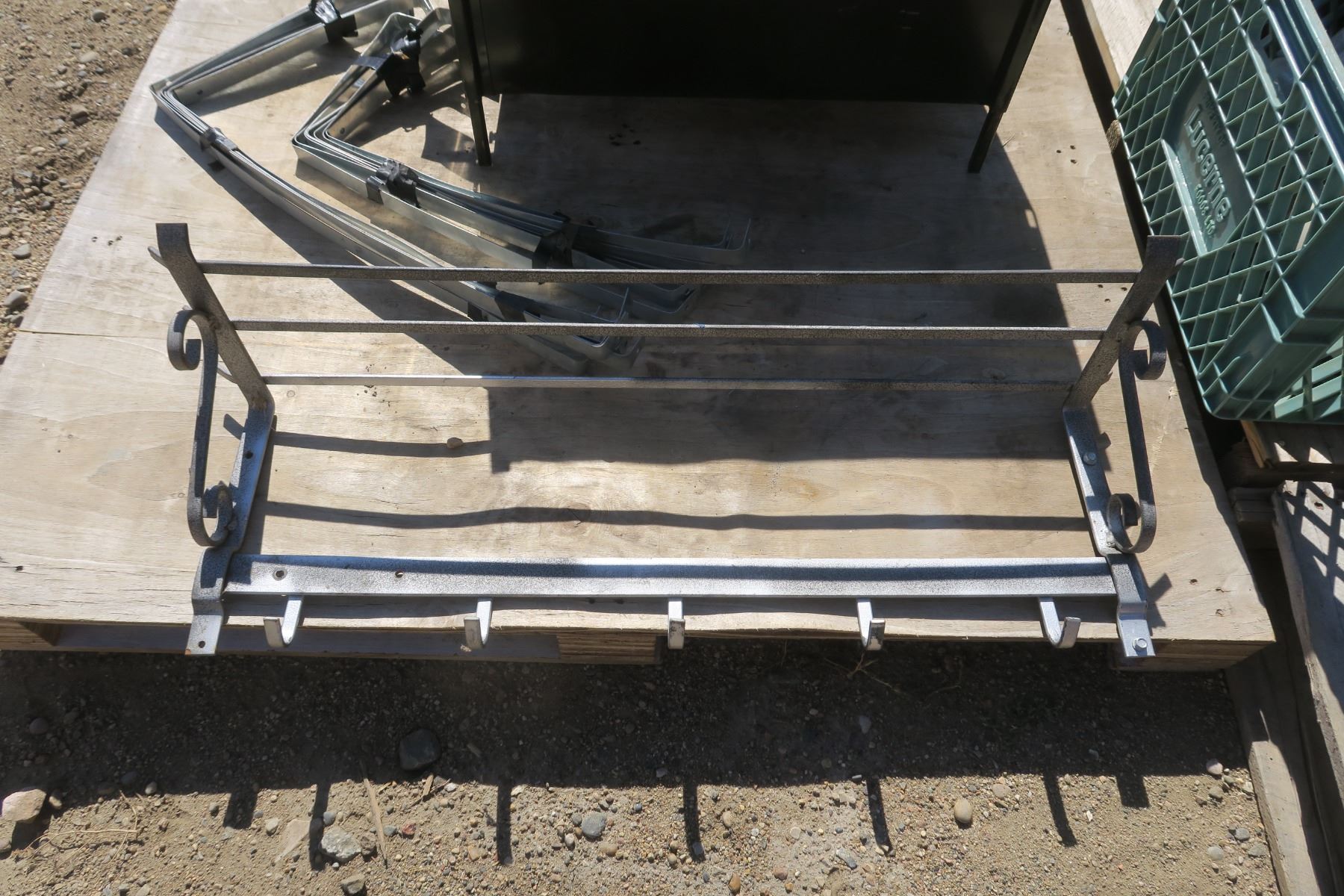 Pallet w/ Metal Filing Drawer, Ornate Coat Hooks & Misc. Brackets