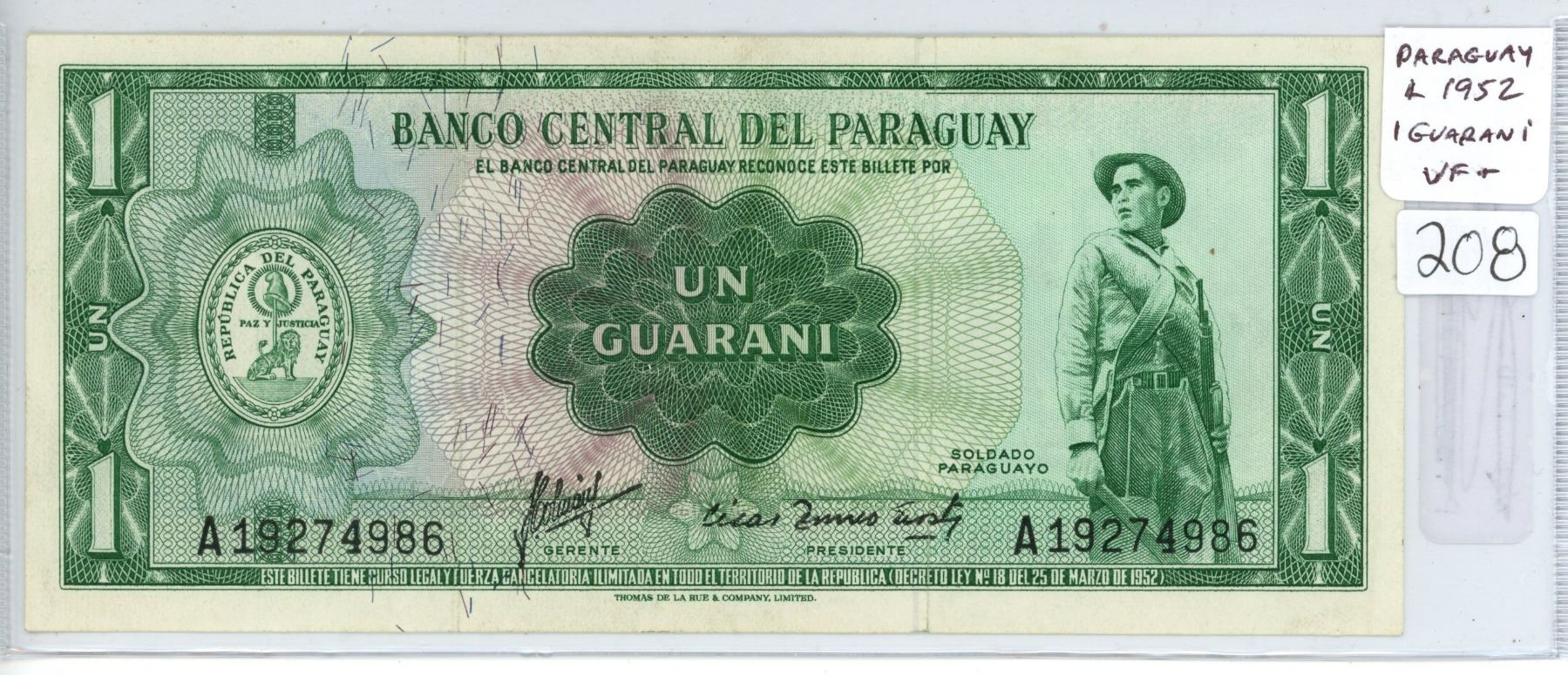 Paraguay. Central Bank of Paraguay. L1952 1 Guarani. VF+.