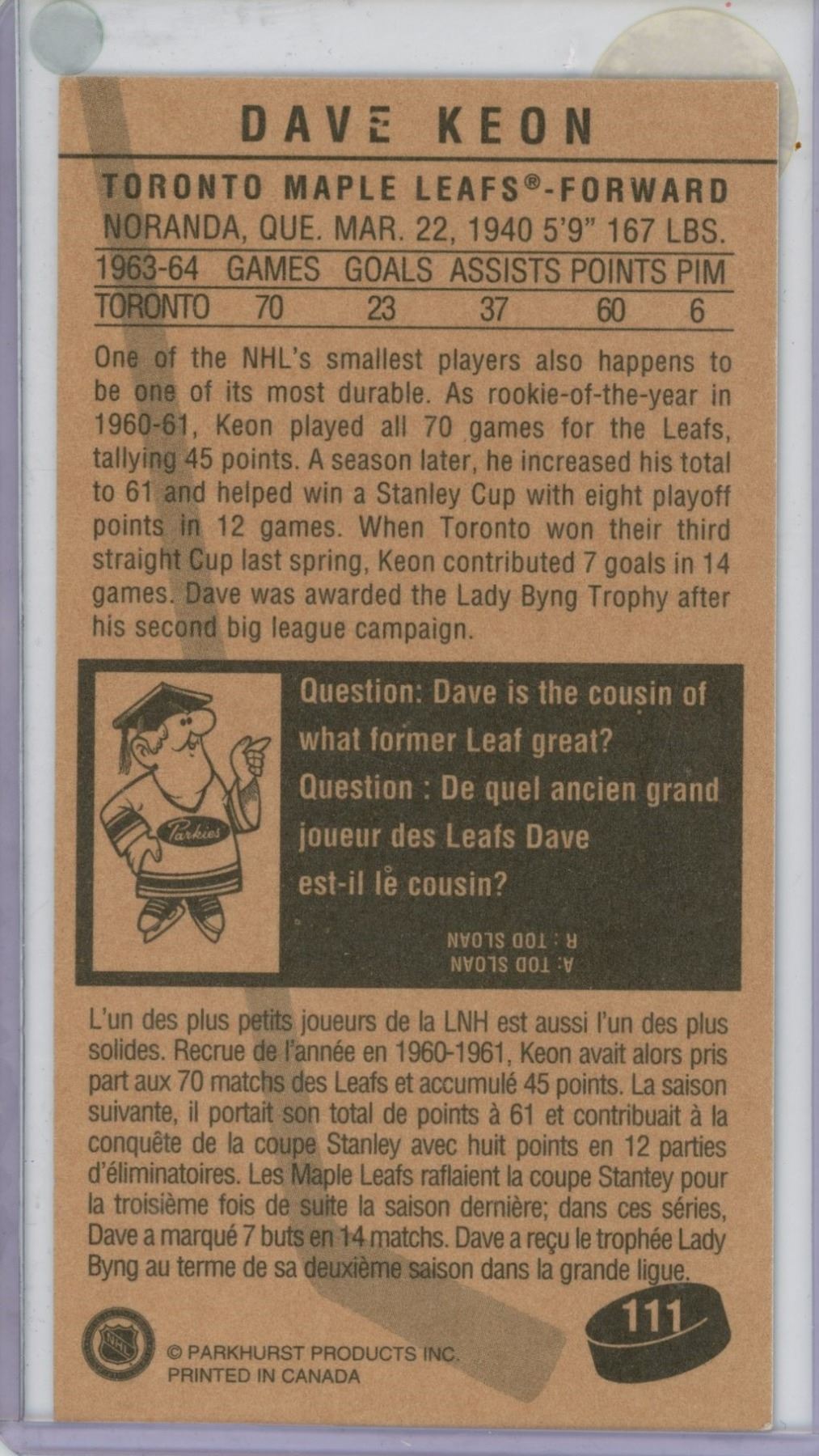 Parkhurst 1963-64 Dave Keon Toronto Maple Leaf's tall boy card
