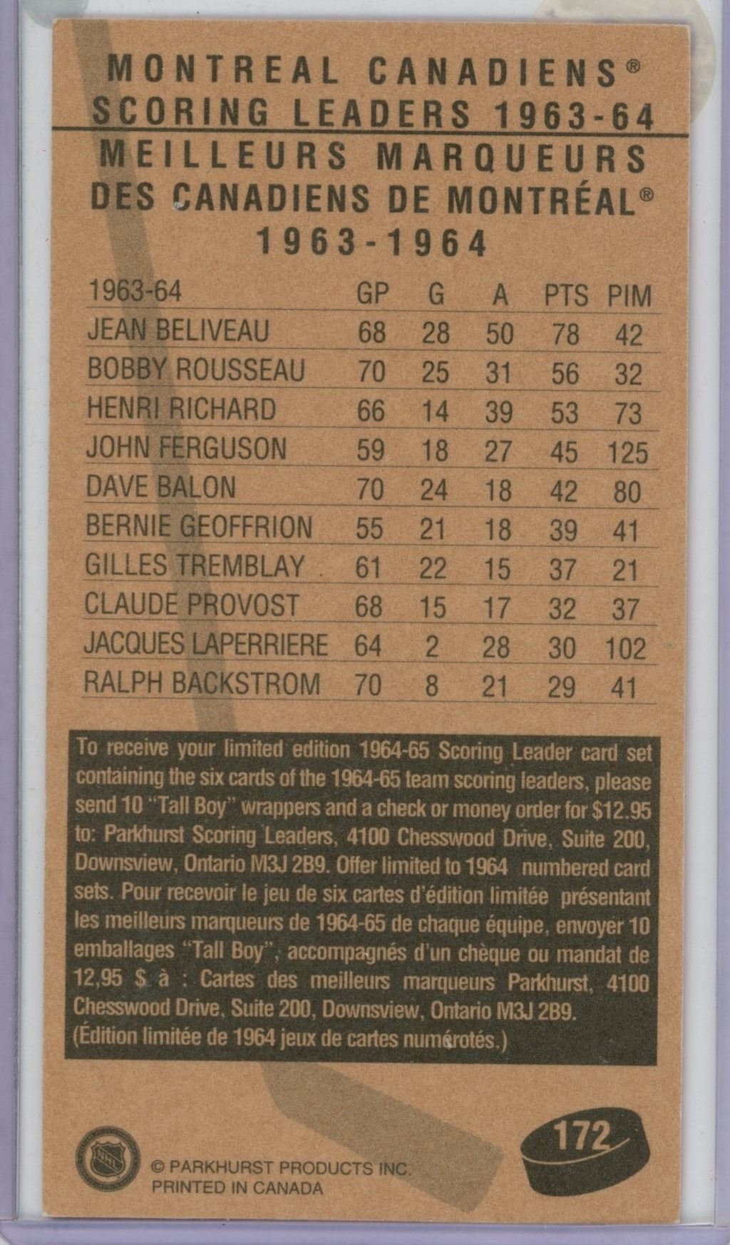 Parkhurst 1963-64 Jean Beliveau Montreal Canadiens tall boy card