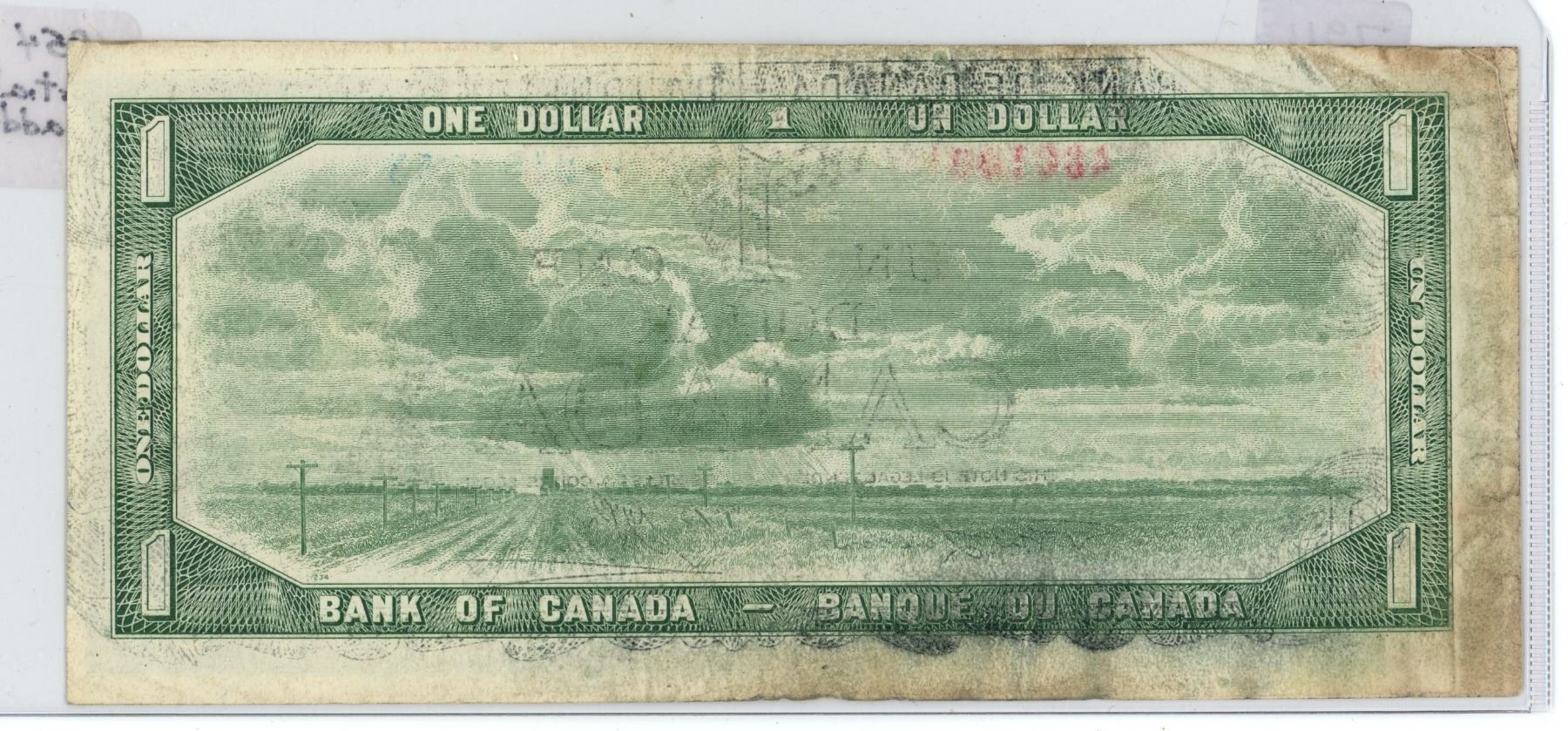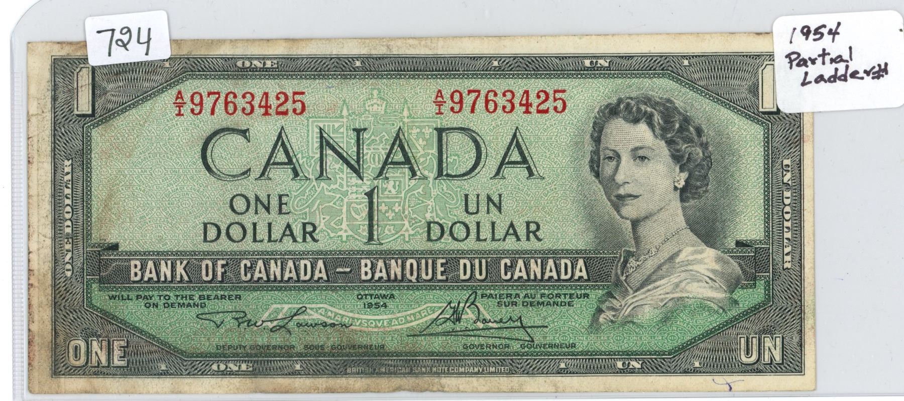 Partial ladder serial #A/I 9763425 canada 1954 $1, lawson/ Bouey
