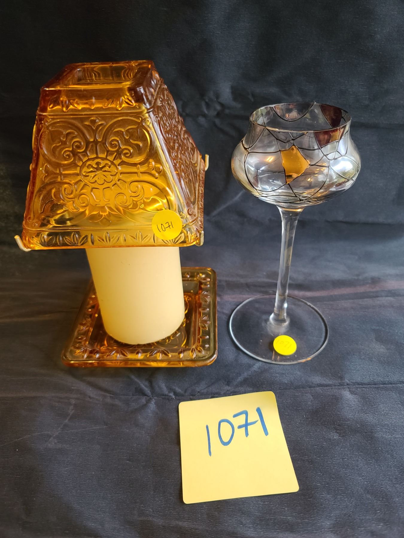 “Partylite set: “Partylite” Amber glass pillar shade and base, “Partylite” stained glass stem tealight holder