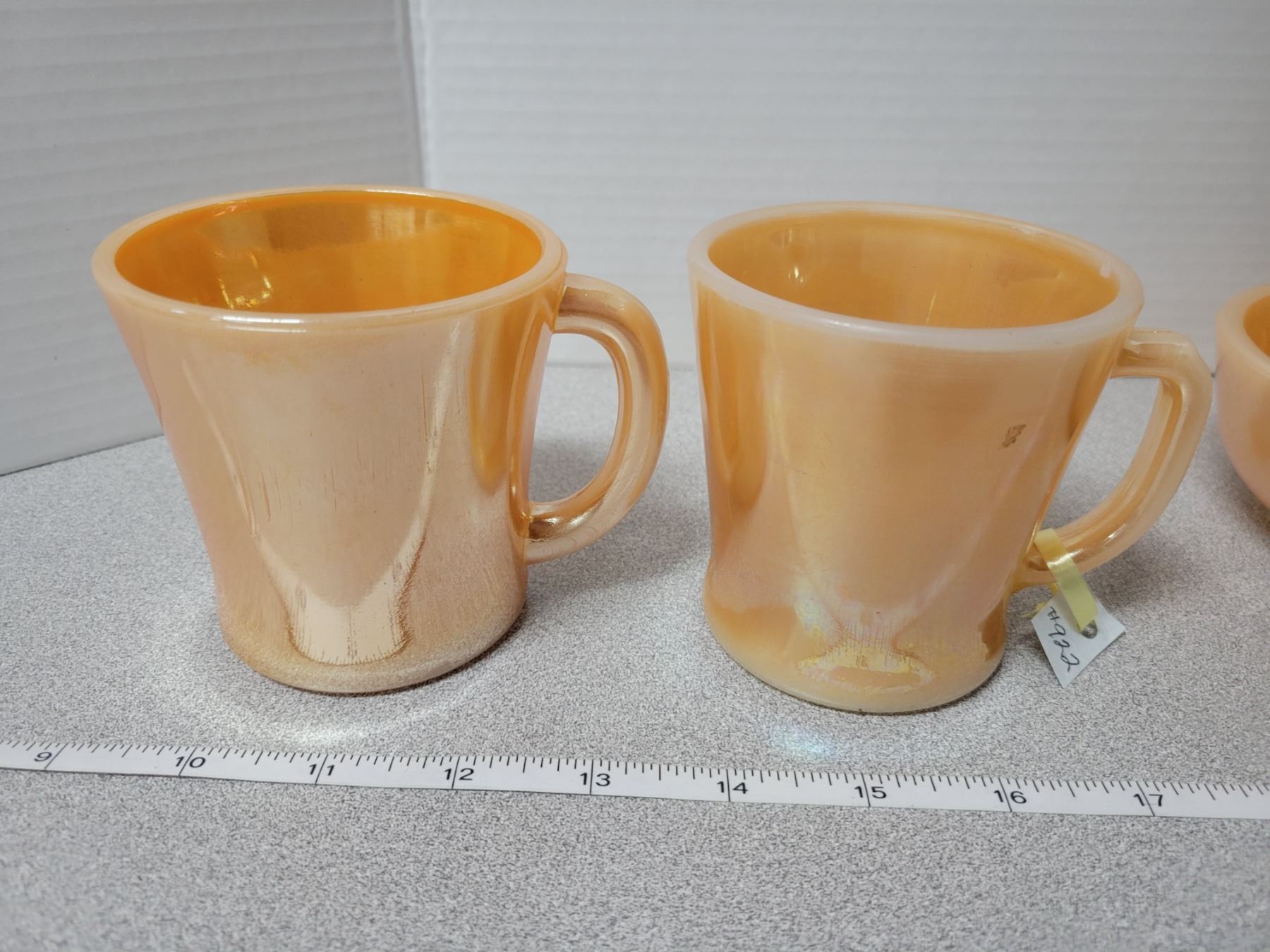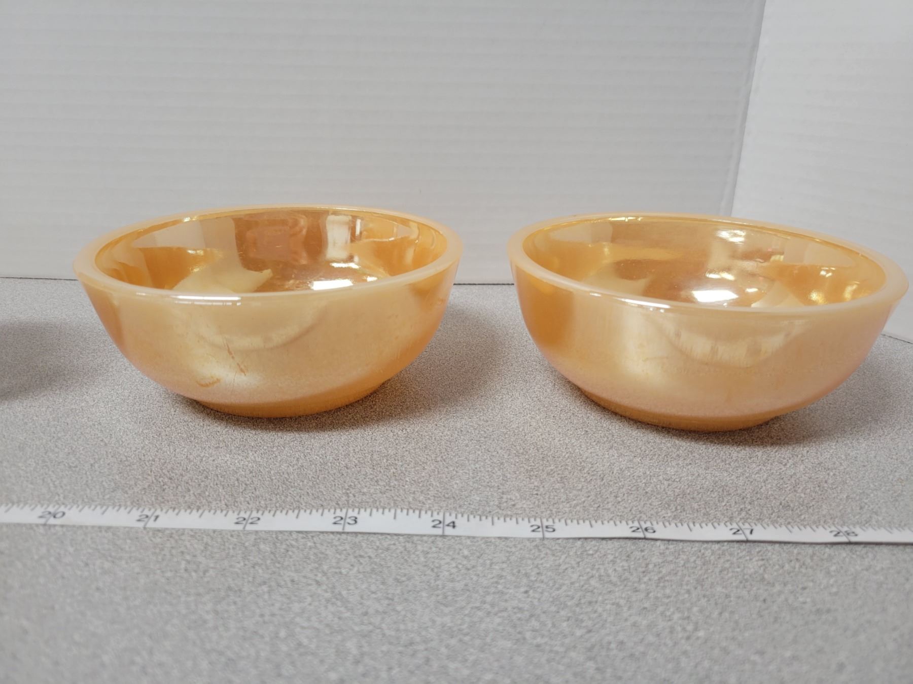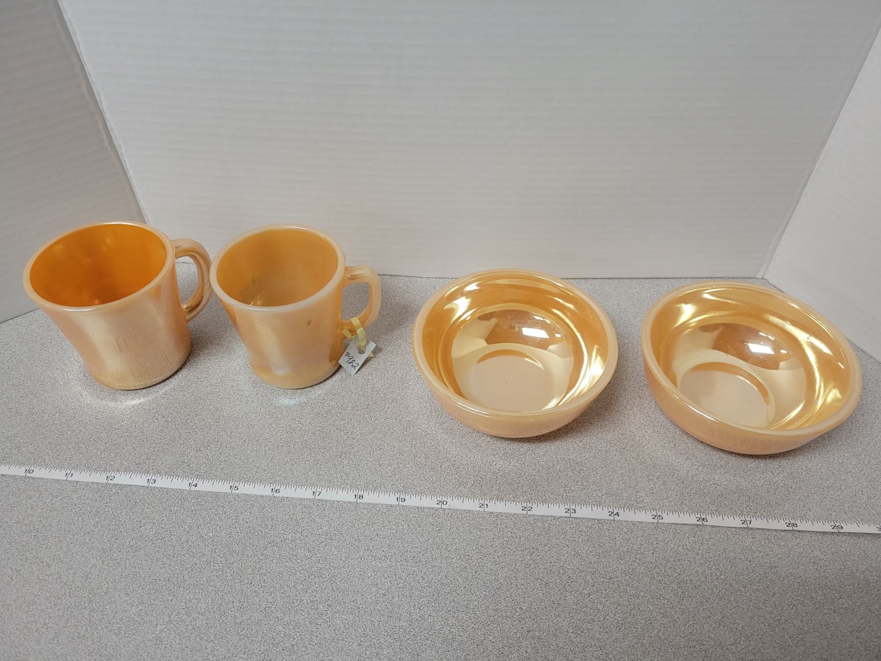 Peach luster FireKing, 2 coffee mugs, 2 cereal bowls
