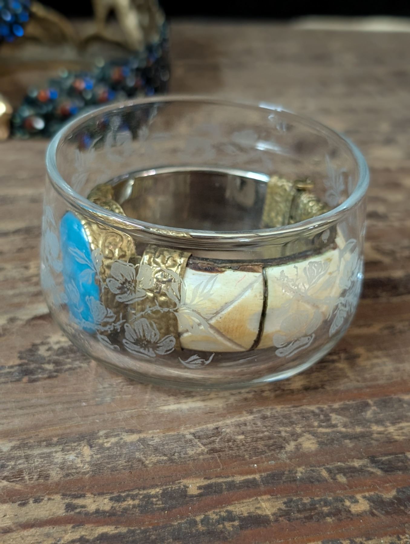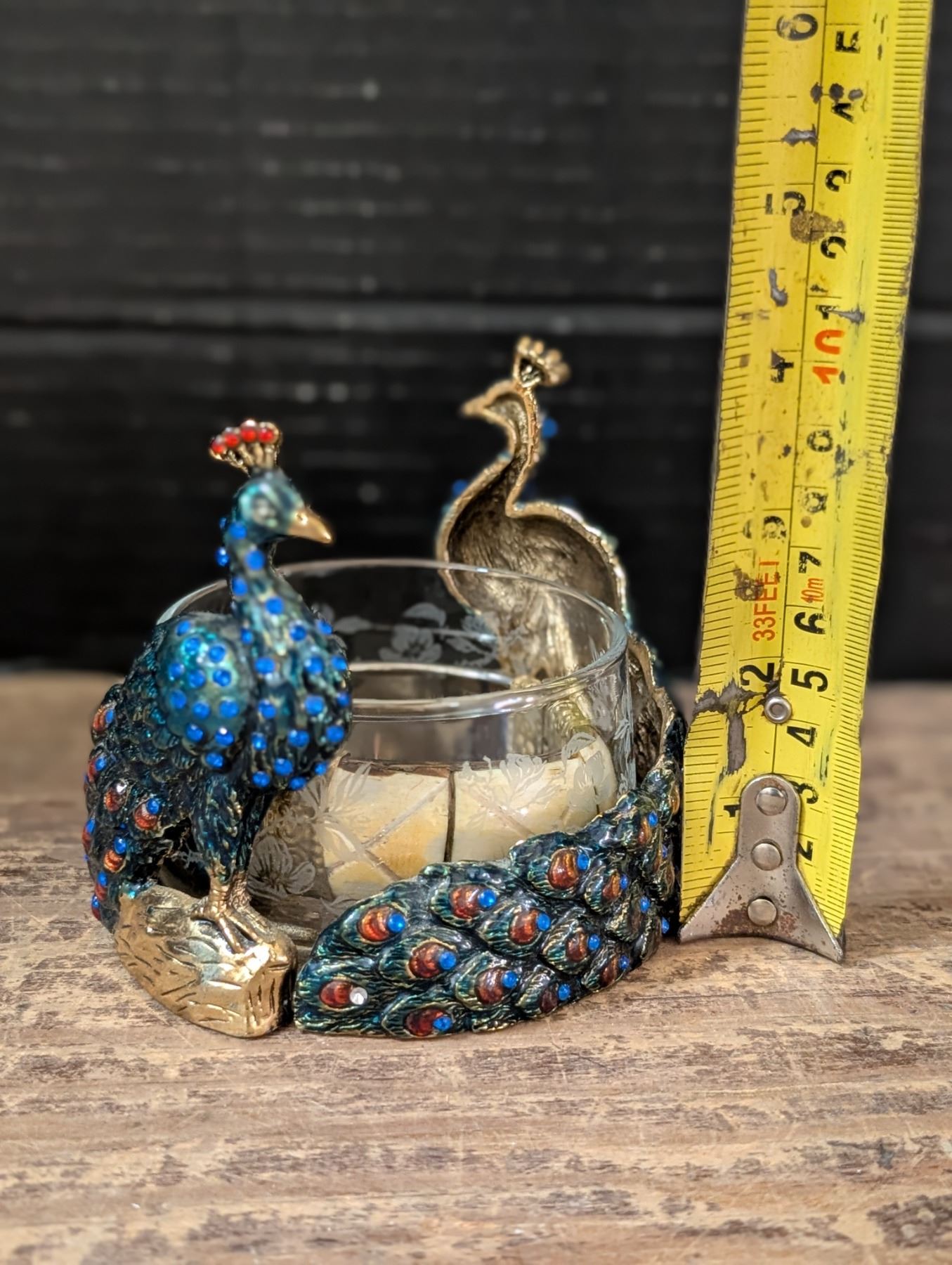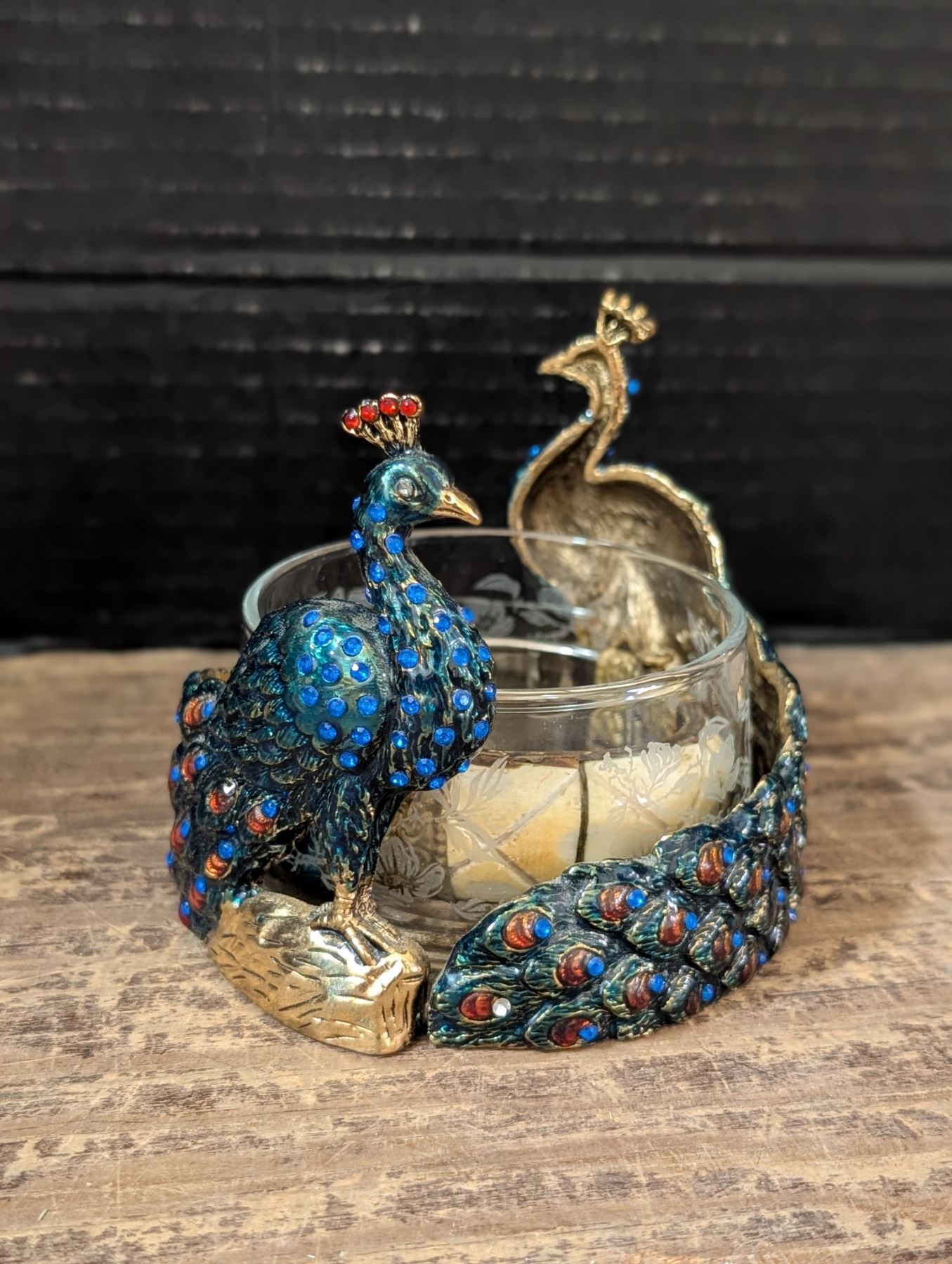 Peacock Metal Holder w/ Glass bowl and turquoise and bone bracelet (Great Condition)