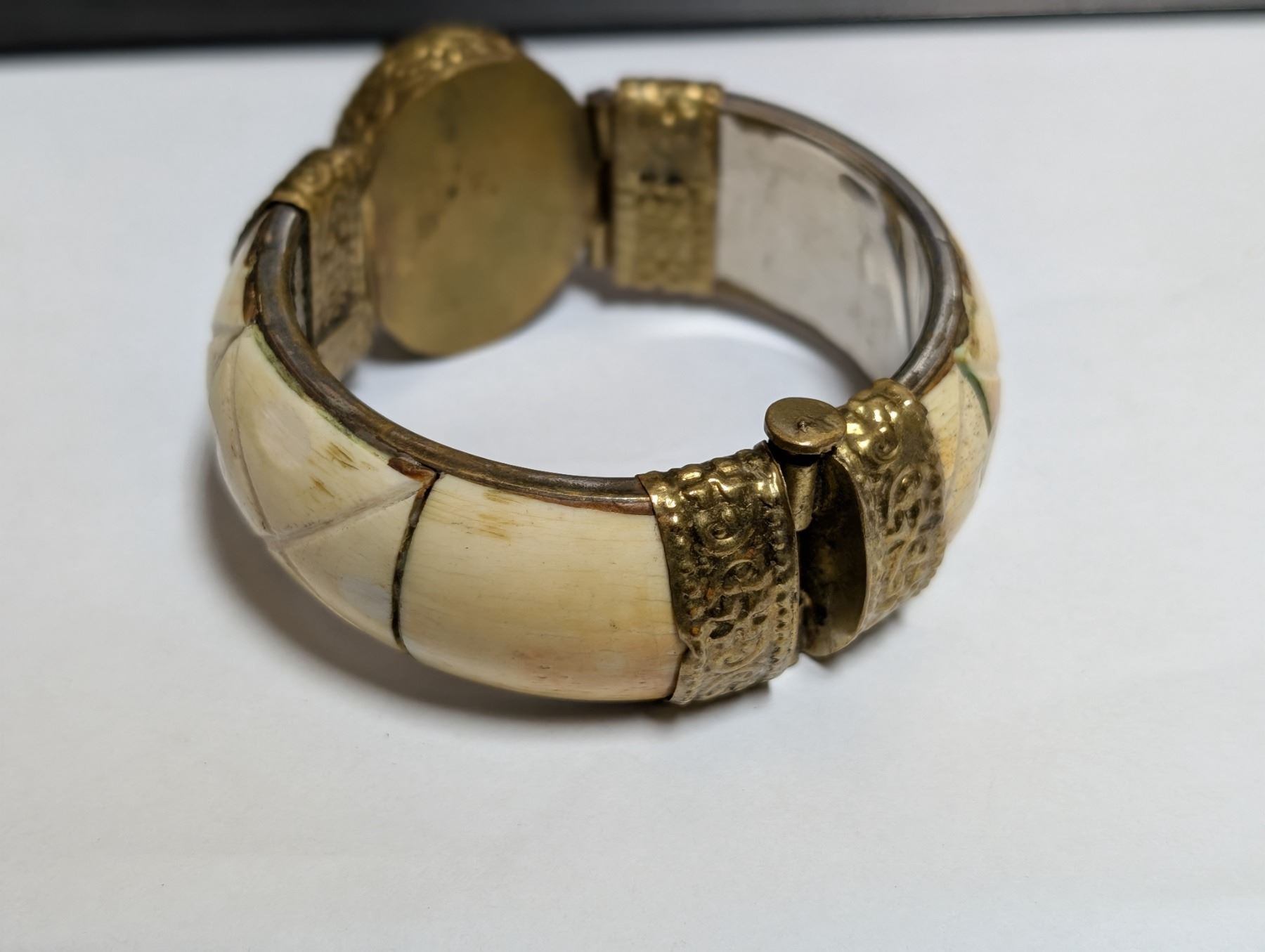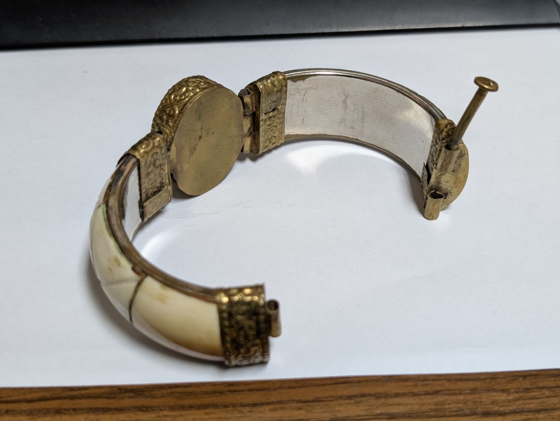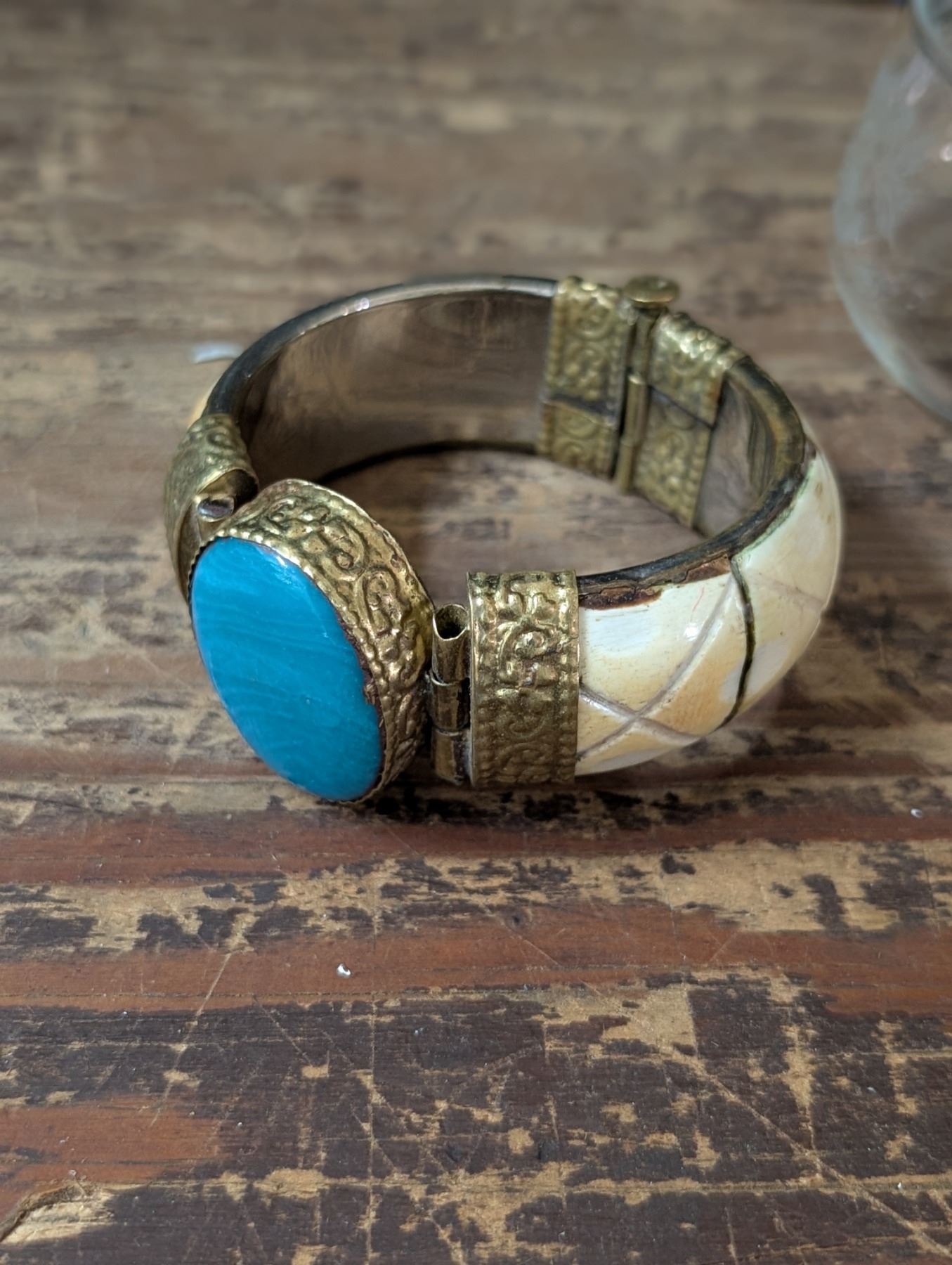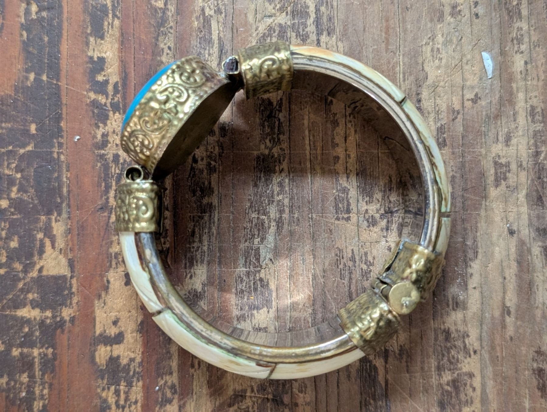 Peacock Metal Holder w/ Glass bowl and turquoise and bone bracelet (Great Condition)