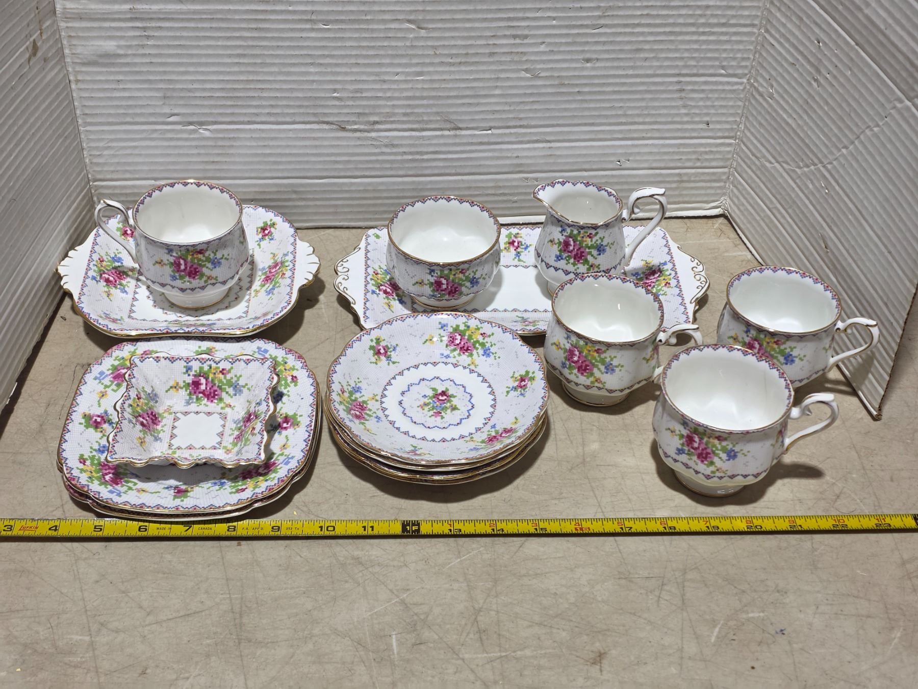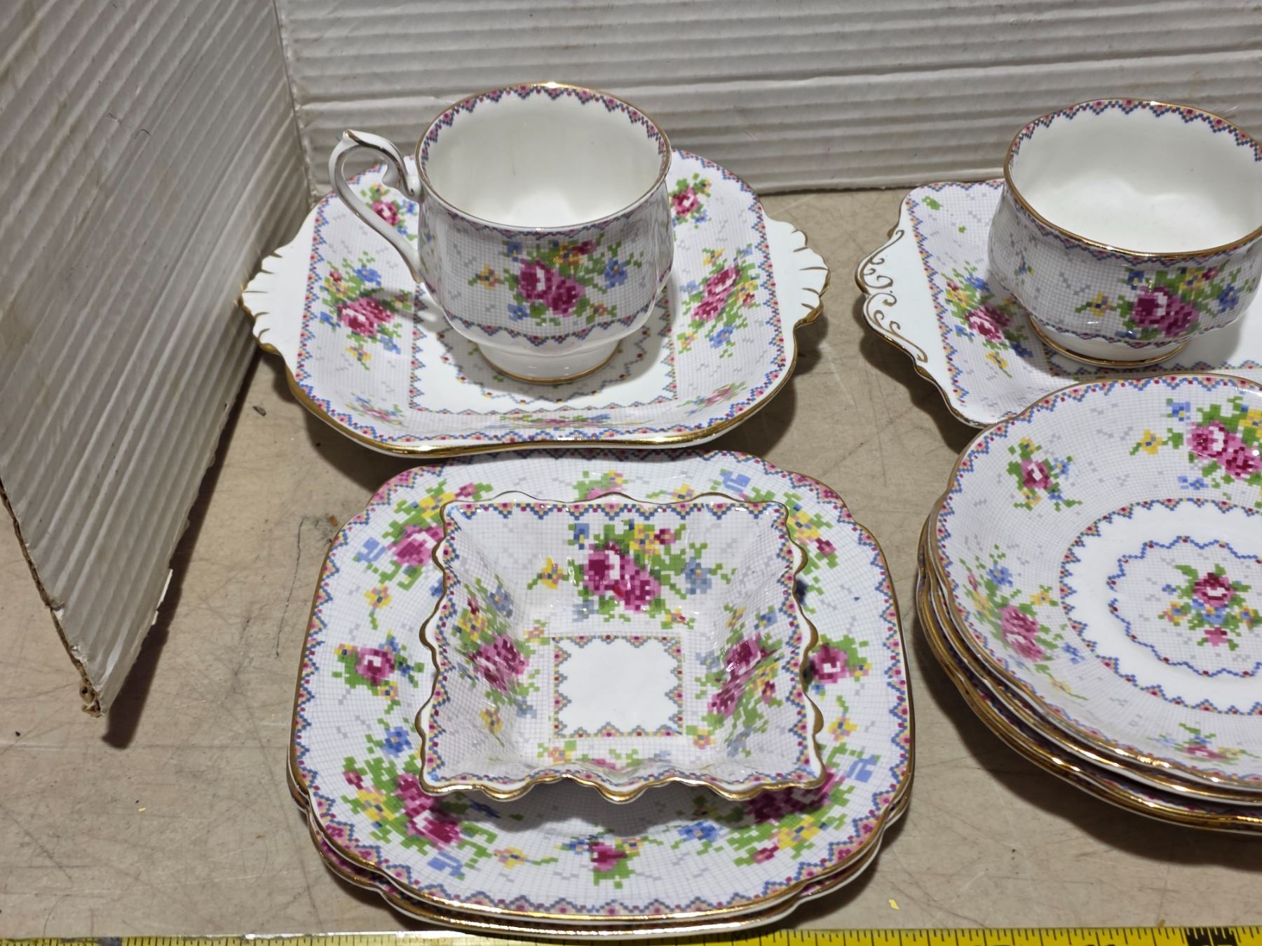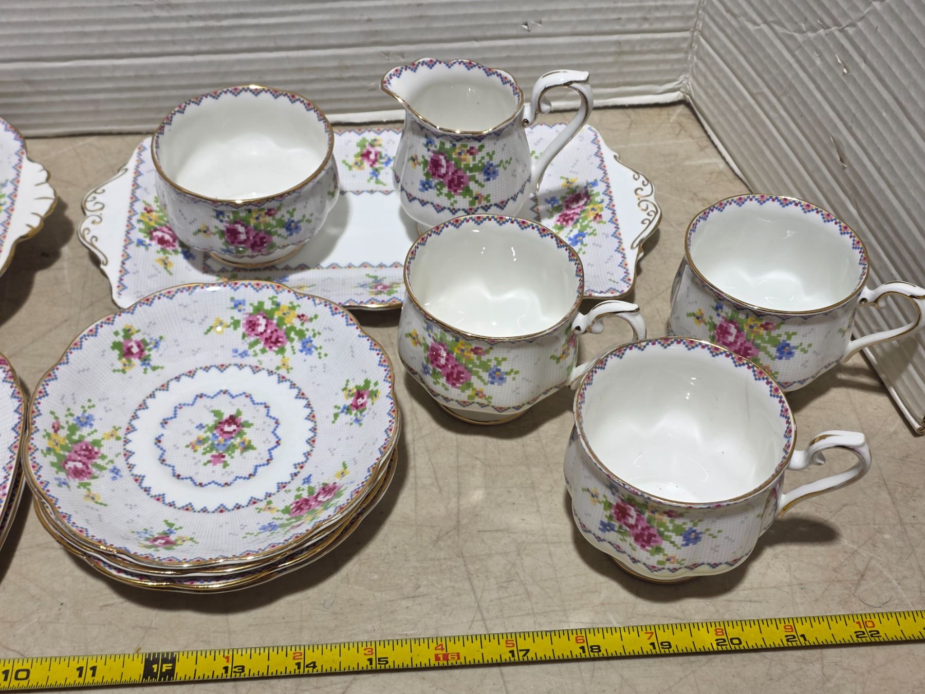 Petit point bone China royal albert- saucers, cups, butter dish
