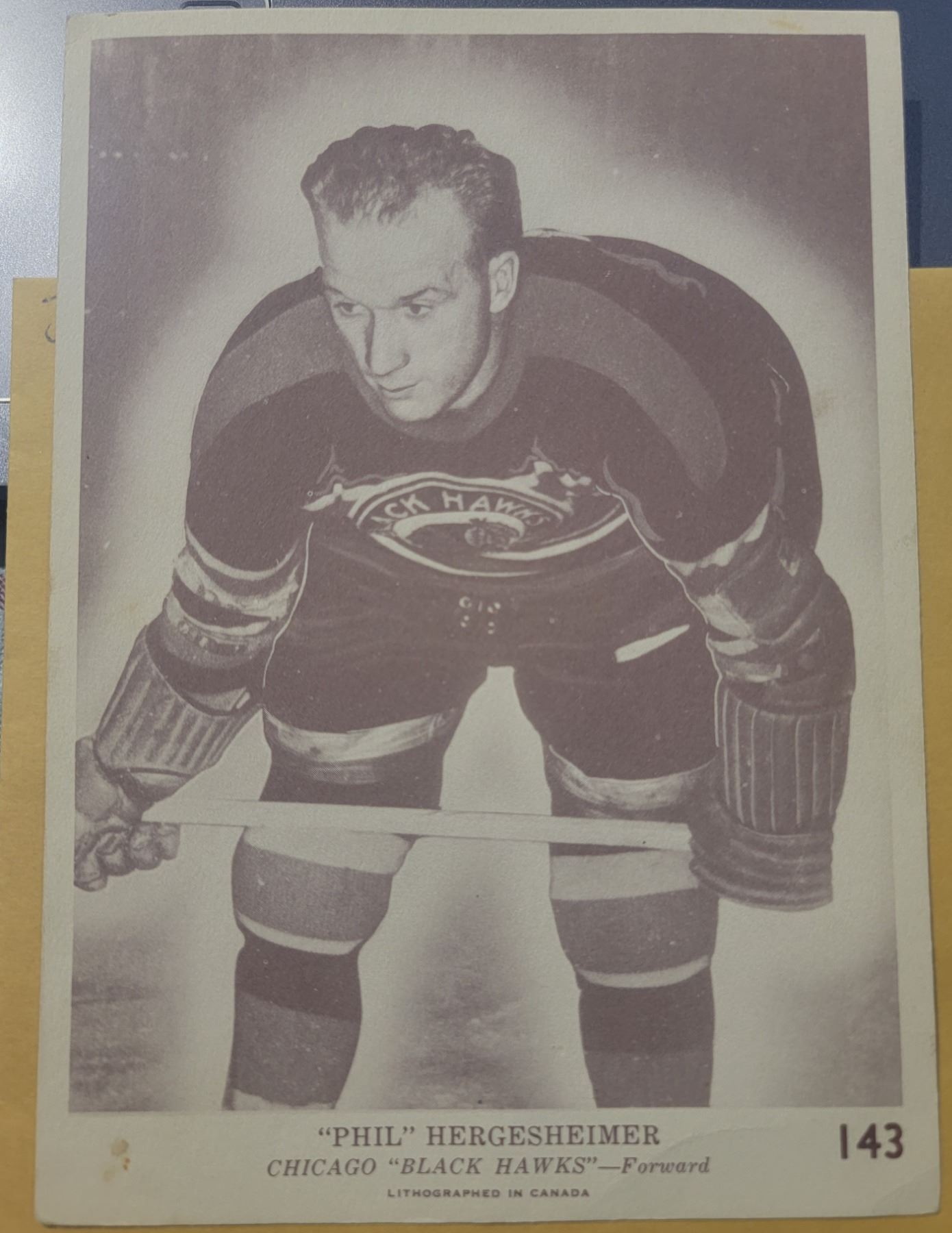 "Phil" Hergesheimer lithographed hockey card 5" x 7"
