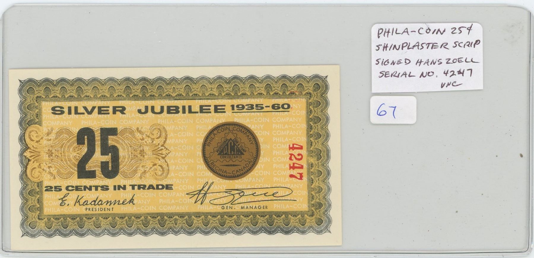 Phila-Coin 1935 – 1960 Silver Jubilee 25 Cents Shinplaster Scrip. Signed by Hans Zoell, legendary Regina coin and stamp dealer, writer and publisher. Serial Number 4247. Unc.