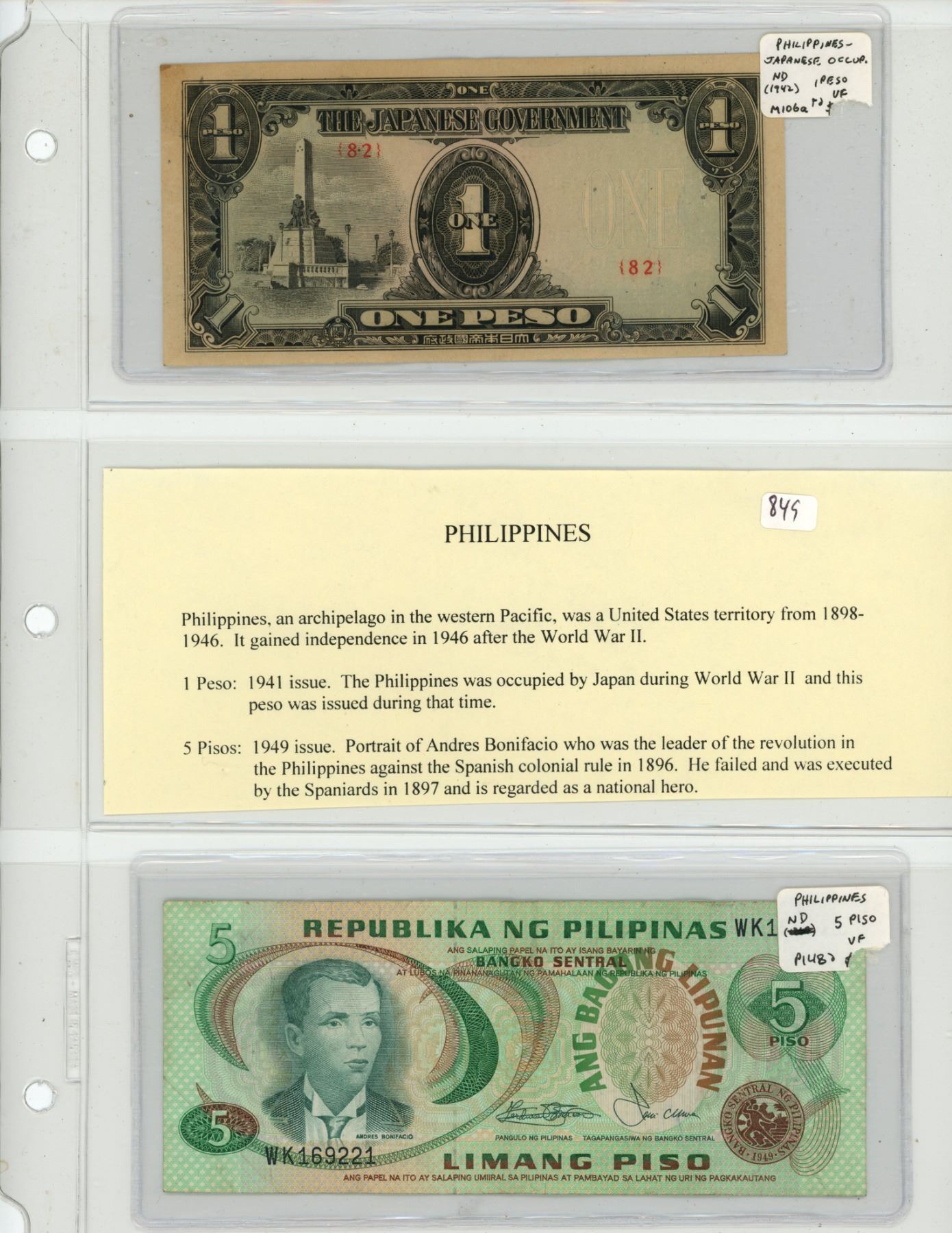 Philippines. Lot of 2 notes: 1942 Japanese Invasion Money 1 Peso M-106a VF and ND 5 Piso P-148 VF.