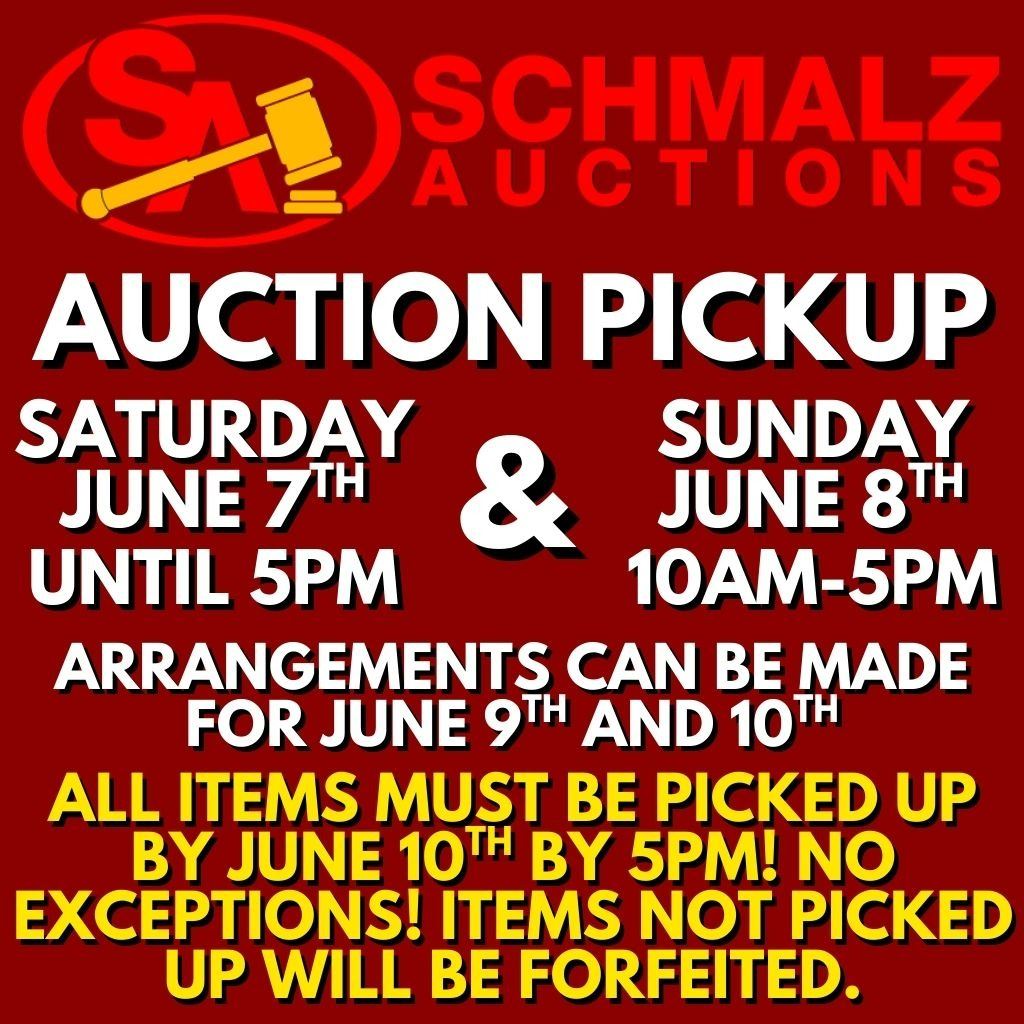 Pickups available sale day until 5pm and Sunday June 8th 10am-5pm. Arrangements can be made for pickup on Monday June 9th, or Tuesday June 10th.