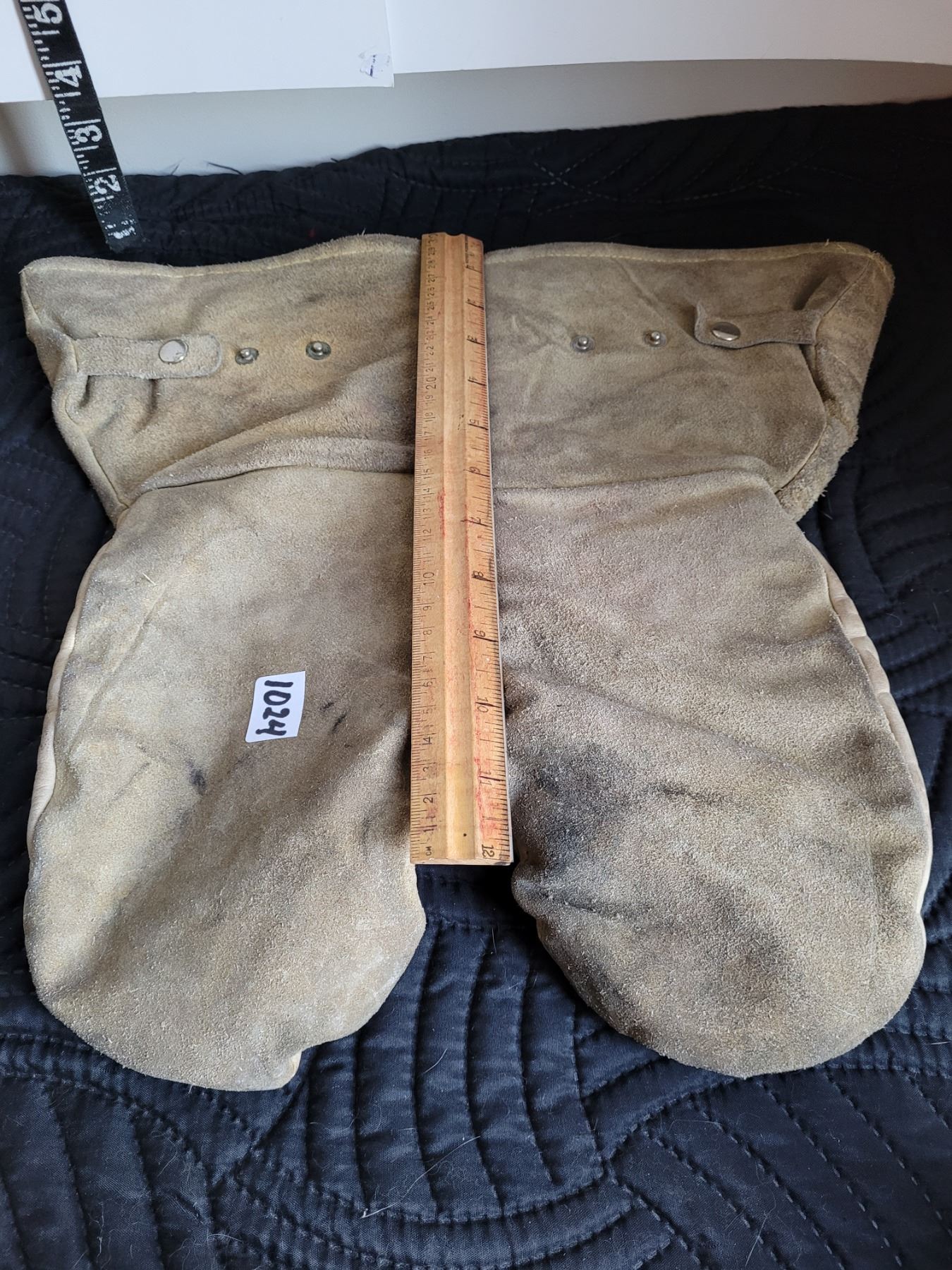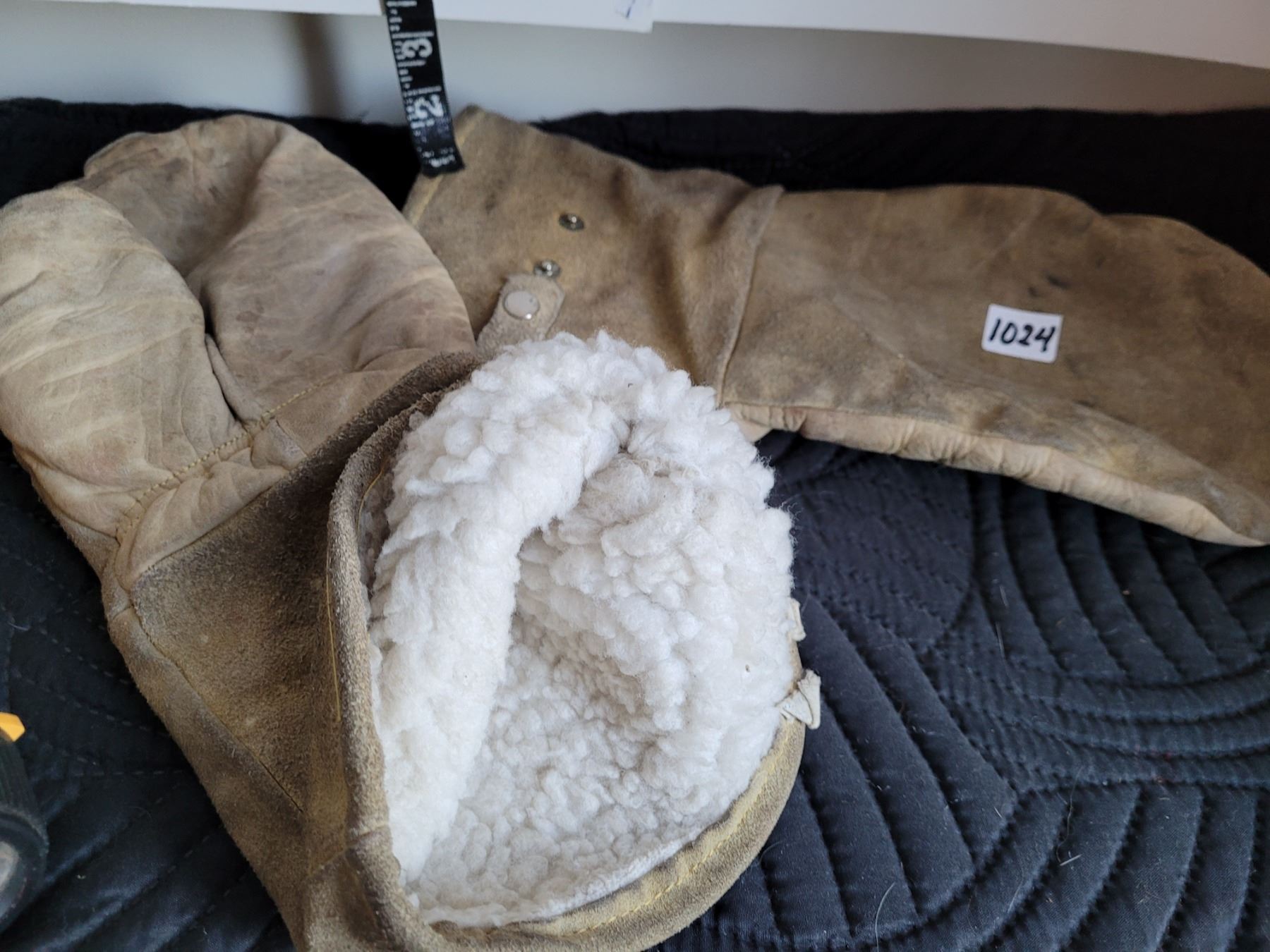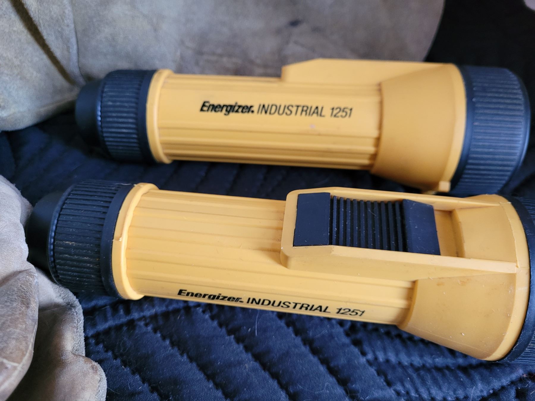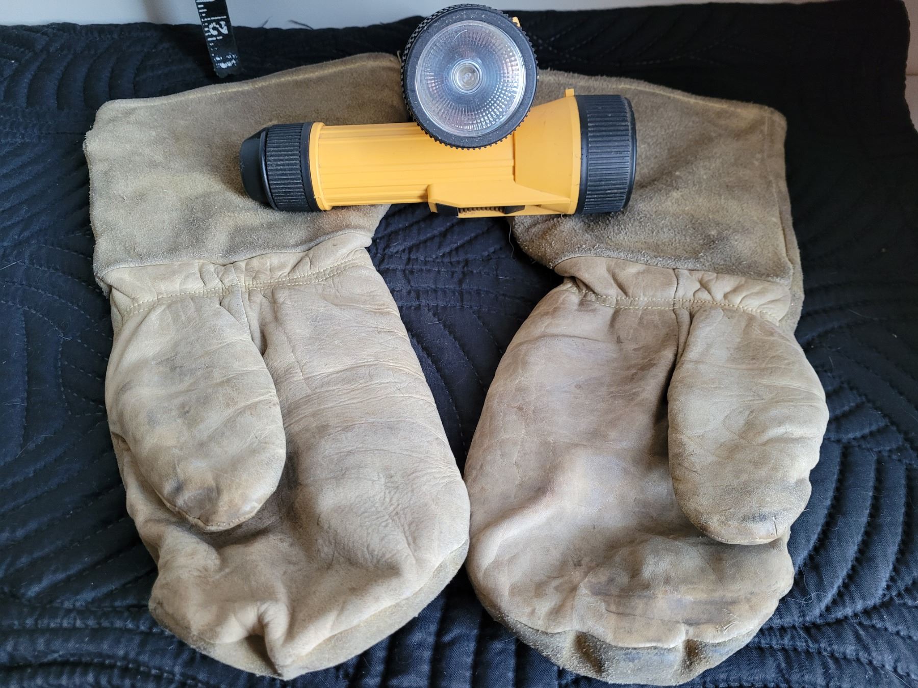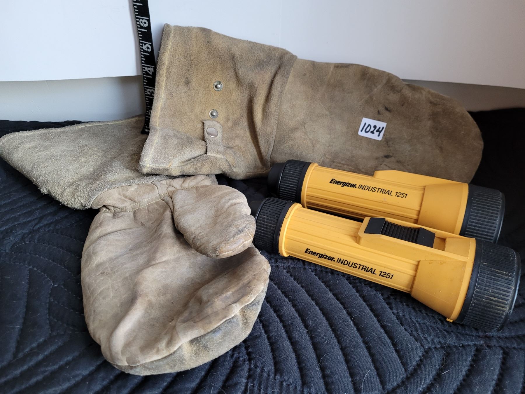 Pile lined leather mitts and 2 Energizer industrial flashlights.