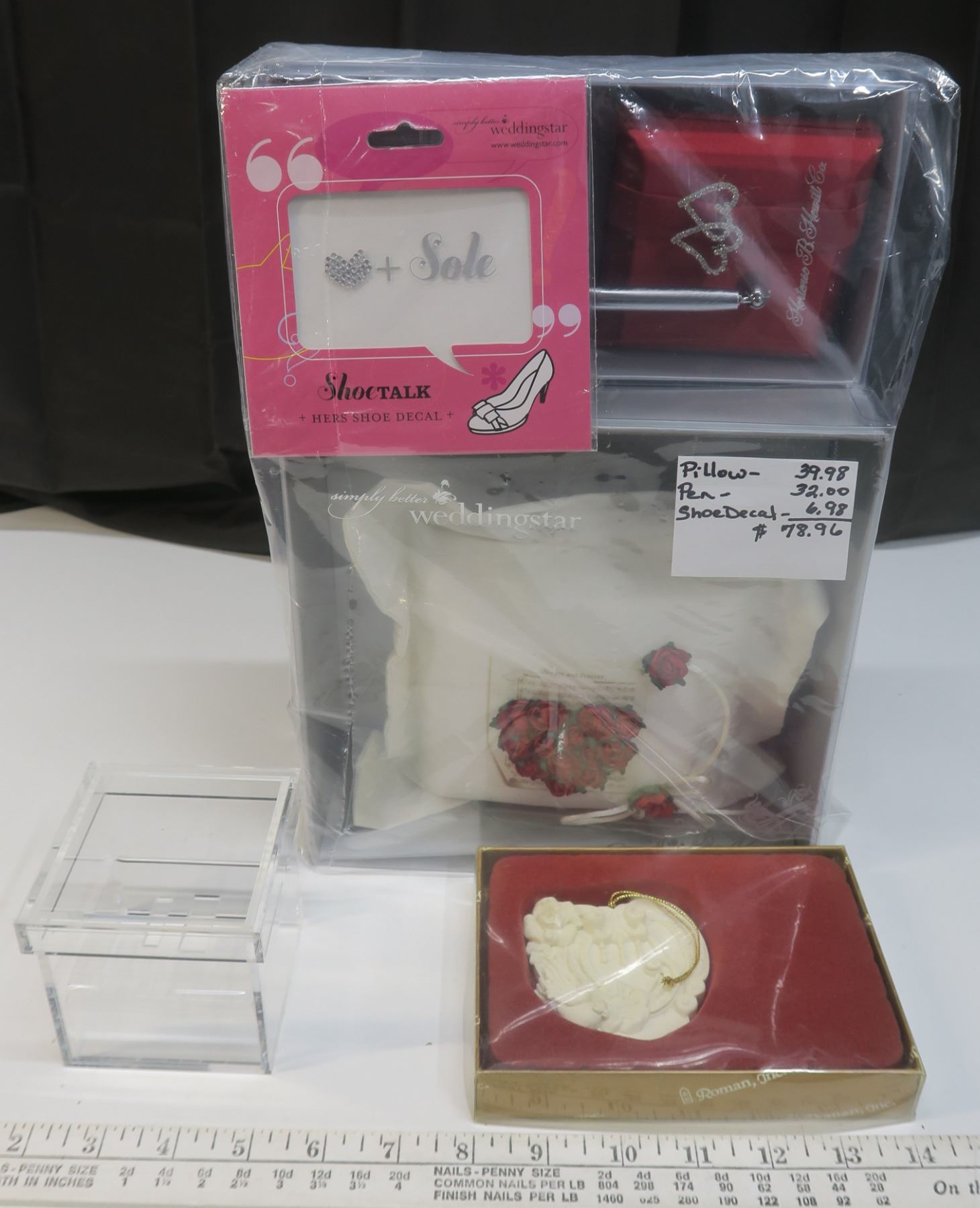 Pillow + Pen + Shoe Decal + Clear Ring box + ornament