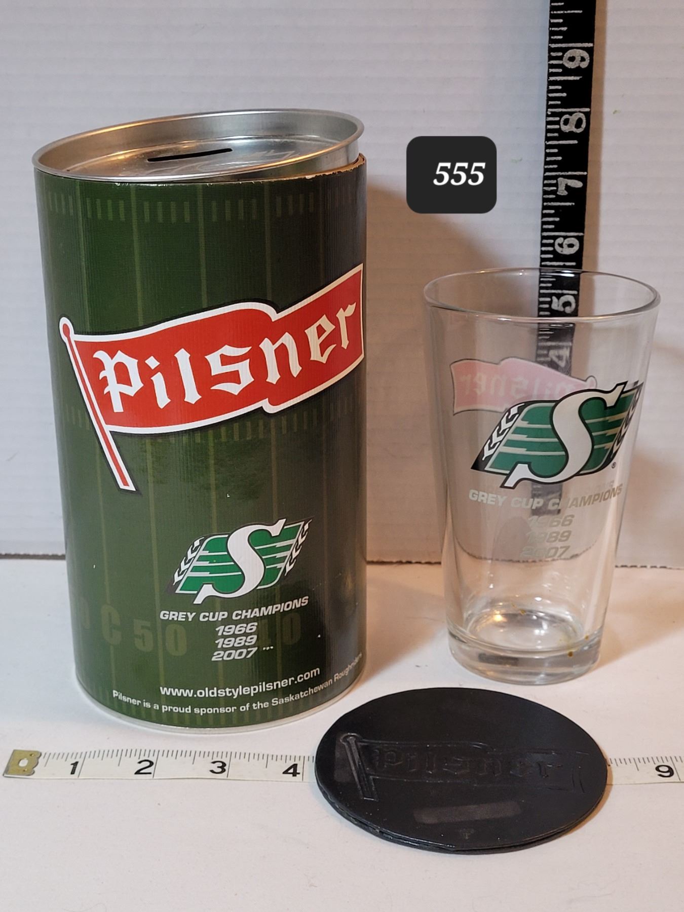 Pilsner Can bank, Roughrider glass & coaster.