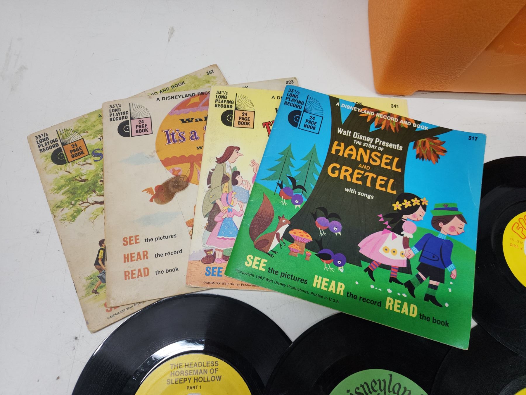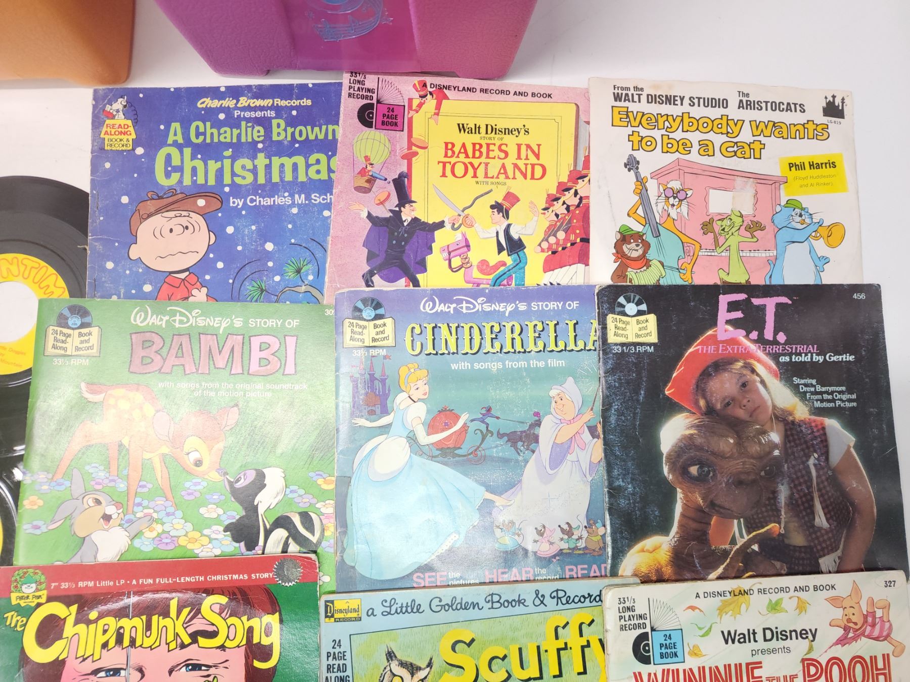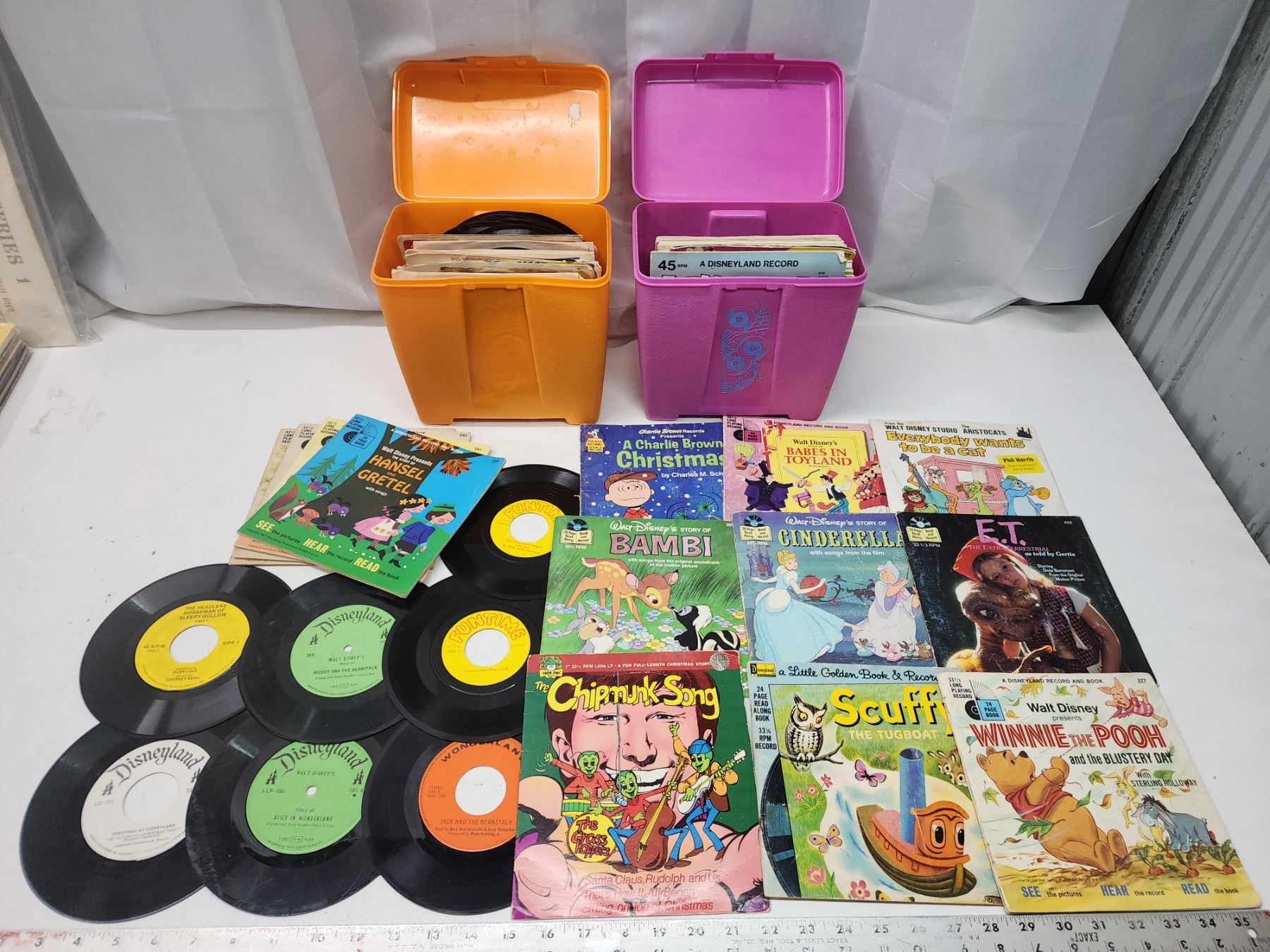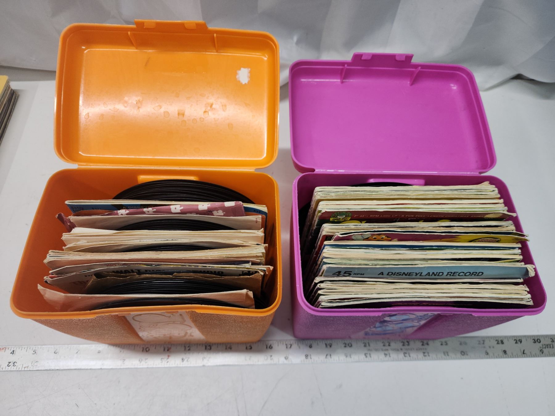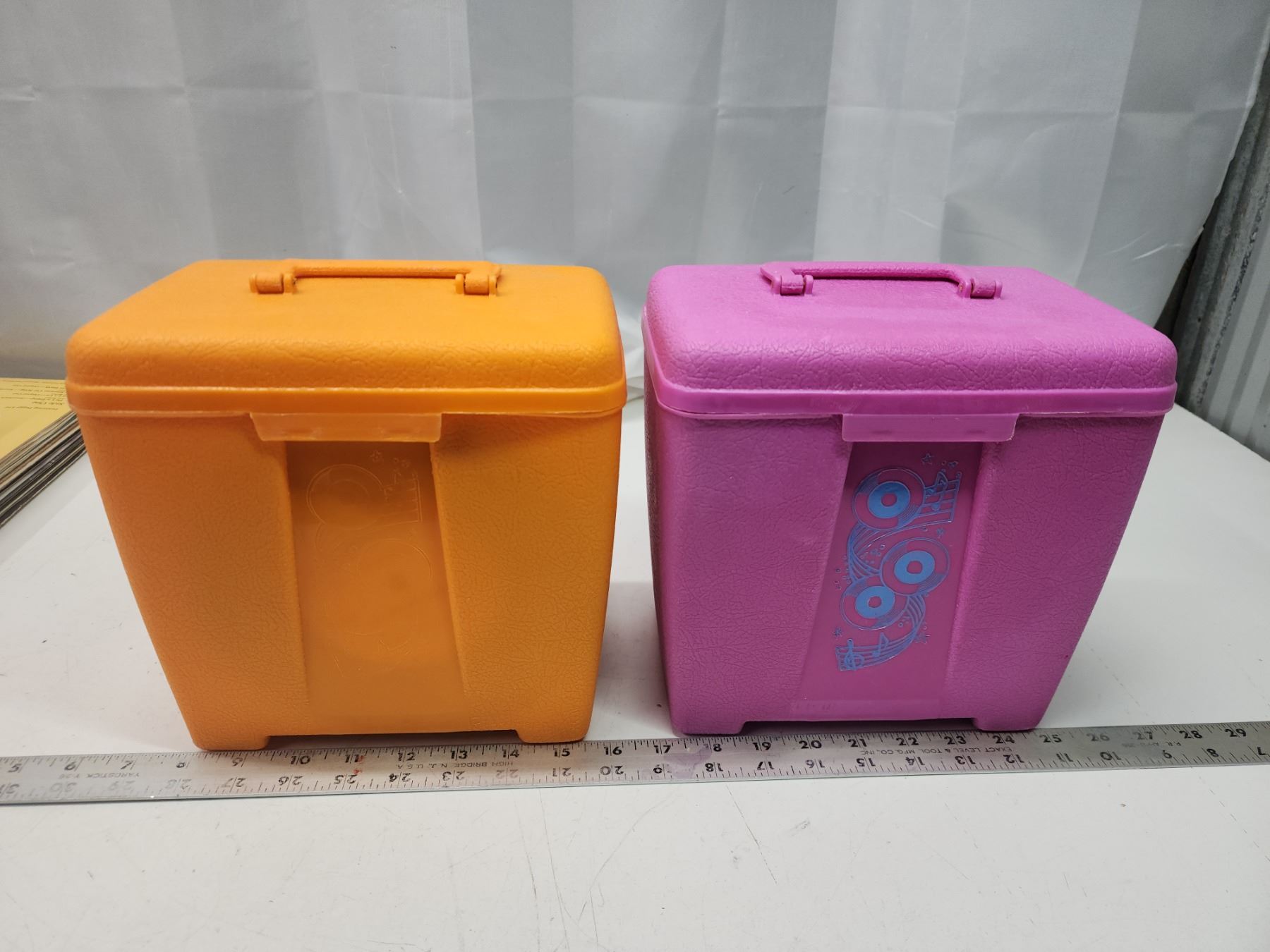 Pink & Orange containers - filled with kid's small 33rpm vinyl records