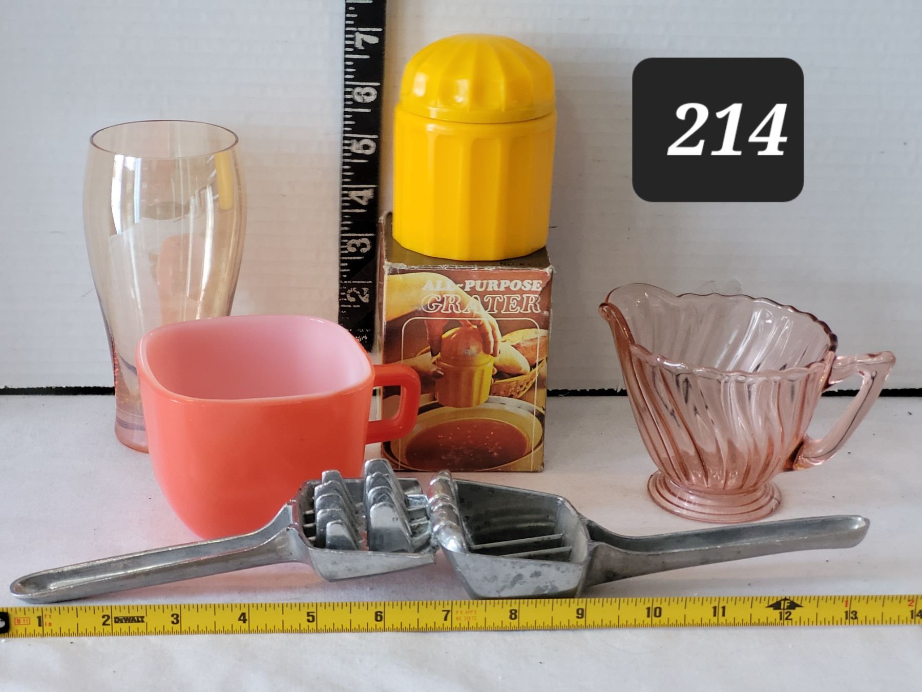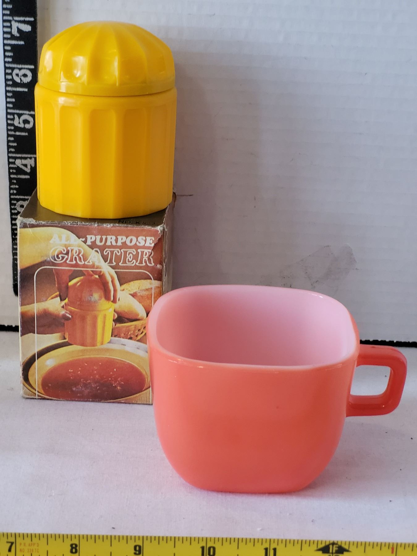 Pink depression glass creamer, peach tumbler, orange glassbake Lipton's soup cup, boxed grater & 1960's ironware ice crusher.