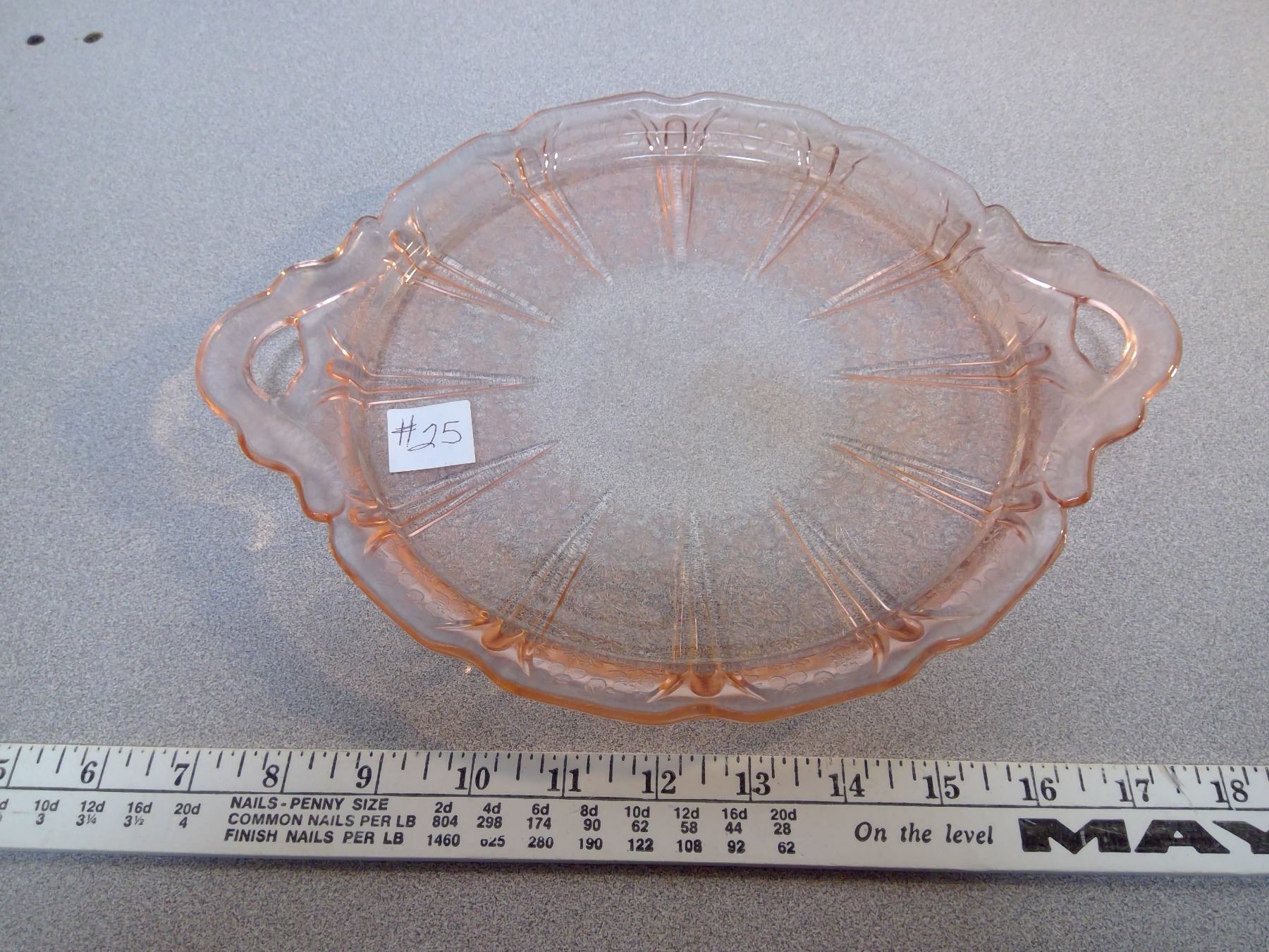 Pink depression glass handled tray, “Cherry Blossom” pattern, 10 ¾” x 13”