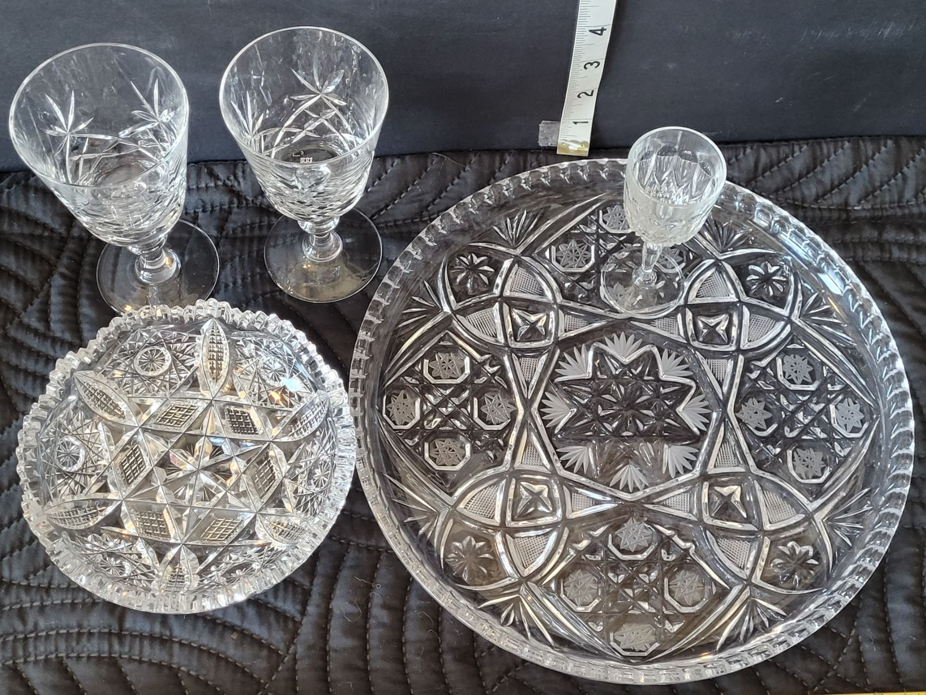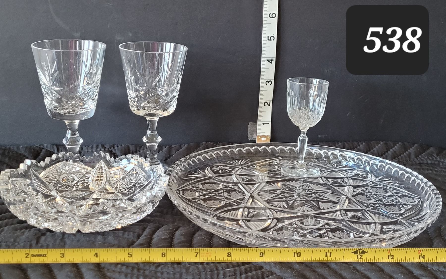 Pinwheel lead crystal. Cake platter, wine glasses & pickle dish.