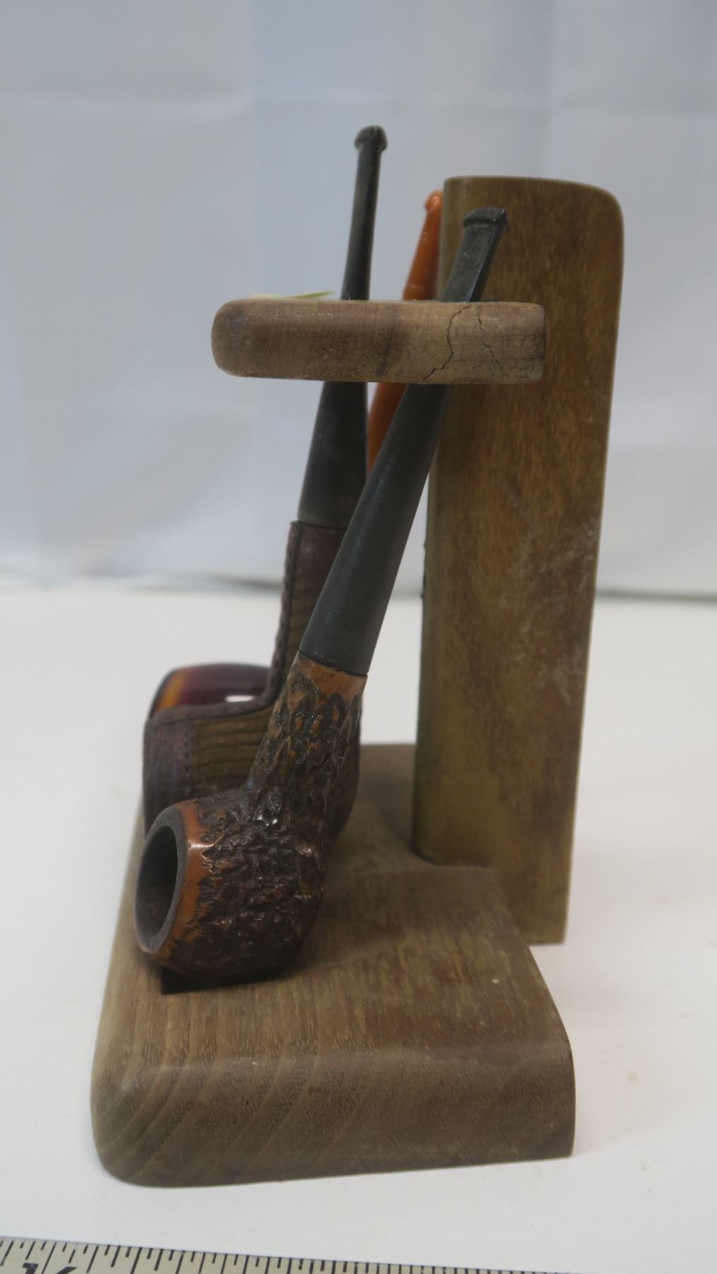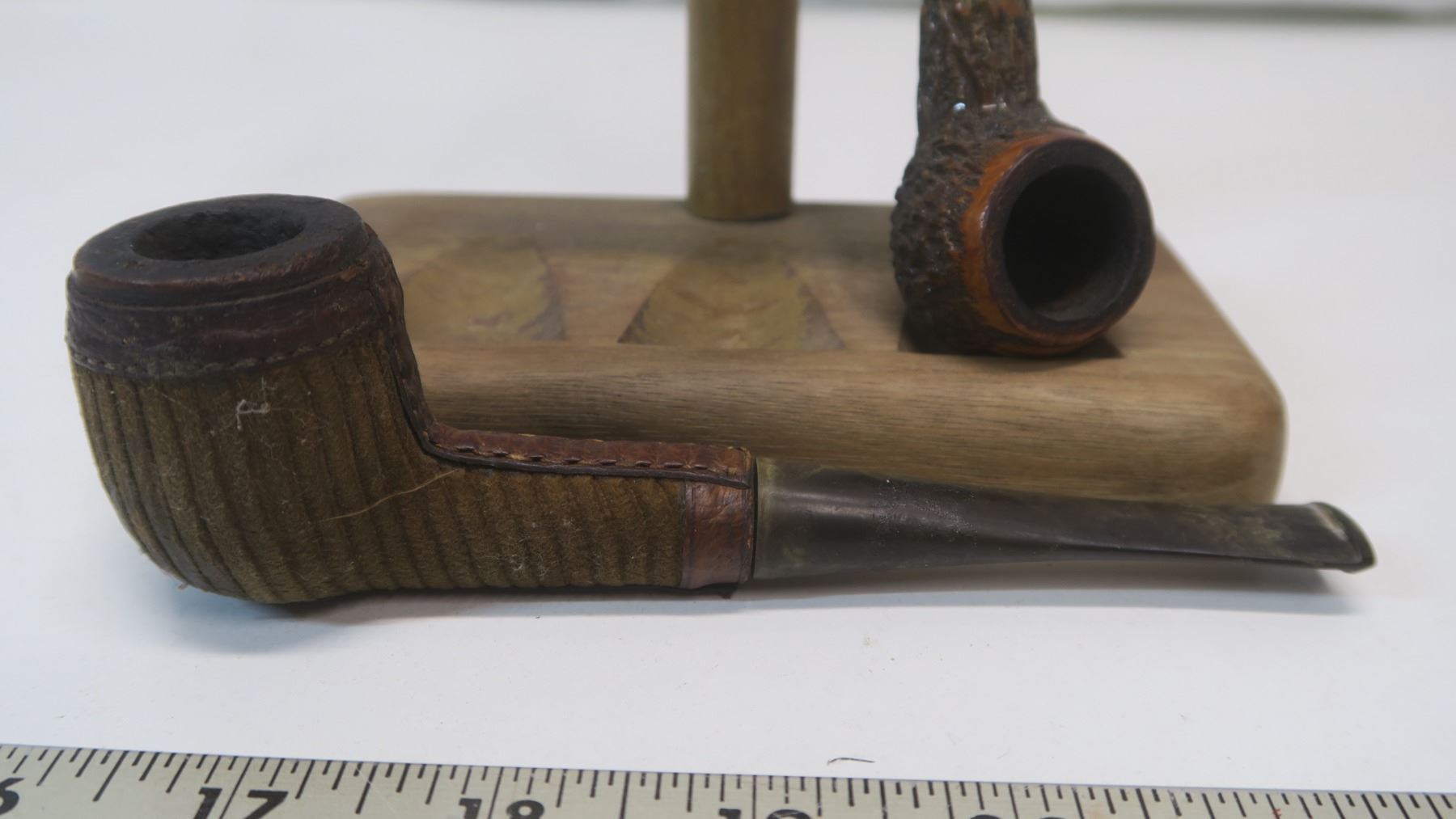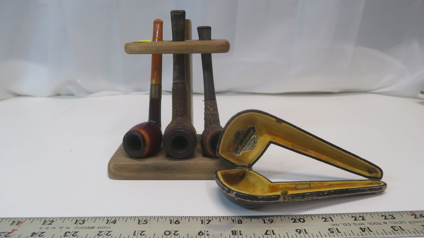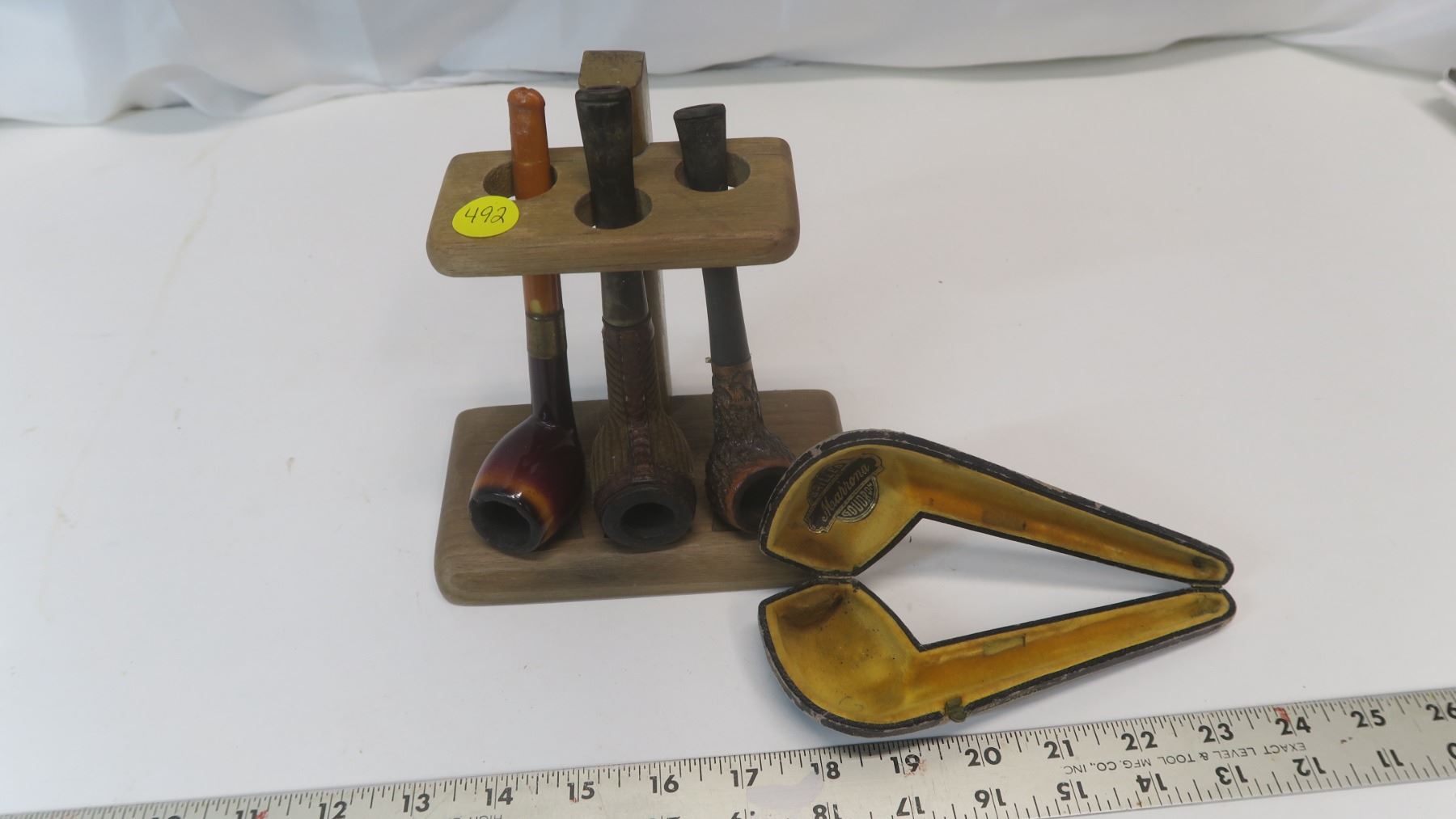 Pipe smokers set, 3 vintage pipes, pipe stand, vintage pipe case.