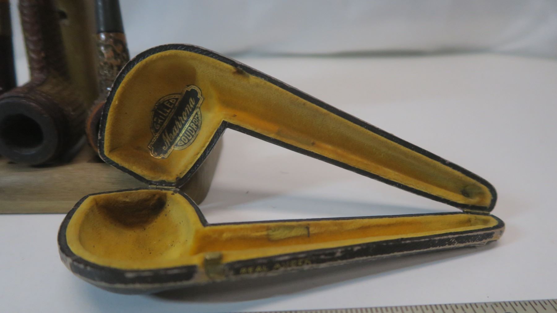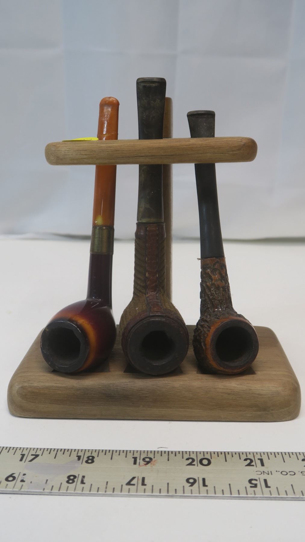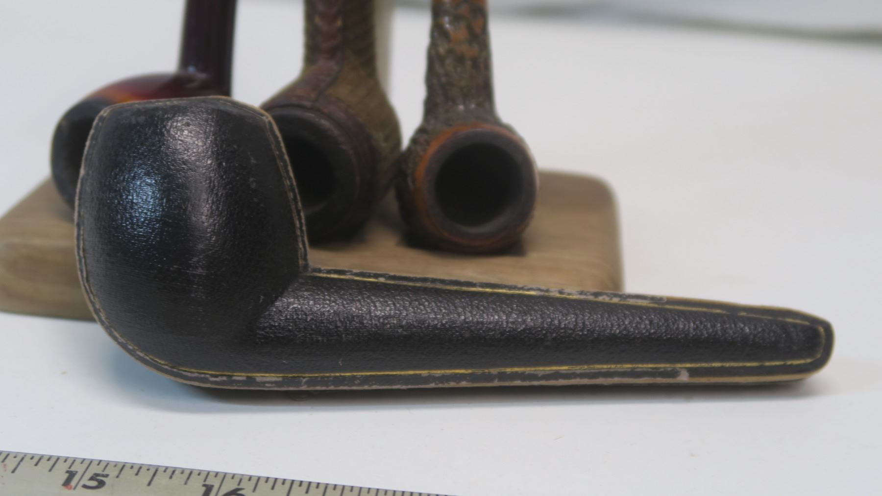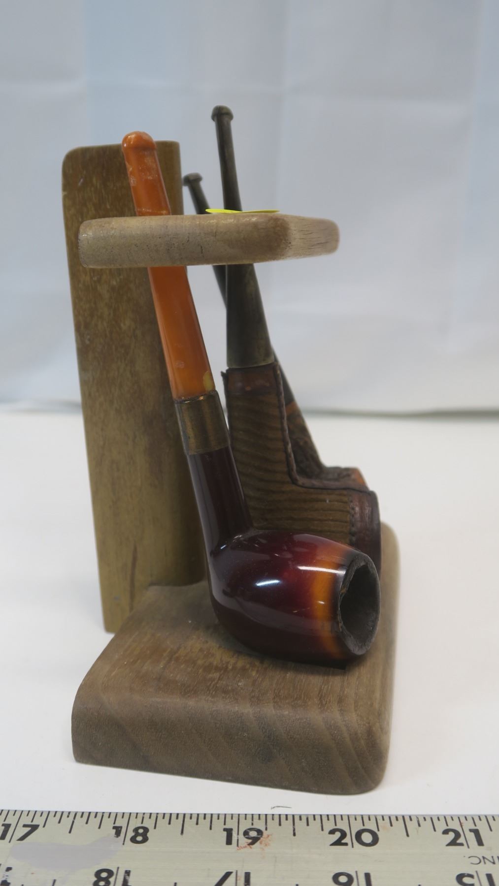 Pipe smokers set, 3 vintage pipes, pipe stand, vintage pipe case.