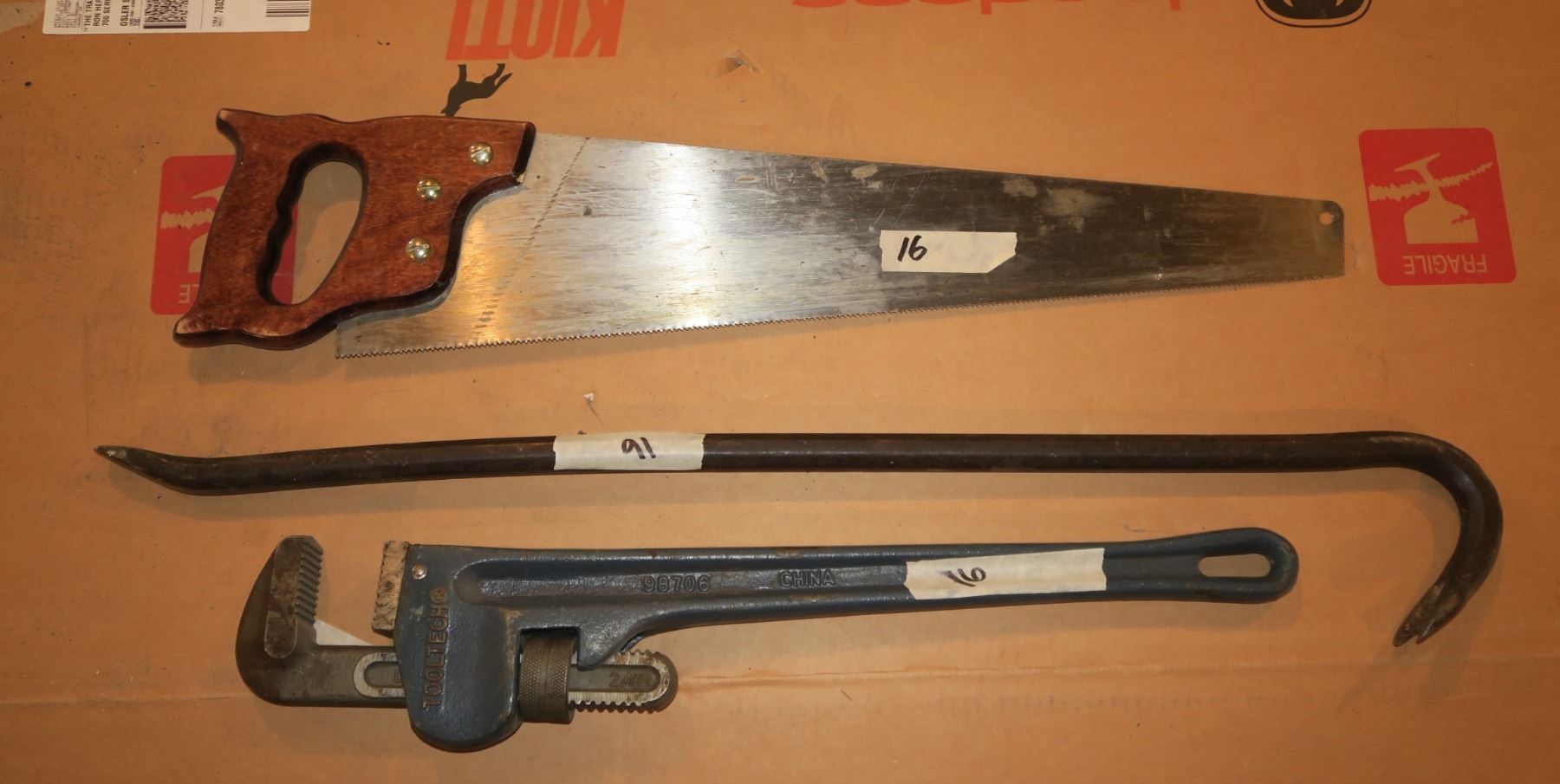 Pipe wrench, goose neck & saw