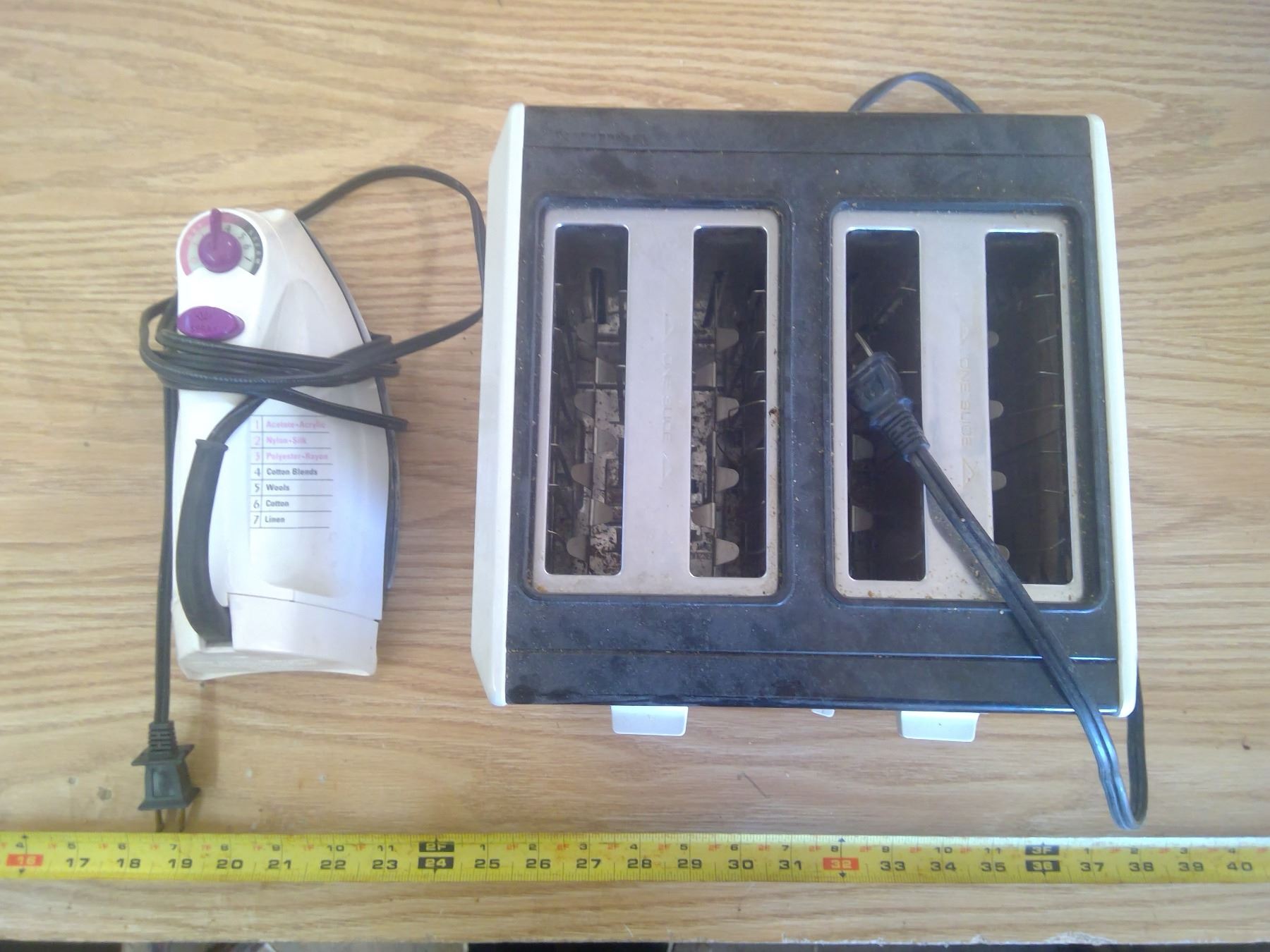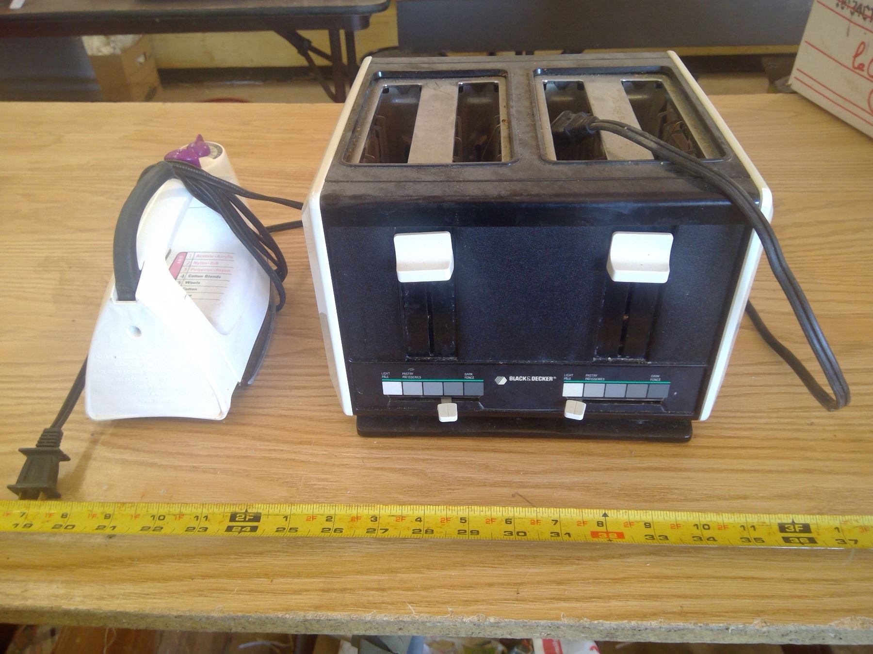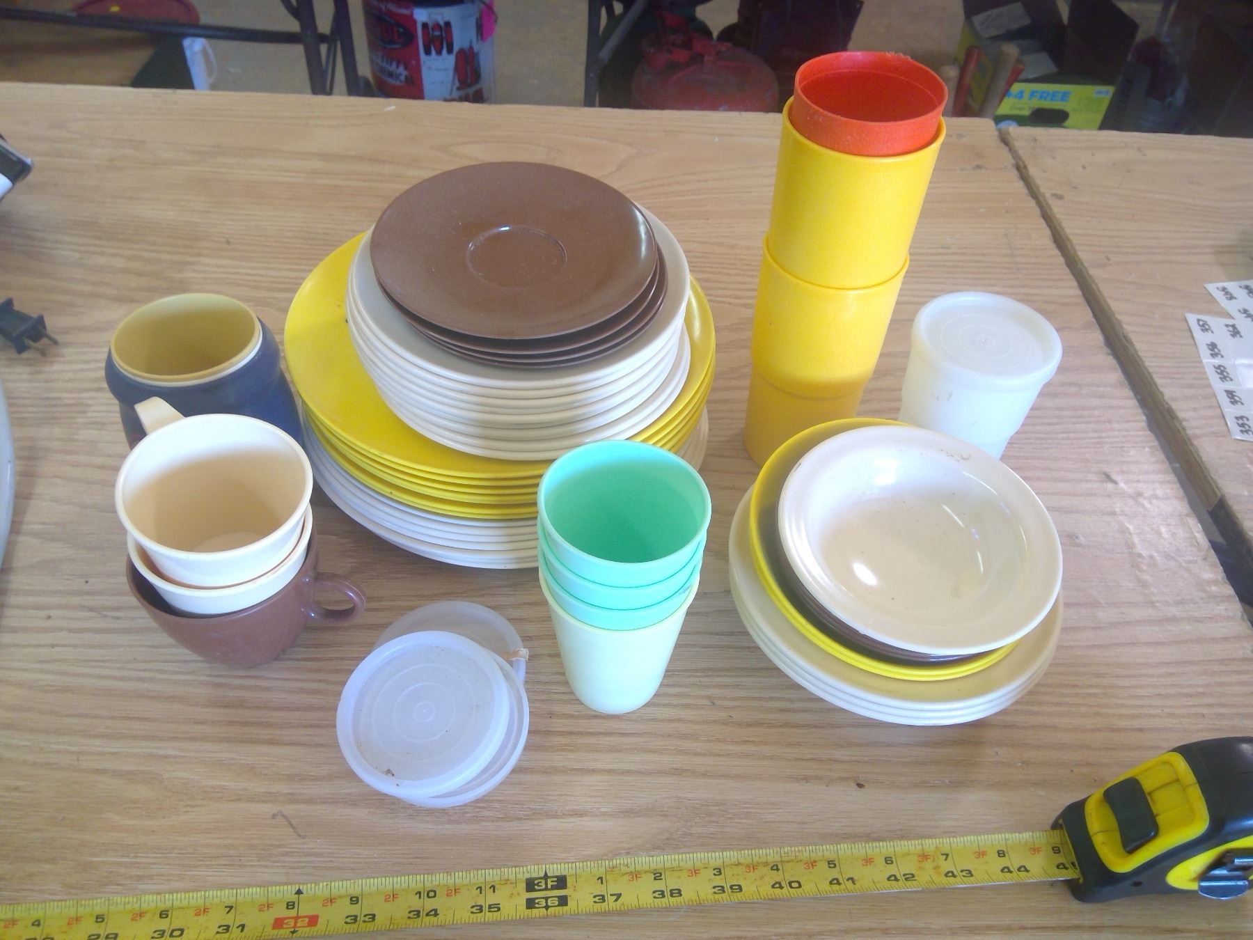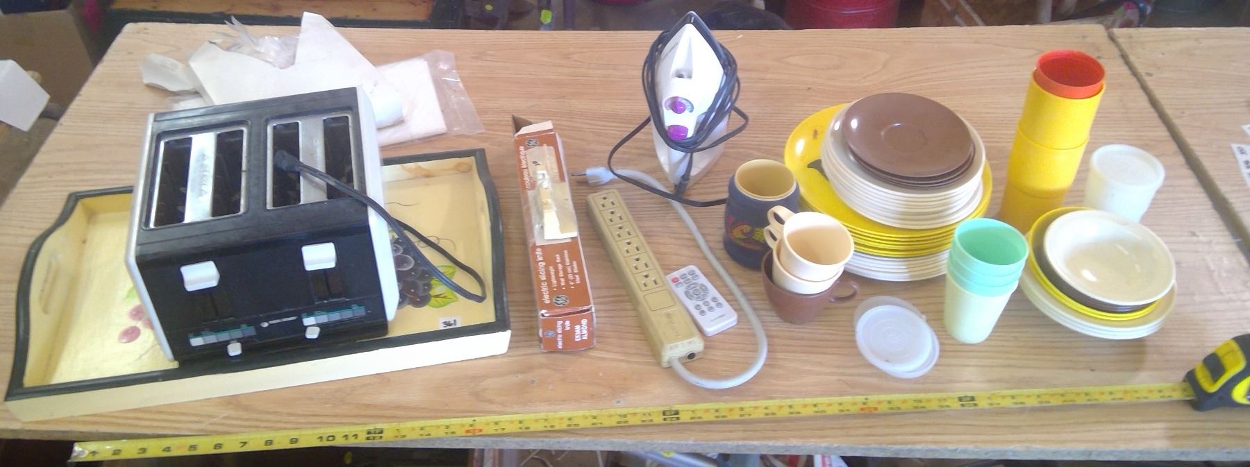 Plastic Camping Gear (Cups, Plates, etc.), Iron, Toaster, and Serving Tray
