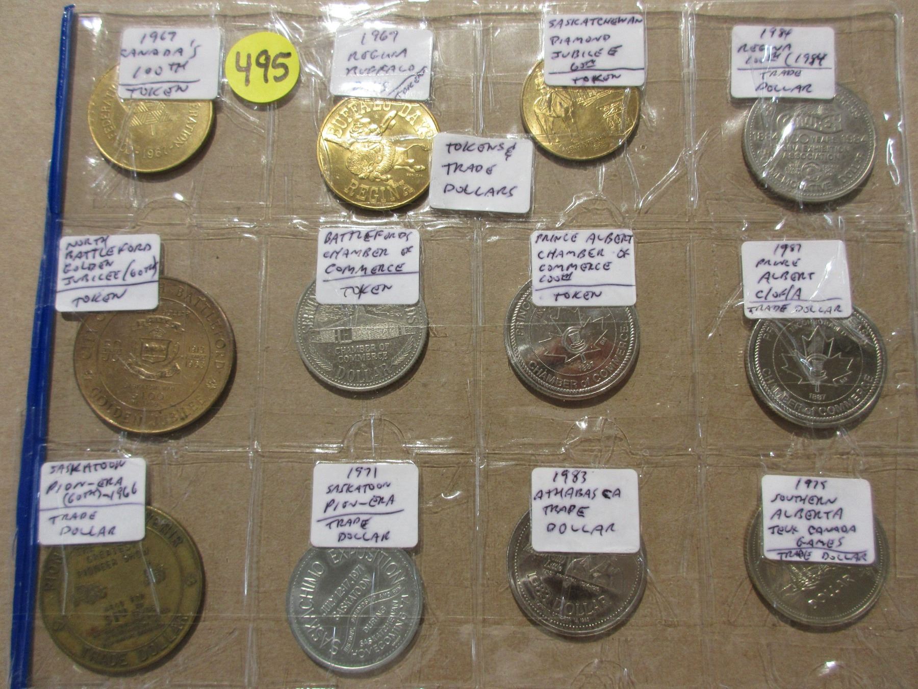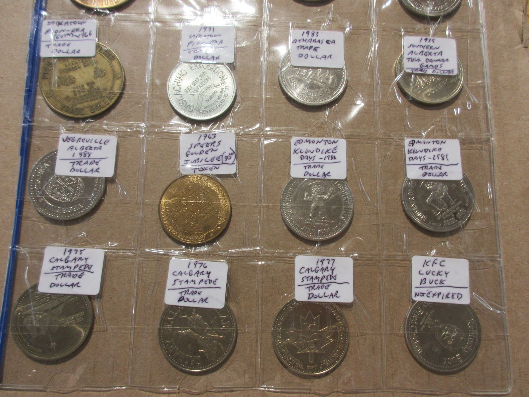 Plastic page of 20 tokens & trade dollars- mixed years & coins