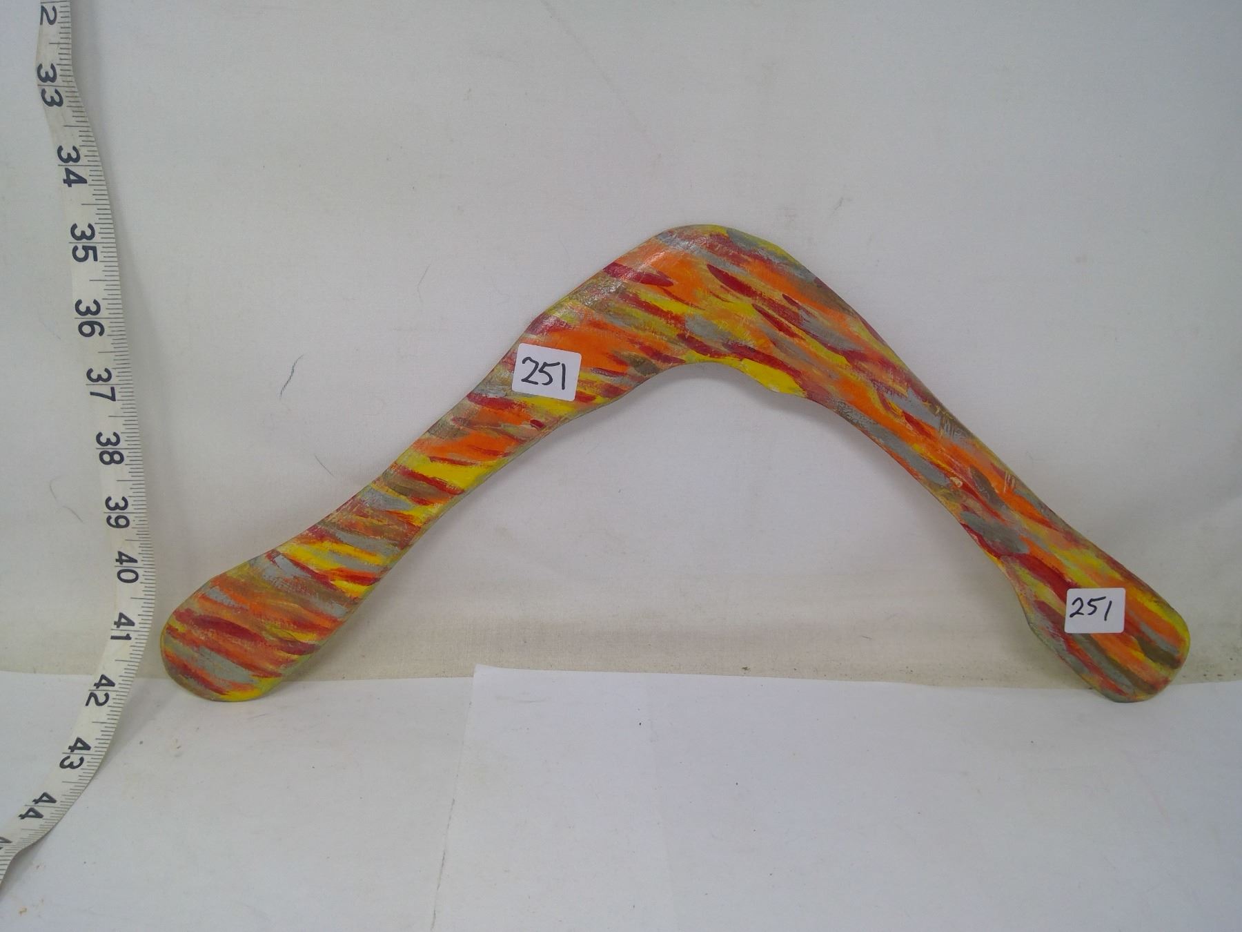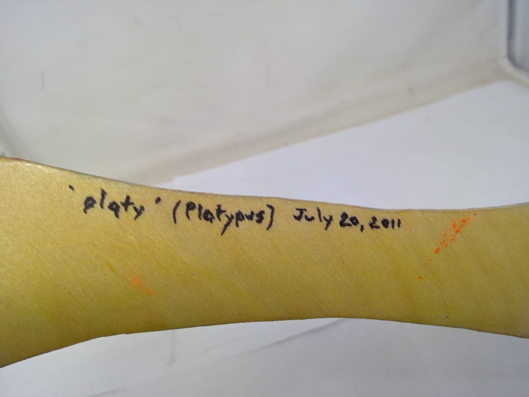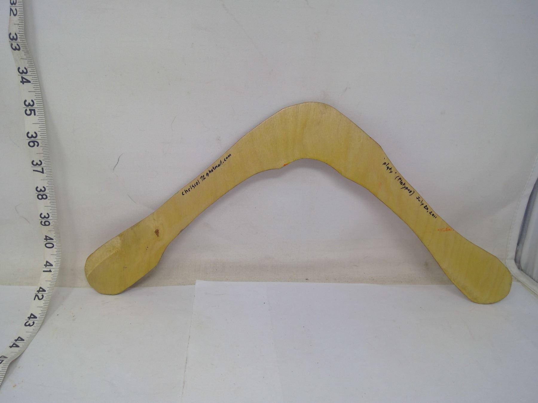 “Platypus” boomerang. 35-meter range. Right hander carved by Chris Collins, 2011. Baltic birch composite. Span: 17”.