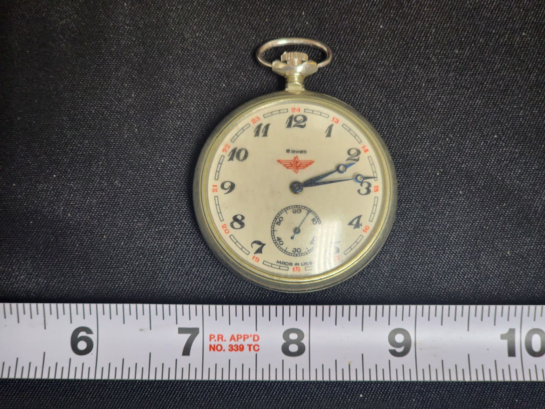 Serial # 743561 Locomotive on back, works when laying on face. Keeps time, size 16
