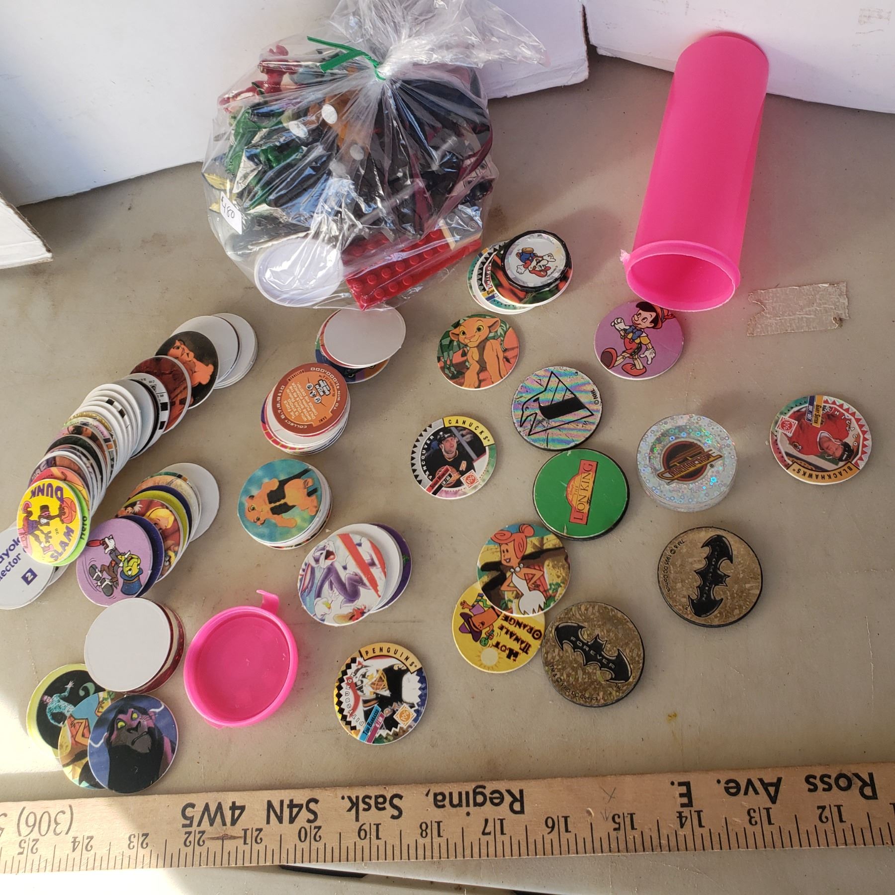 Pogs and slamers and smal bag of misc