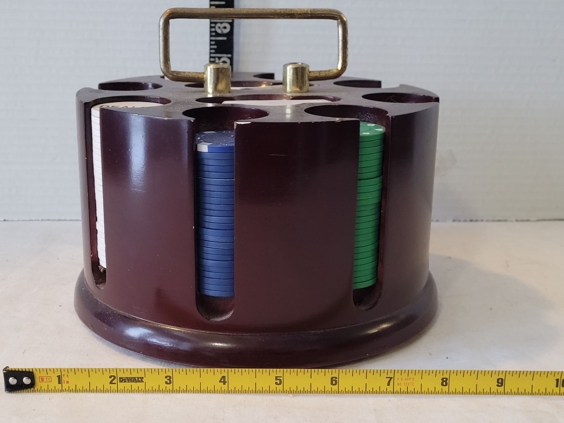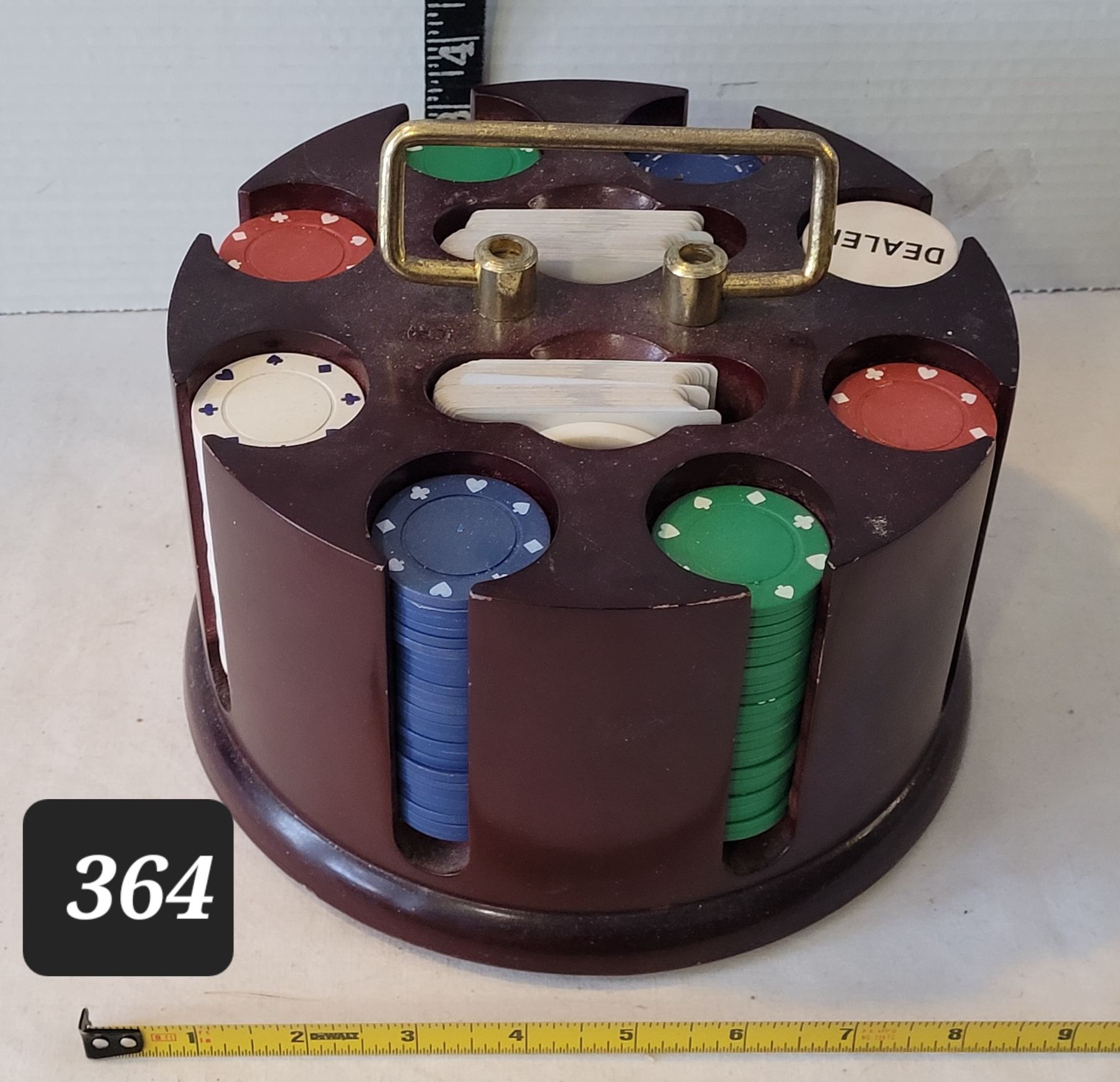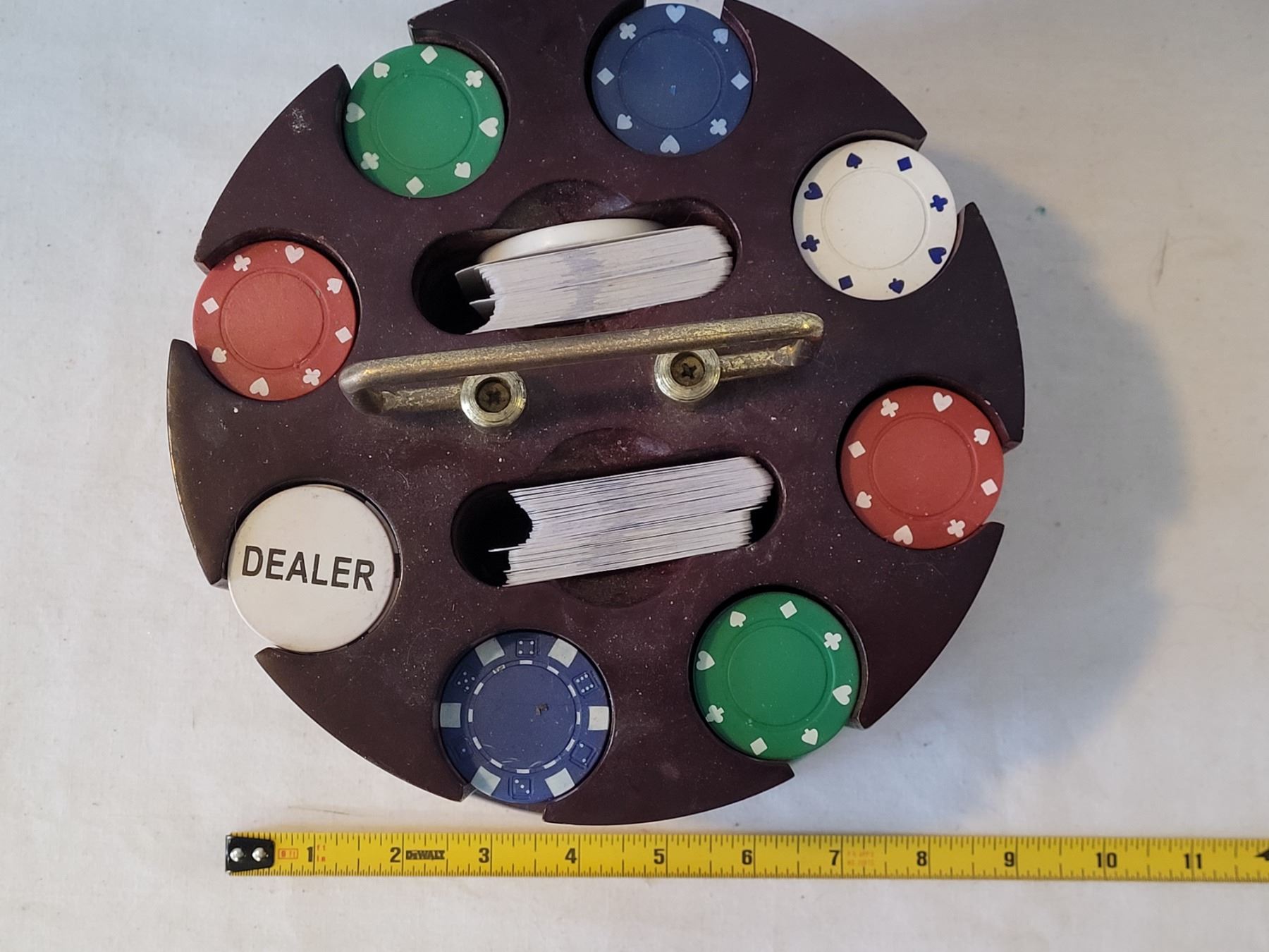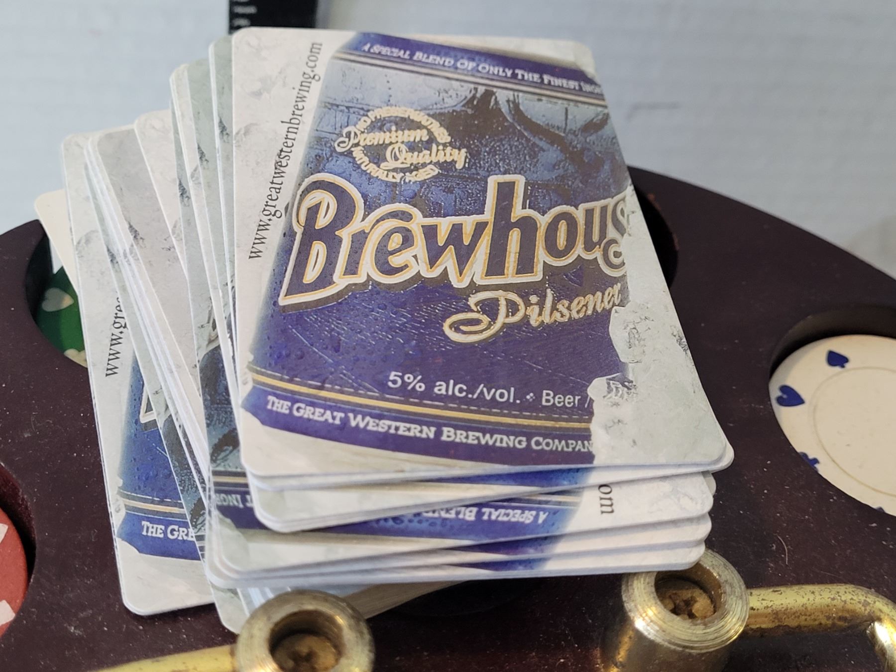 Poker chip carousel with 2 decks of Pilsner Brewhouse playing cards.