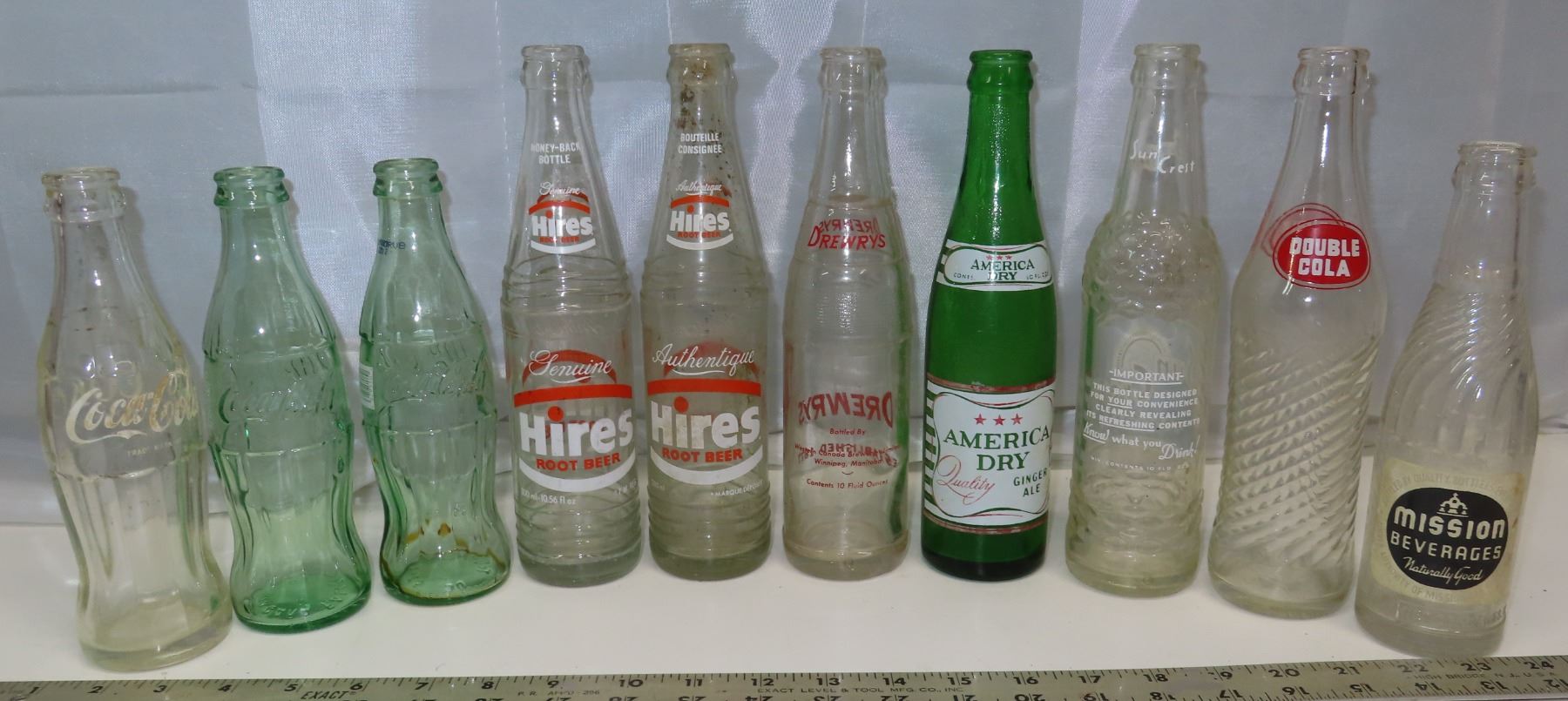 Pop bottle lot (Double Cola, Sun Crest, Drewry's America Dry, Mission, Hires, Coca-Cola (10 bottles total)