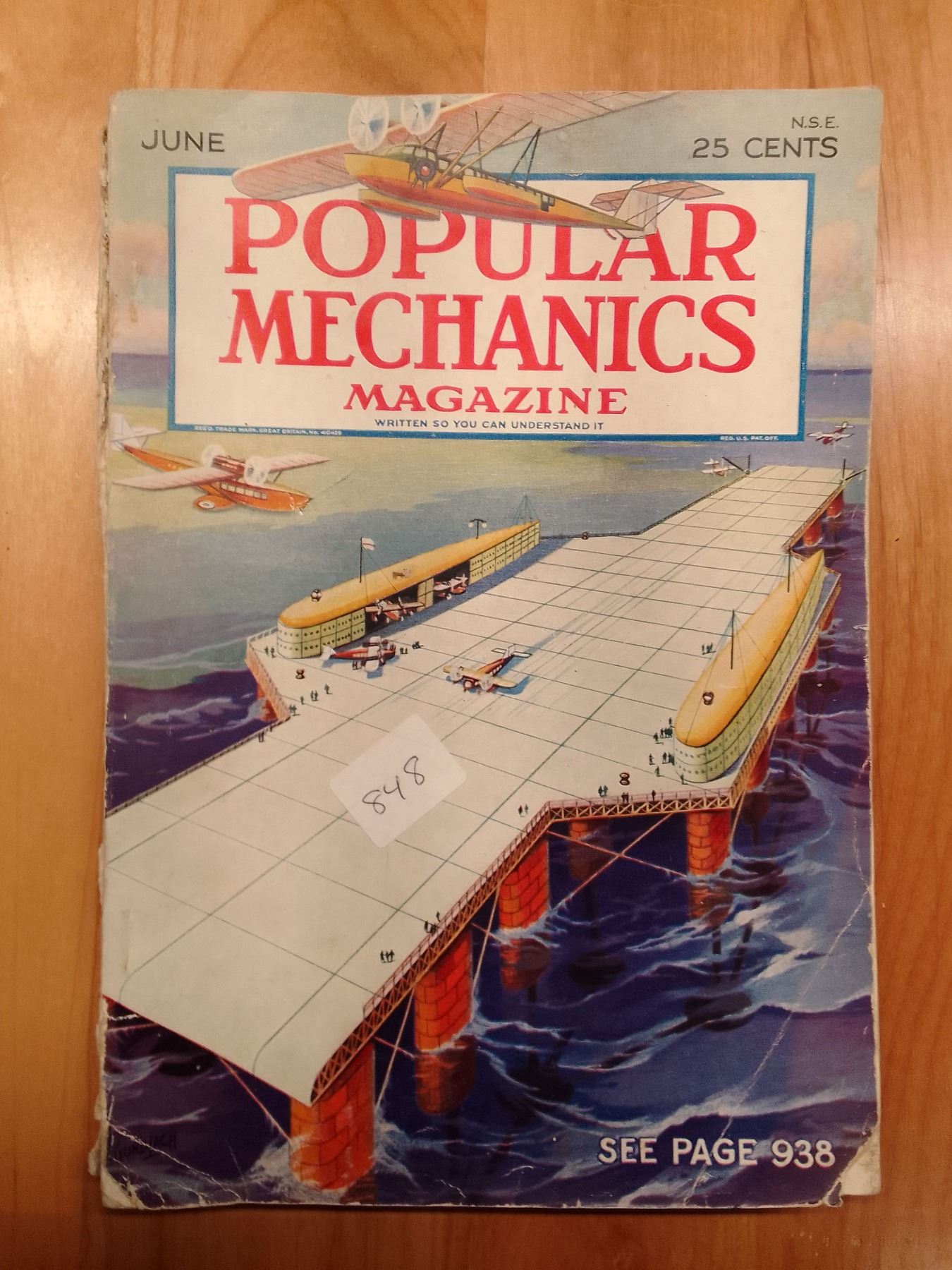 Popular Mechanics June 1929: Armstrong's Floating Seadrome Ocean Airport Cover- This June 1929 issue of Popular Mechanics features a striking cover illustration of Edward R. Armstrong's visionary "seadrome"—a massive floating airport platform on the ocean, with planes landing and taking off (see page 938). Priced at 25 cents, it captures the late 1920s excitement for revolutionary aviation concepts to enable safe transatlantic flight through mid-ocean refueling stations.