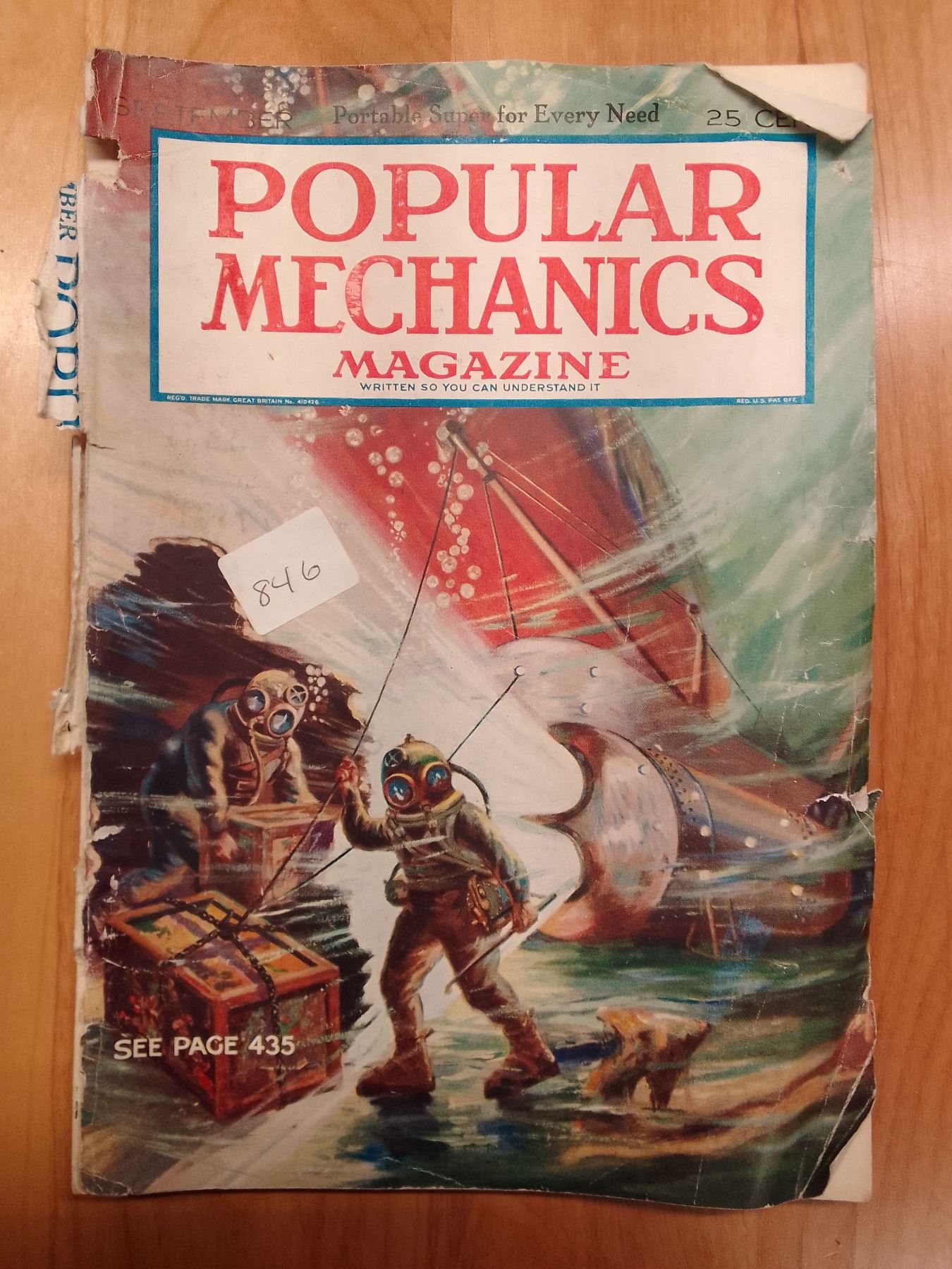 Popular Mechanics Sept 1925: Underwater Treasure Diver & Sunken Ship Adventure Cover - This September 1925 issue of Popular Mechanics showcases a vivid cover illustration of deep-sea divers recovering treasure from a sunken shipwreck, with open chests spilling gold amid dramatic underwater rays. Priced at 25 cents, it highlights early 20th-century fascination with salvage operations, exploration, and marine technology in an era of adventure and innovation.