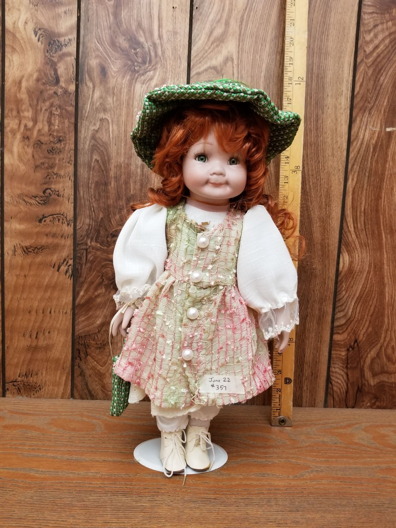 Porcelain Doll in white, pink and green dress with green hat and handbag