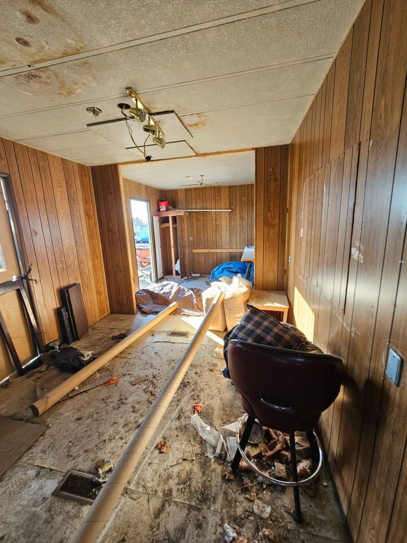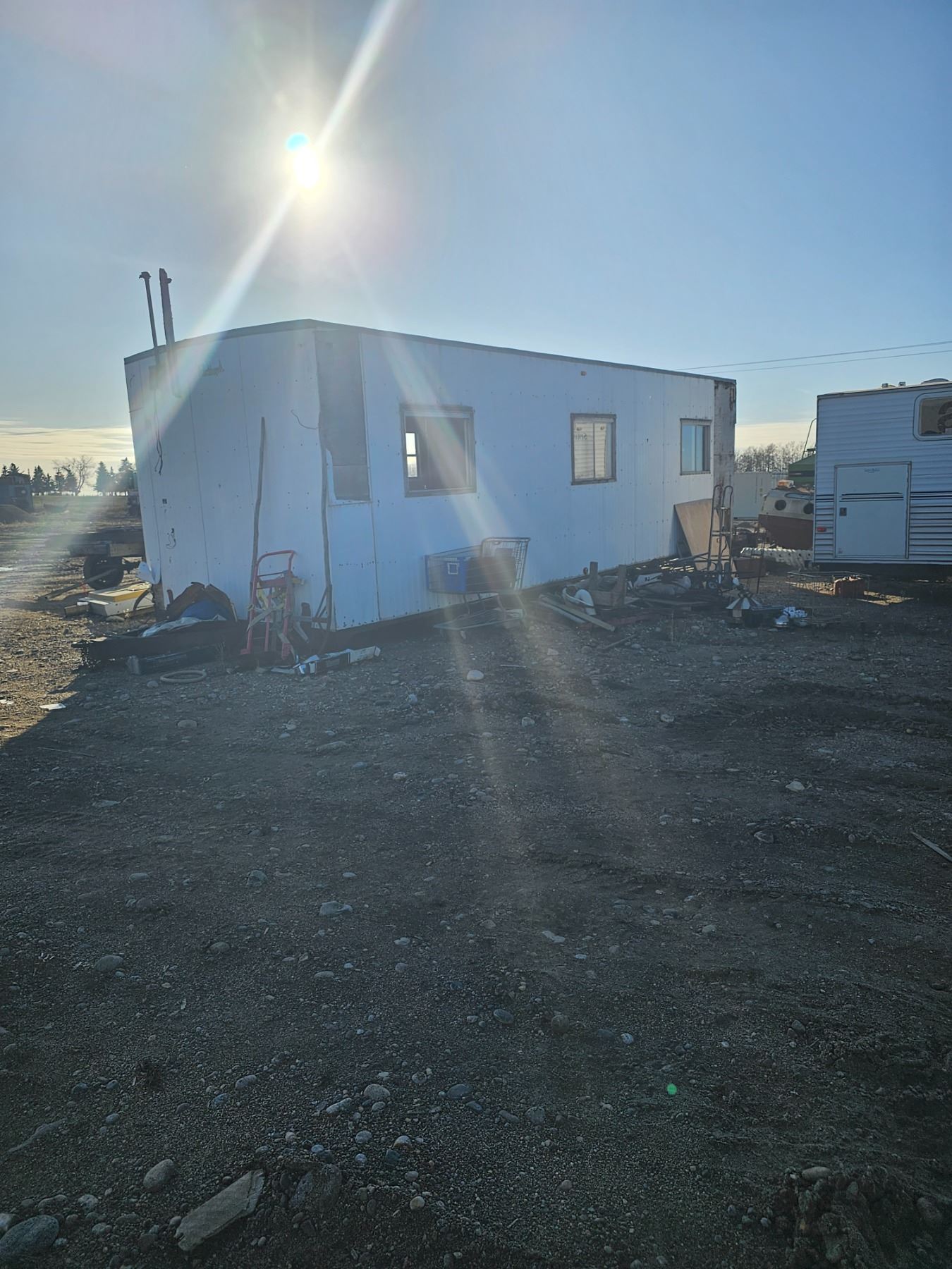 Has axle but no wheels, tow hitch on front, 3 door access on one side, air ducts for HVAC, Electrical hook ups. Multiple windows some with broken glass.