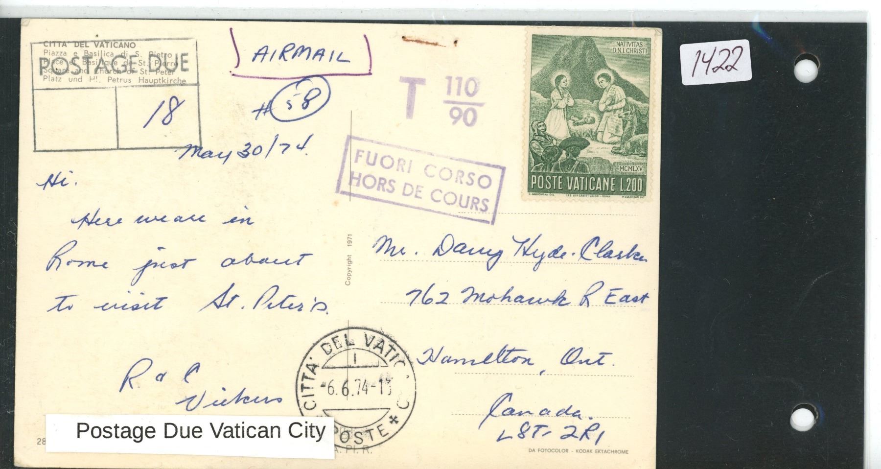 Postage Due Vatican City Post Card