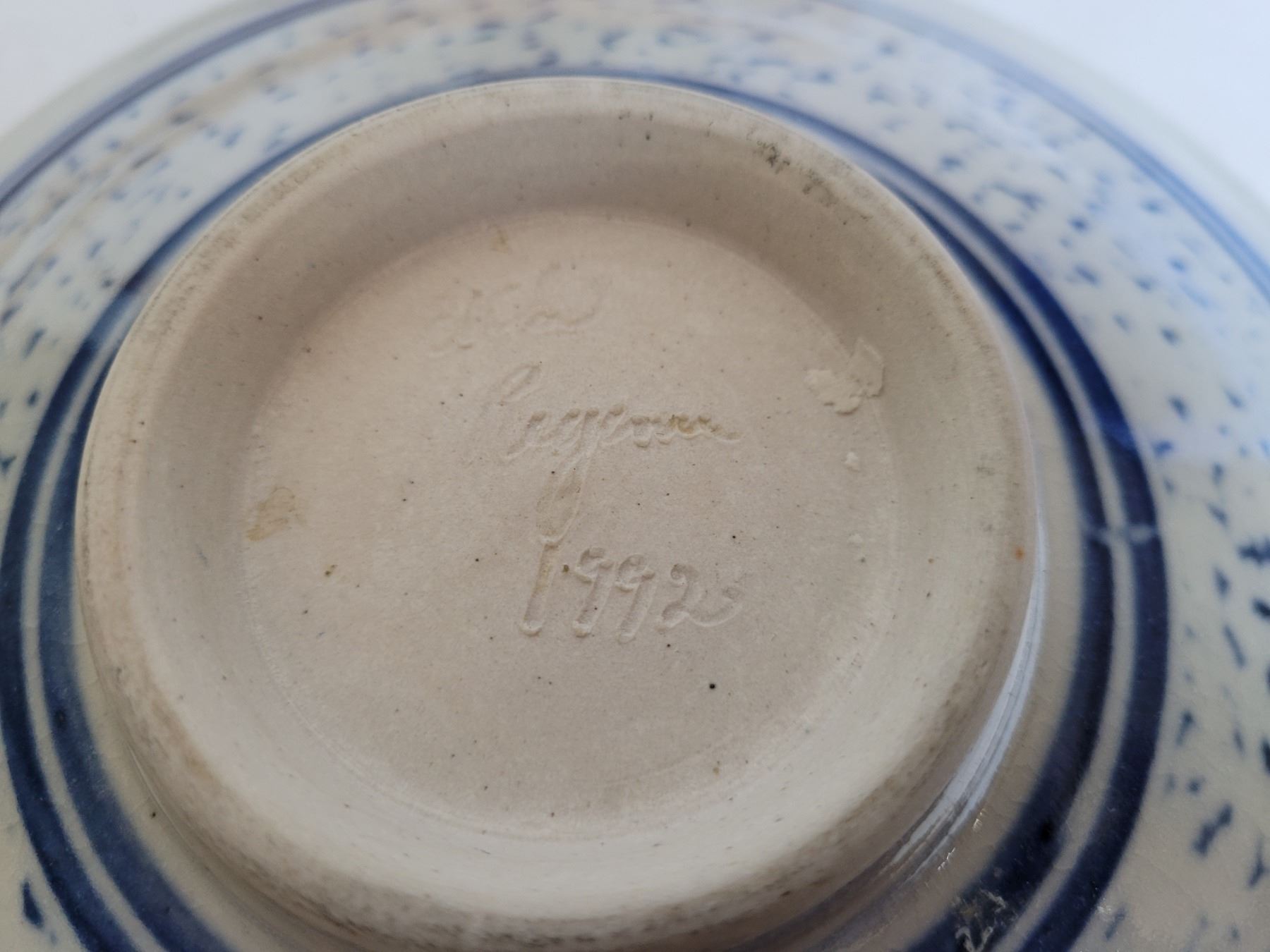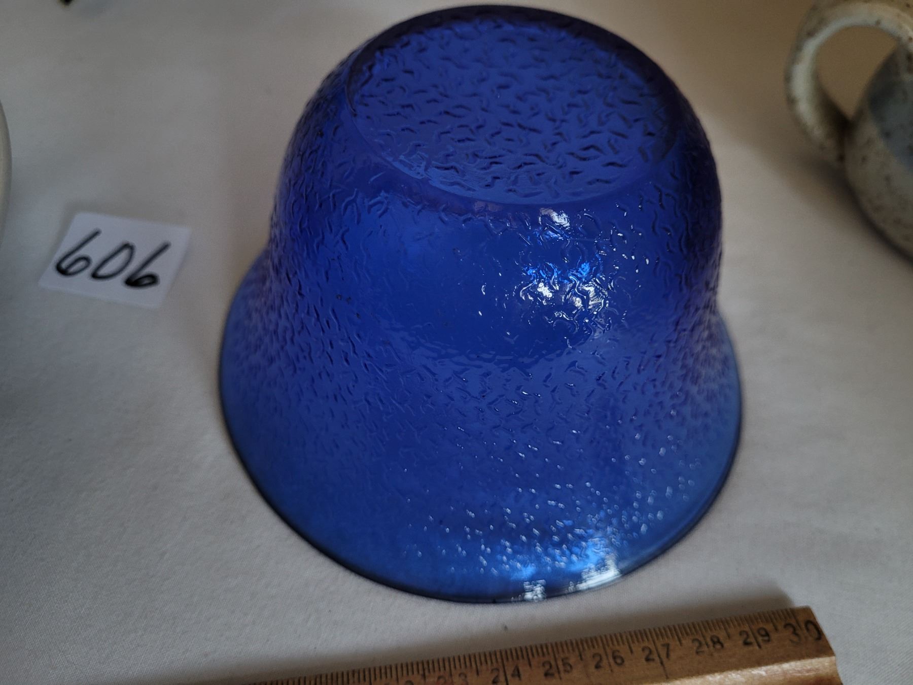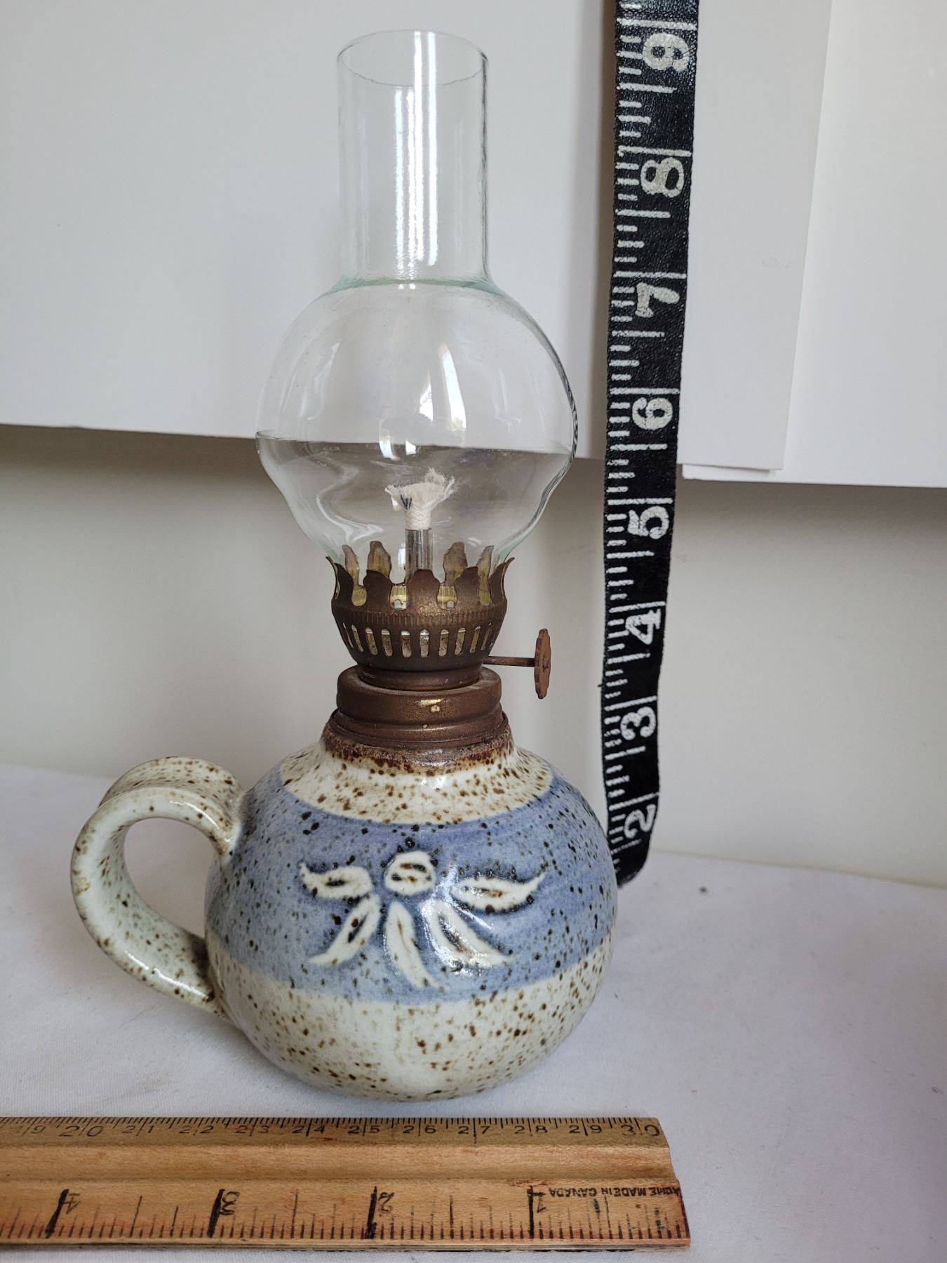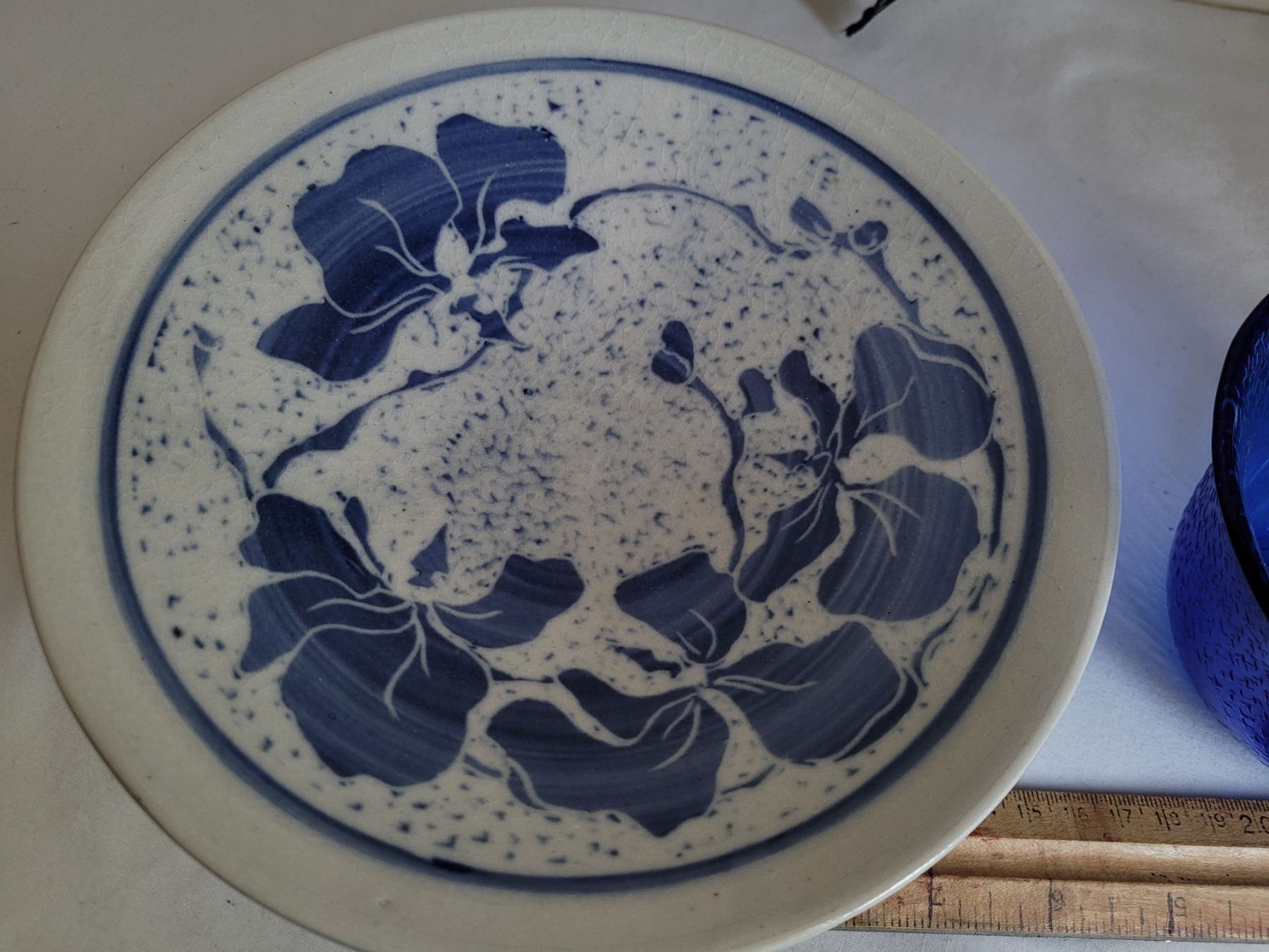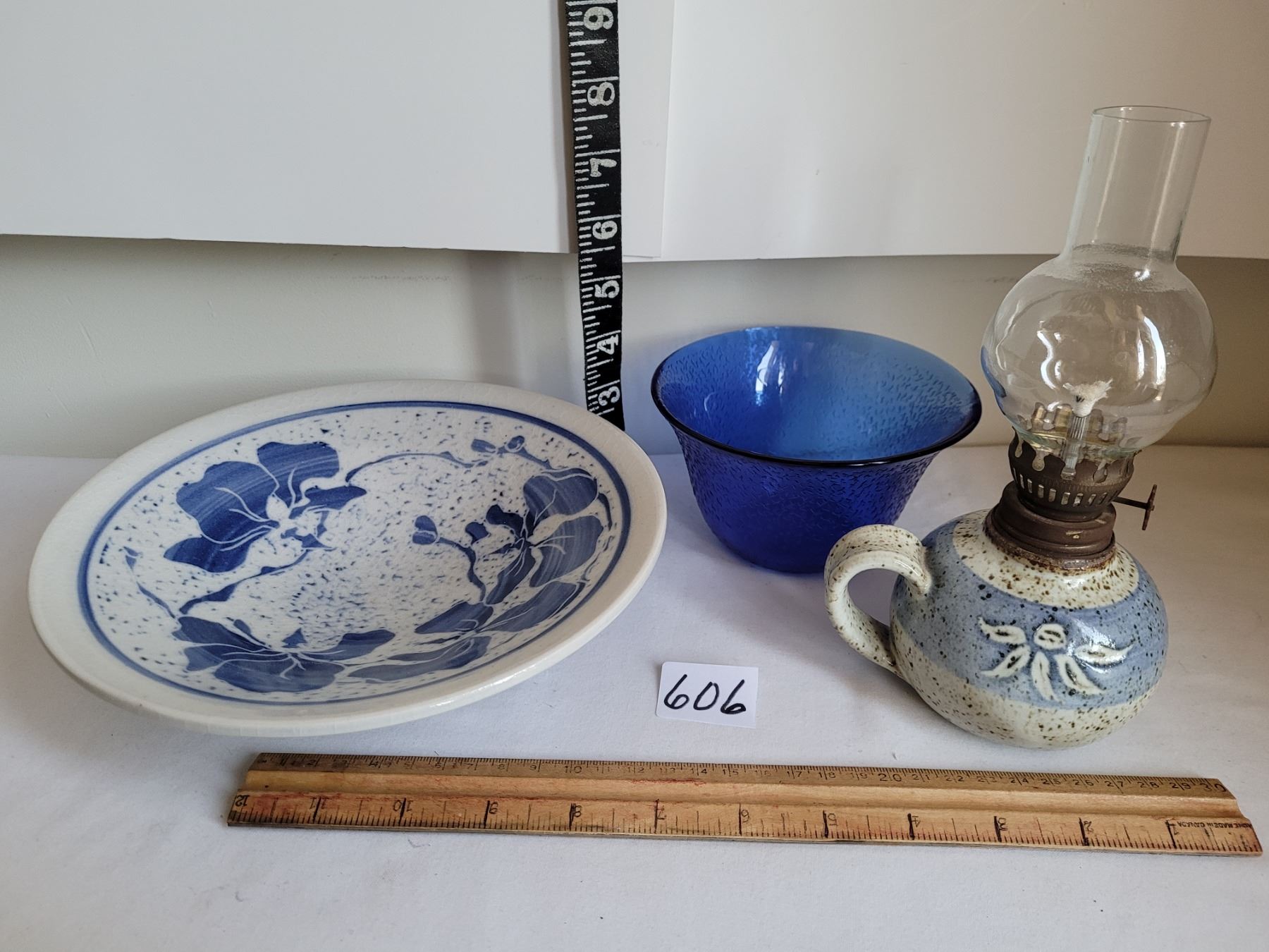 Pottery bowl & small oil lamp with nice cobalt blue bowl.