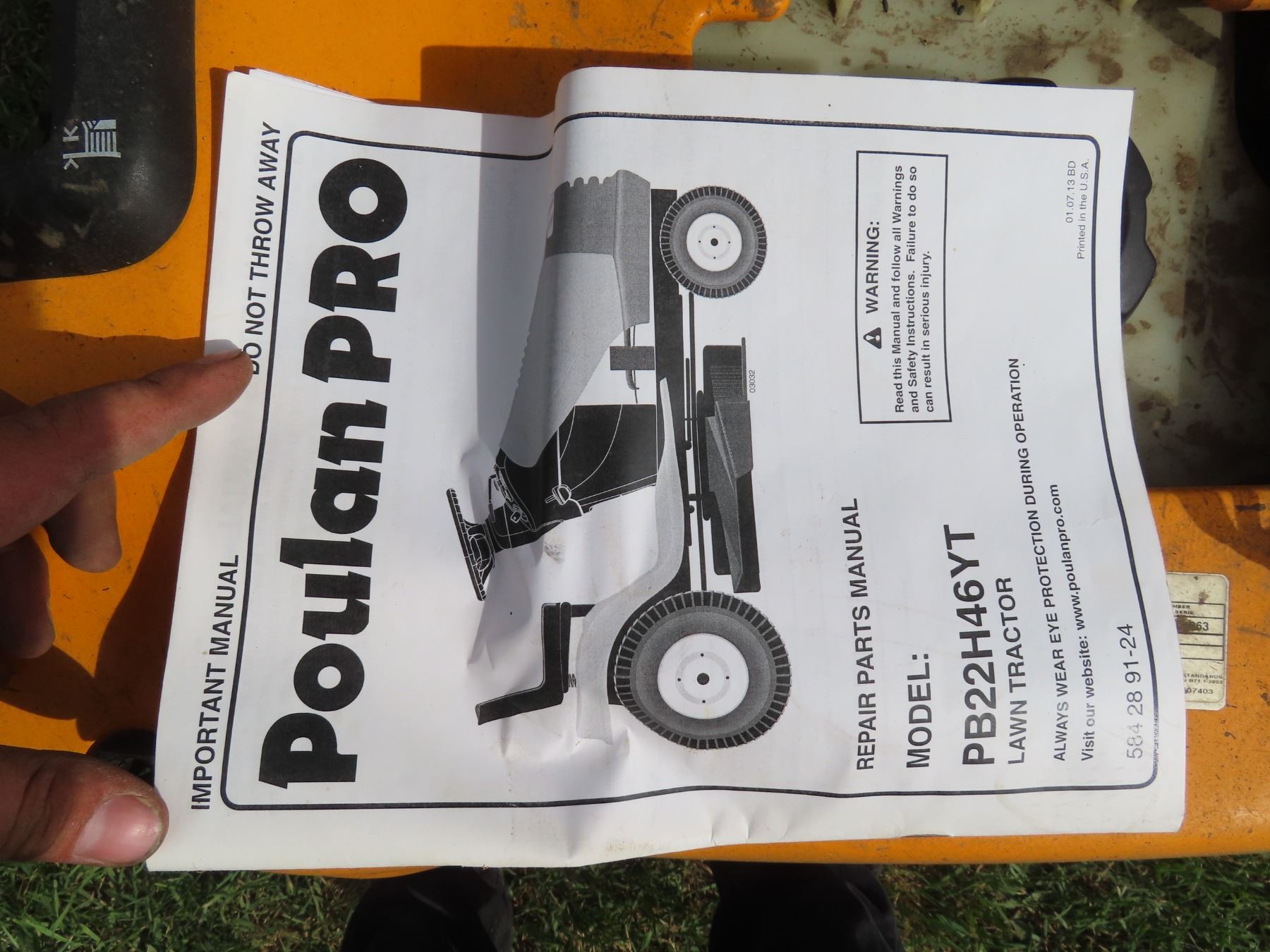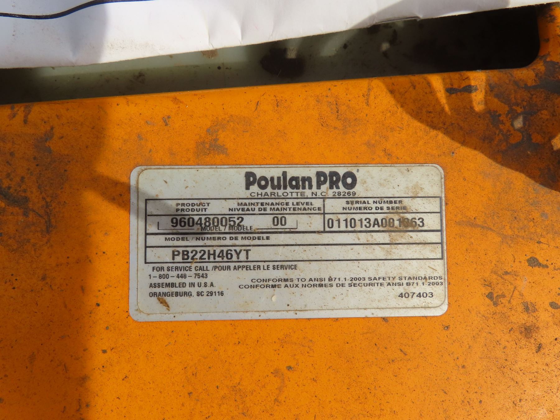 Poulan Pro 22HP Lawn Mower - 46" Deck, (326.1hrs) - runs, need cable that engages mower replaced.