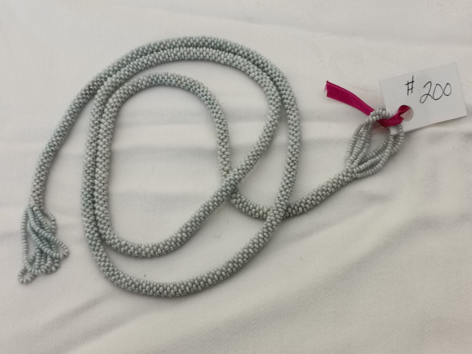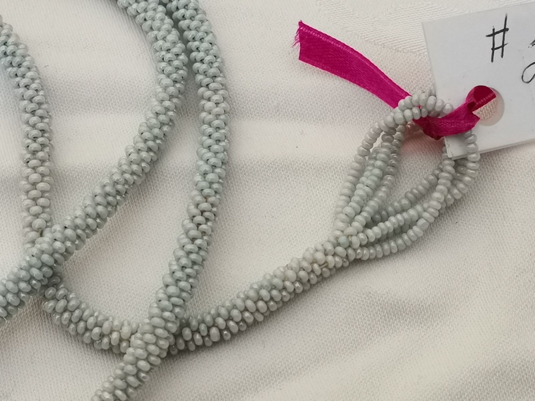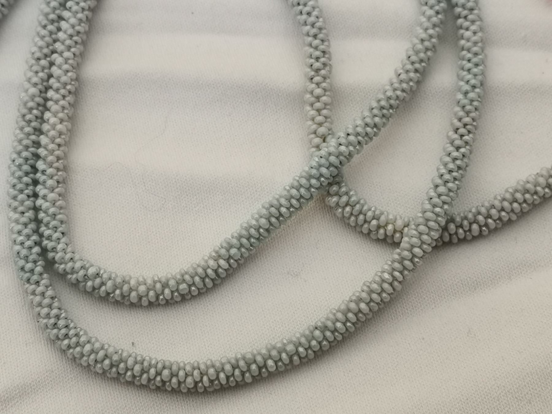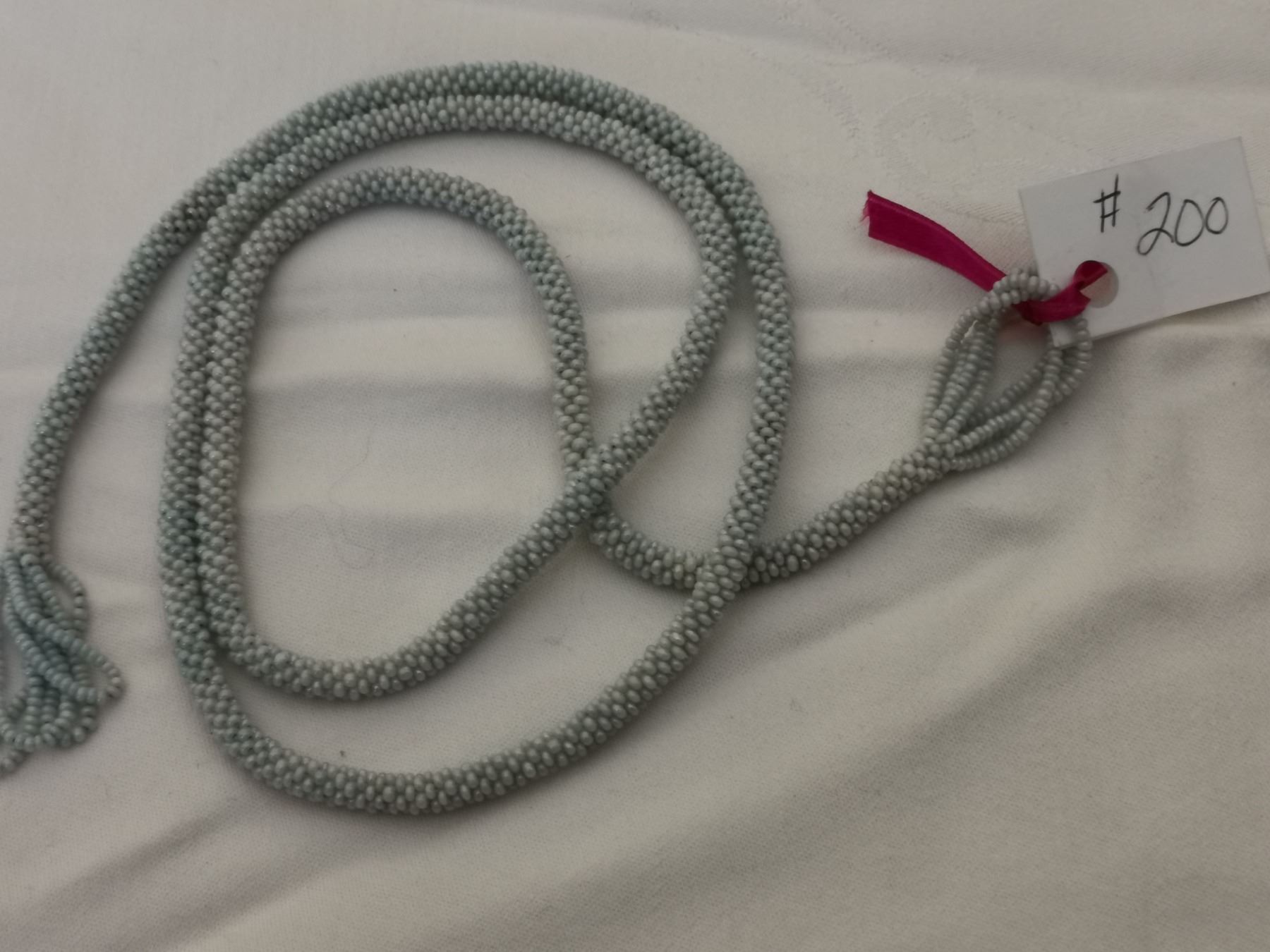 Powder blue beaded flapper necklace, 42”, 1920’s