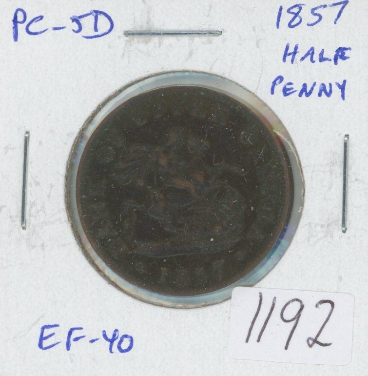 Pre-Confederation Token. Province of Canada. 1857 Bank of Upper Canada Half Penny Token. St. George slaying a dragon. PC-5D. EF-40. Nice.