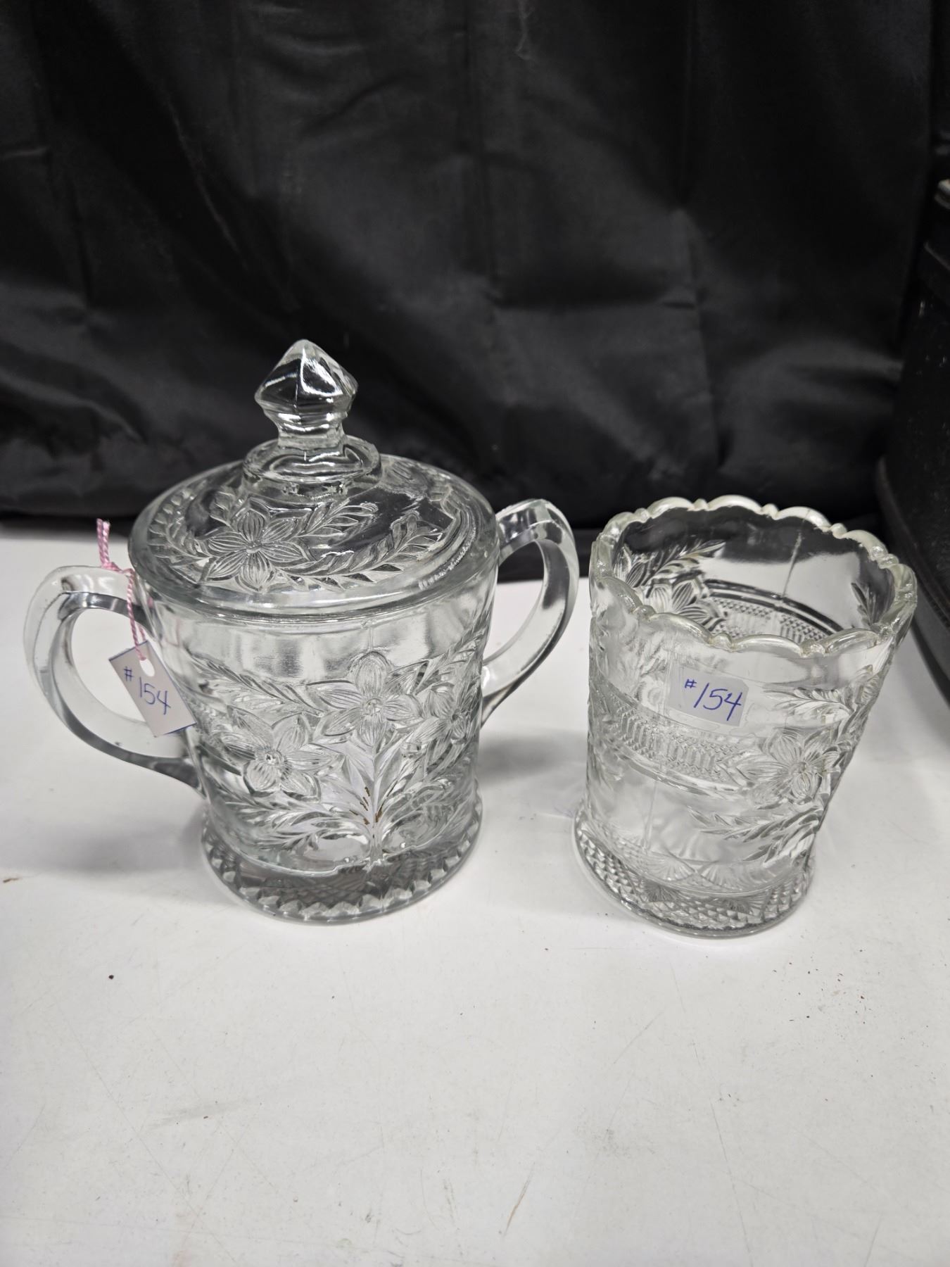 Pressed glass sugar with lid/spooner, Narcissus spray, Indiana glass, USA 1915-30