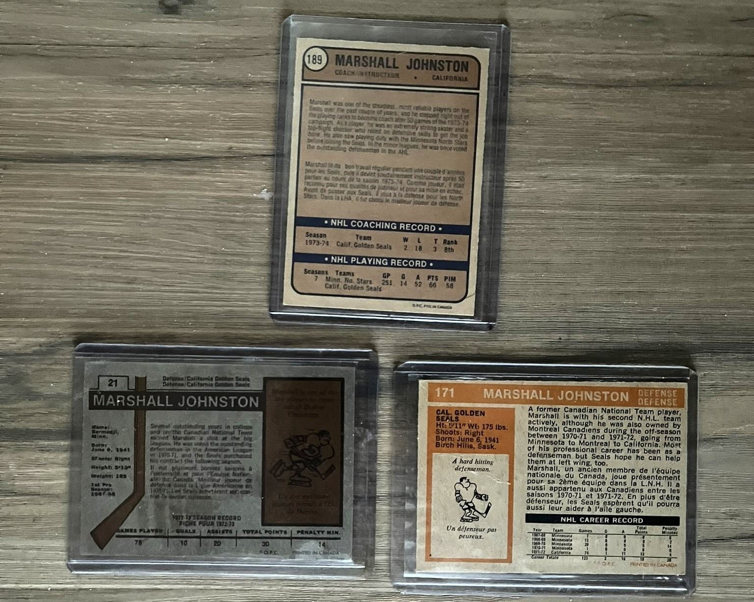 Pride of Birch Hills! Lot of 3 Marshall Johnston hockey cards. 1972 1973 1974. O Pee Chee (OPC).