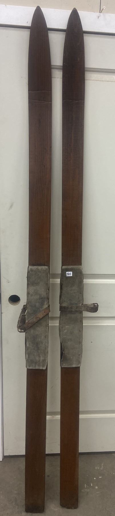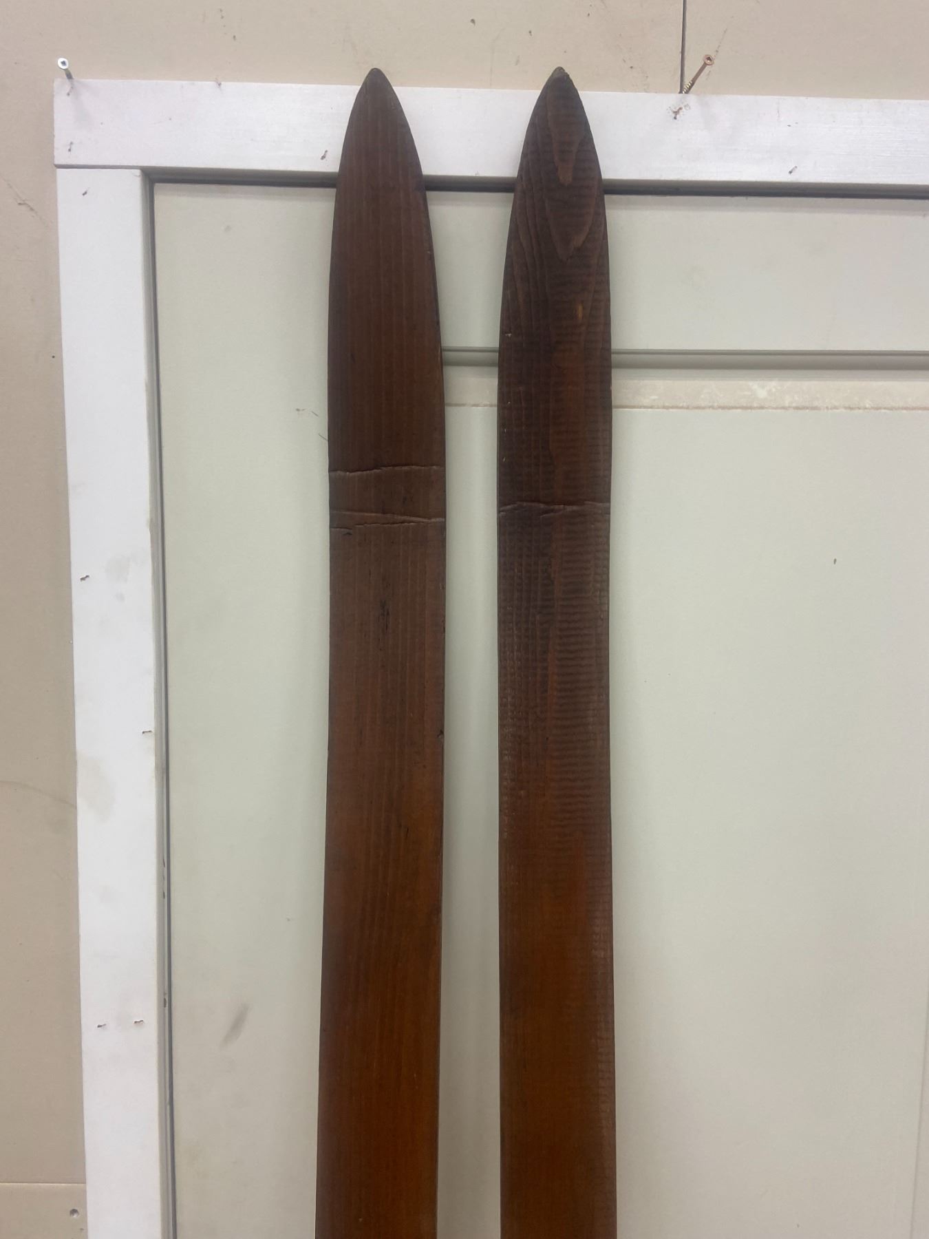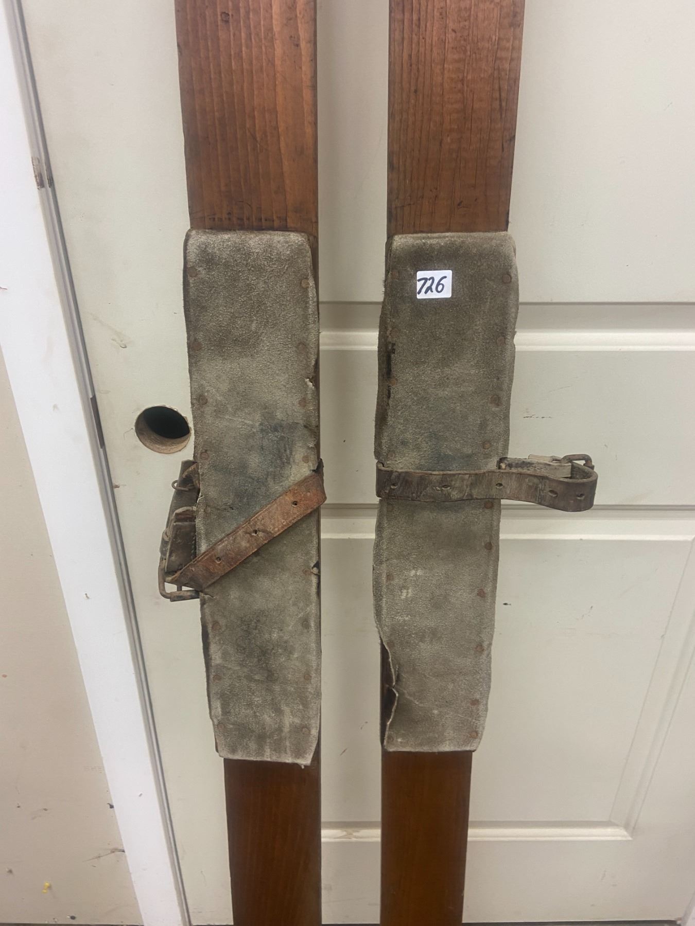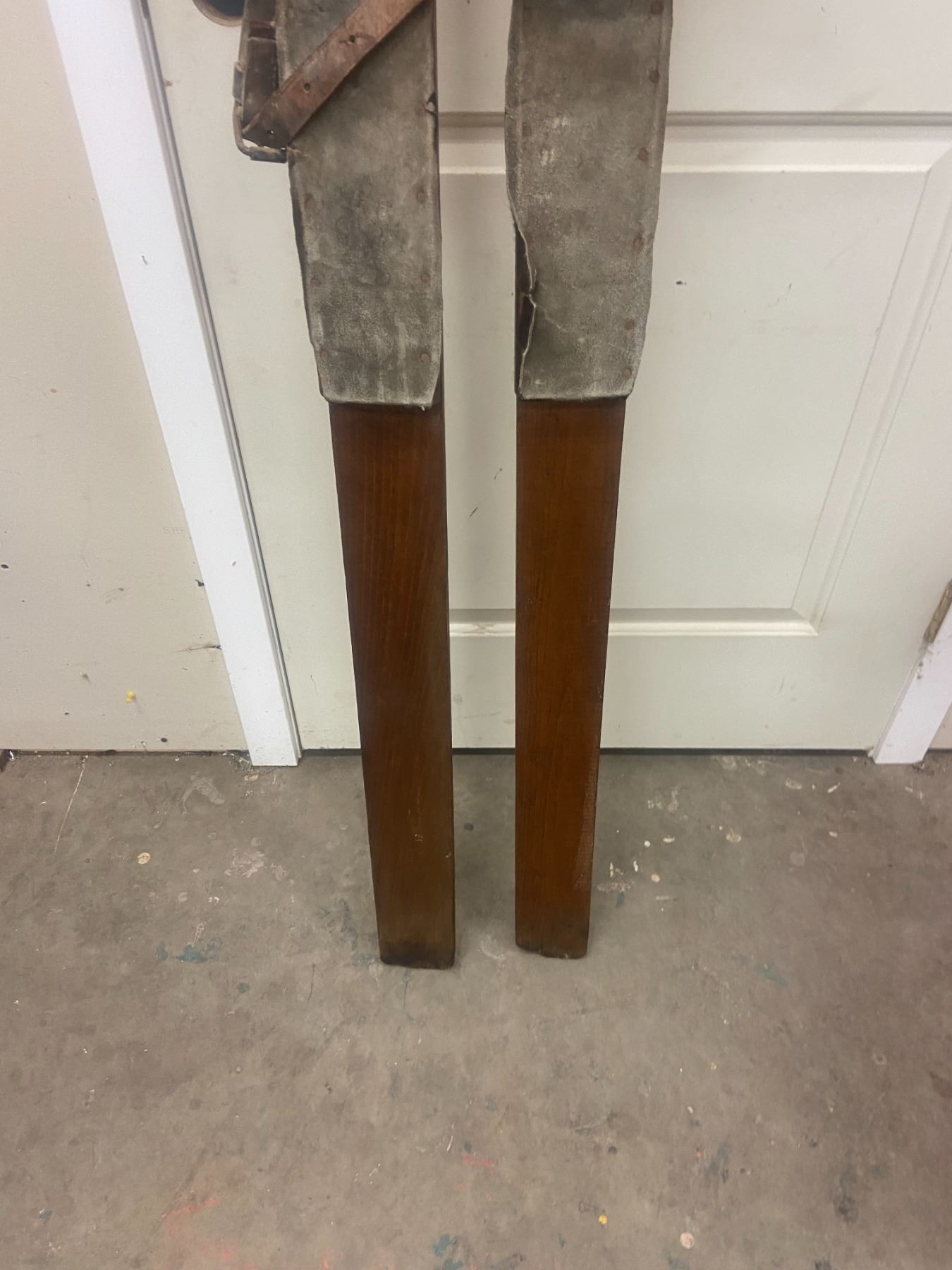 Primitive wooden skiis - From old hunters cabin - leather staps - 84" long x 3 1/2"W