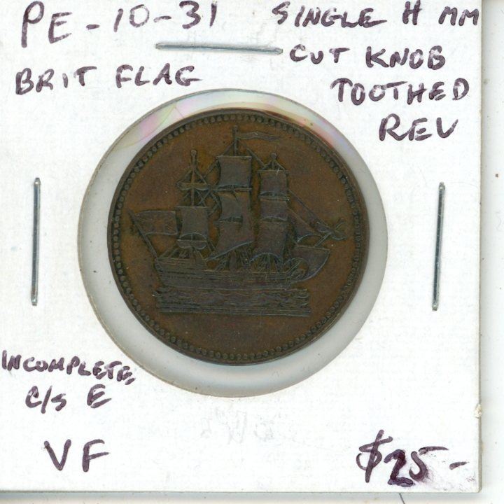 Prince Edward Island Token. British Flag, Single H mint mark, Cut Knob, Toothed Reverse with incomplete C/S E. PE-10-31. A scarce Pre-Confederation Token. VF.
